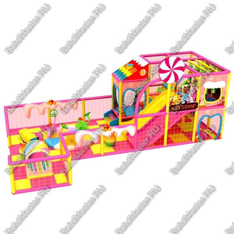 Лабиринт выполнен в тематике сладостей: сахарные арки, карамельные горки, мороженое и леденцы украшают конструкцию, создавая атмосферу сказочного мира. Яркие цвета привлекают внимание детей, делая игровую зону еще более привлекательной.