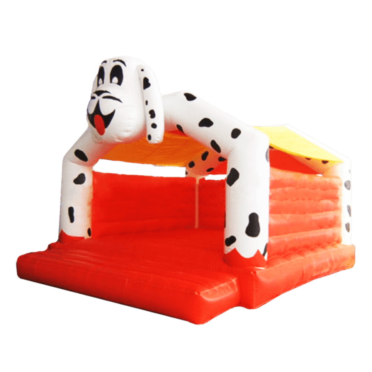 Данная модель представляет собой закрытый батут - крыша выполнена в виде фигурки далматинца с большой веселой мордочкой и спущенными вниз лапами – таким способом оформлены два передних надувных столба. Между крышей и боковыми бортами имеются продольные отверстия, благодаря чему аттракцион проветривается, но внутрь не задувается мусор, и не попадают капли дождя.