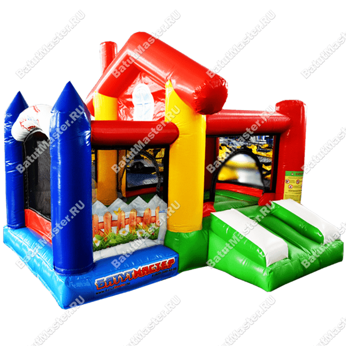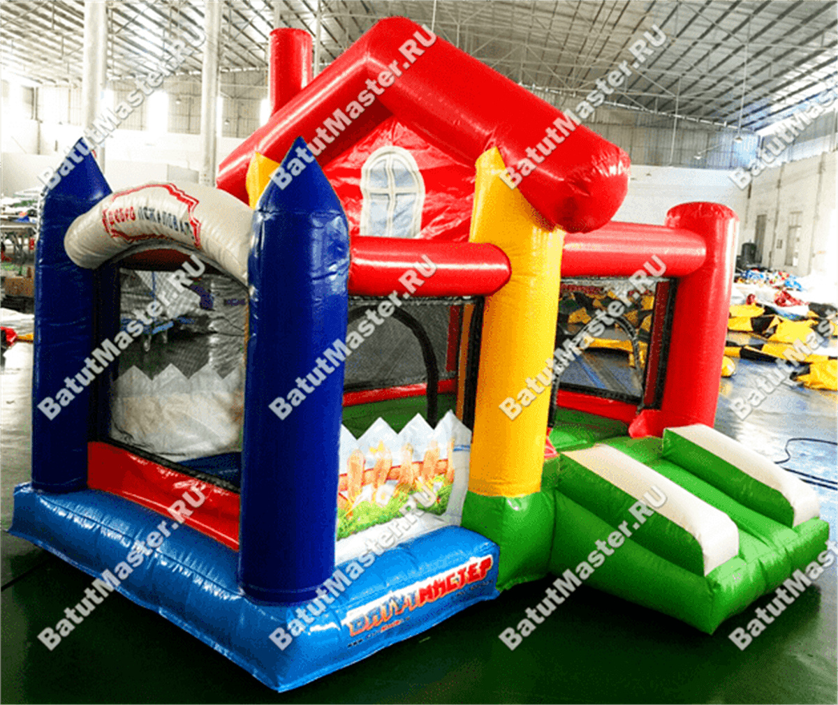 Отличный уютный надувной домик родом из деревни отлично идеально подойдет для детских забав, игр и приключений внутри него. Созданный из трех активных площадок он станет настоящим веселым городком для детства Ваших детей, а владельцу принесет стабильную прибыль, позволит парку аттракционов быть более разнообразным.