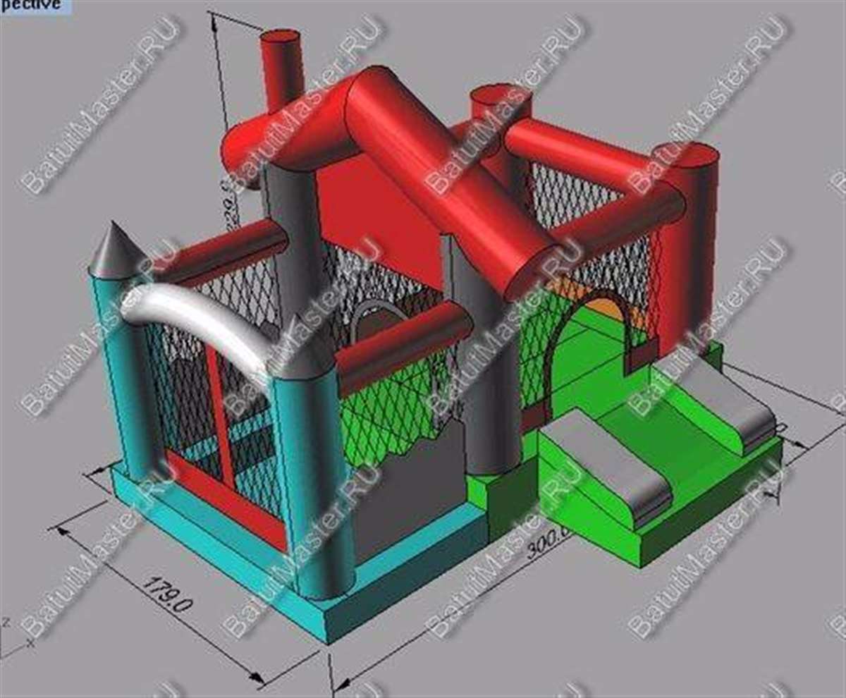 Горка в зелено-белом цвете с небольшими бортами и невысоким спуском подойдет для самых маленьких крох. Не имея подушки безопасности, она наделена небольшим продолжением вперед, дабы ребенок не приземлялся сразу на землю. Сам дом – основная часть батута из красных арок в форме скатов крыши, причудливого окошка на одной стороне и серых высоких колонн на каждой стене, будто из камня.