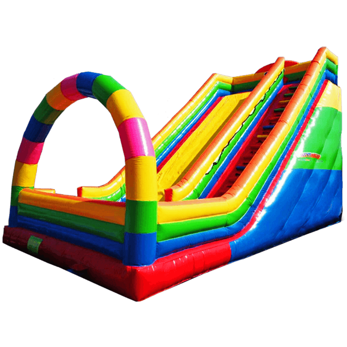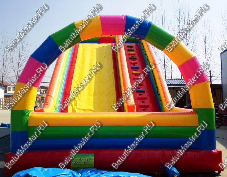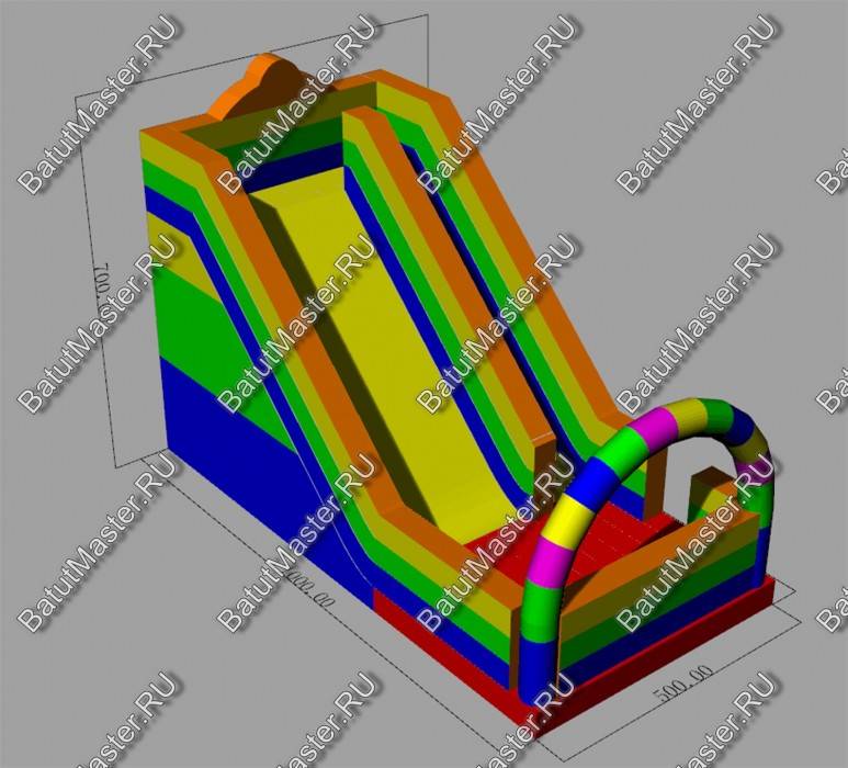 Внешняя сторона поделена на 3 части, то есть на 3 горизонтальные полосы – синюю, зеленую и желтую. Основание выполнено в красном цвете. Сам спуск устлан белой простыней ПВХ для более быстрого и лучшего скольжения. Борта горки достаточно высокие и состоят из трех разноцветных надувных бревен – синего, зеленого и желтого, снизу вверх, а самое верхнее имеет красную внешнюю окраску. Хорошая высота говорит о том, что безопасностьаттракциона остается на высоте и с этой горки могут спуститься даже самые маленькие.