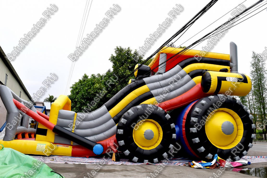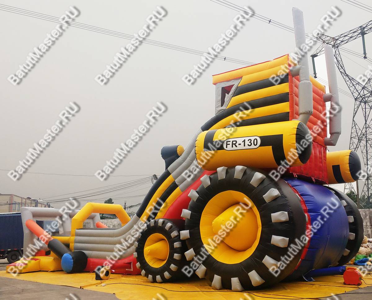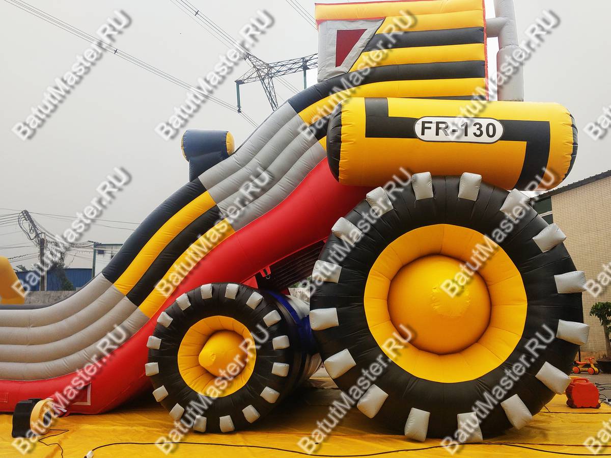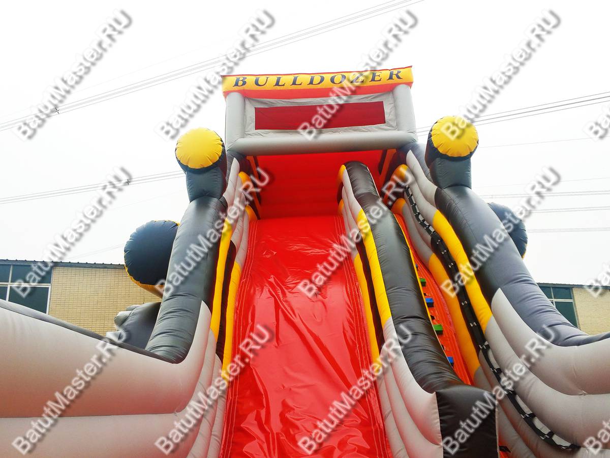 Оригинальная надувная горка «Бульдозер» выполнена в виде настоящей строительной машины. Это прекрасный батут для бизнеса, поскольку он имеет целых две спусковых полосы и оформлен в ярких красках.