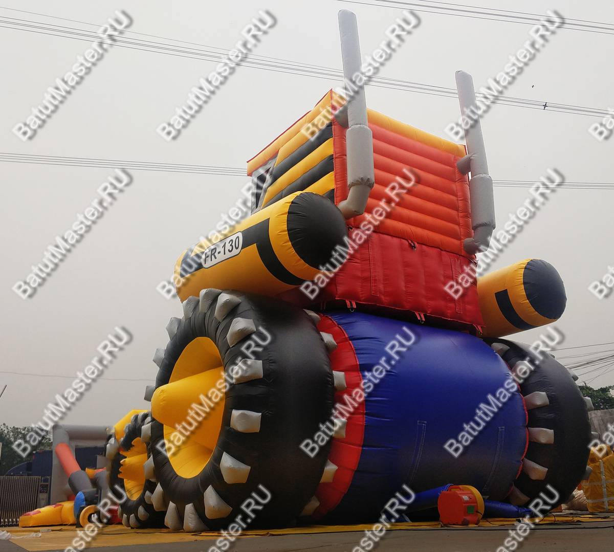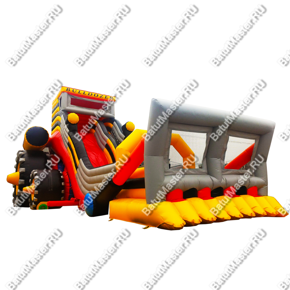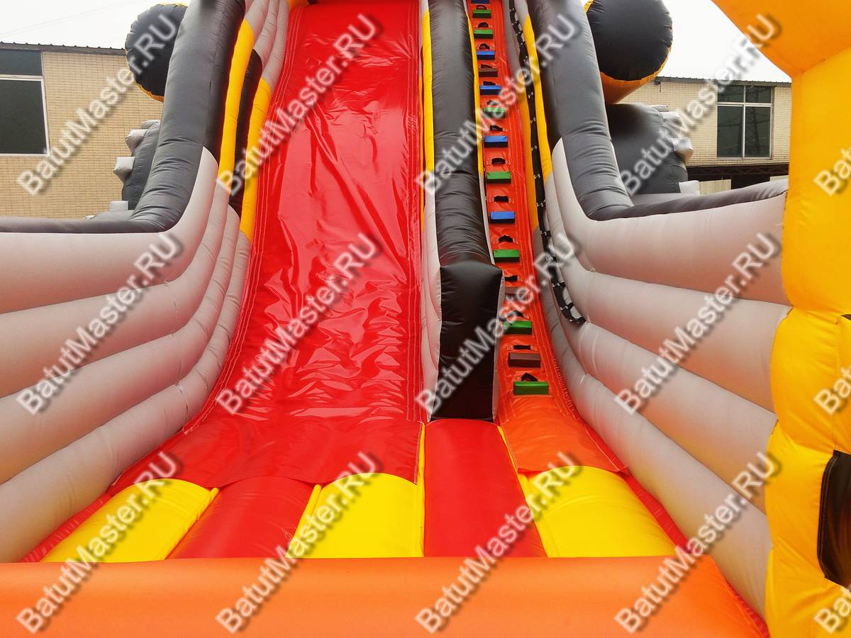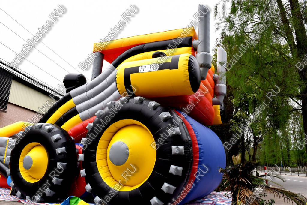 Оригинальная надувная горка «Бульдозер» выполнена в виде настоящей строительной машины. Это прекрасный батут для бизнеса, поскольку он имеет целых две спусковых полосы и оформлен в ярких красках.
