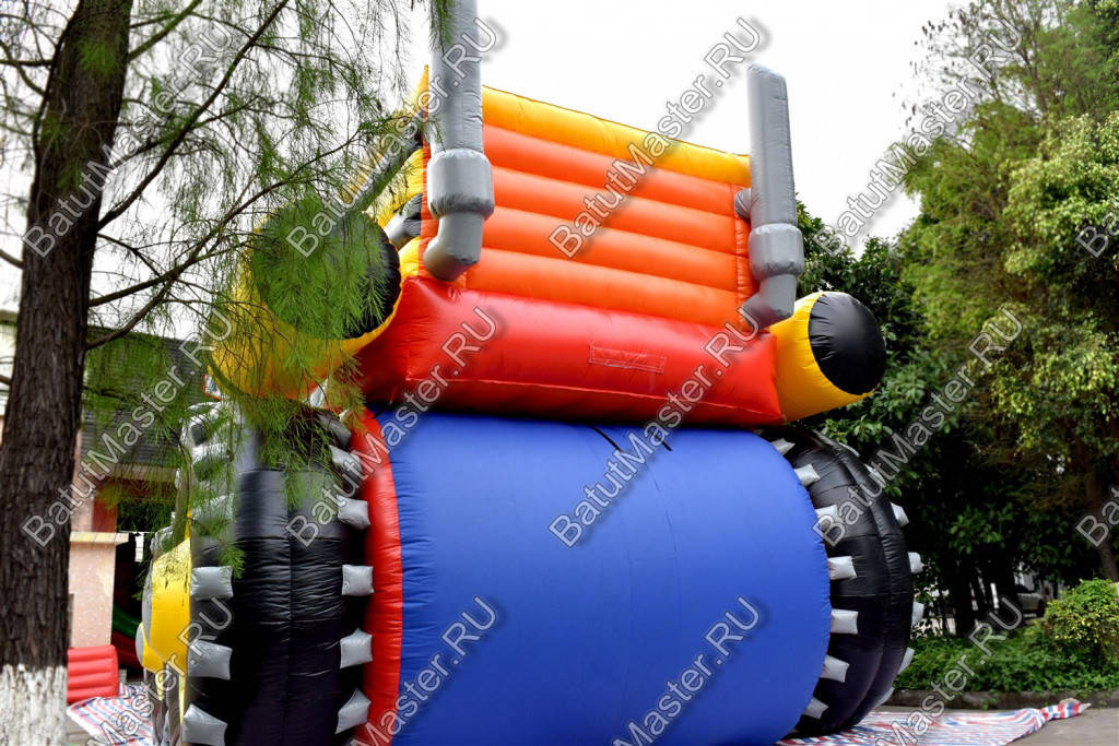 Надувной батут «Бульдозер» с размерами основания 18 на 8 м и высотой всего комплекса 10 м отлично имитирует образец настоящей дорожной техники - бульдозера. Форма транспорта изготовлена в виде высокой горки и просторной площадки, на которой можно попрыгать и поразвлекаться. Самая высокая часть коммерческого аттракциона (стартовая площадка высотой 6 м) представлена в виде кабины автомобиля. Реальности батуту придают мелкие элементы, например, выхлопная труба расположенная справа от кабины.