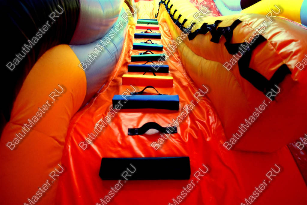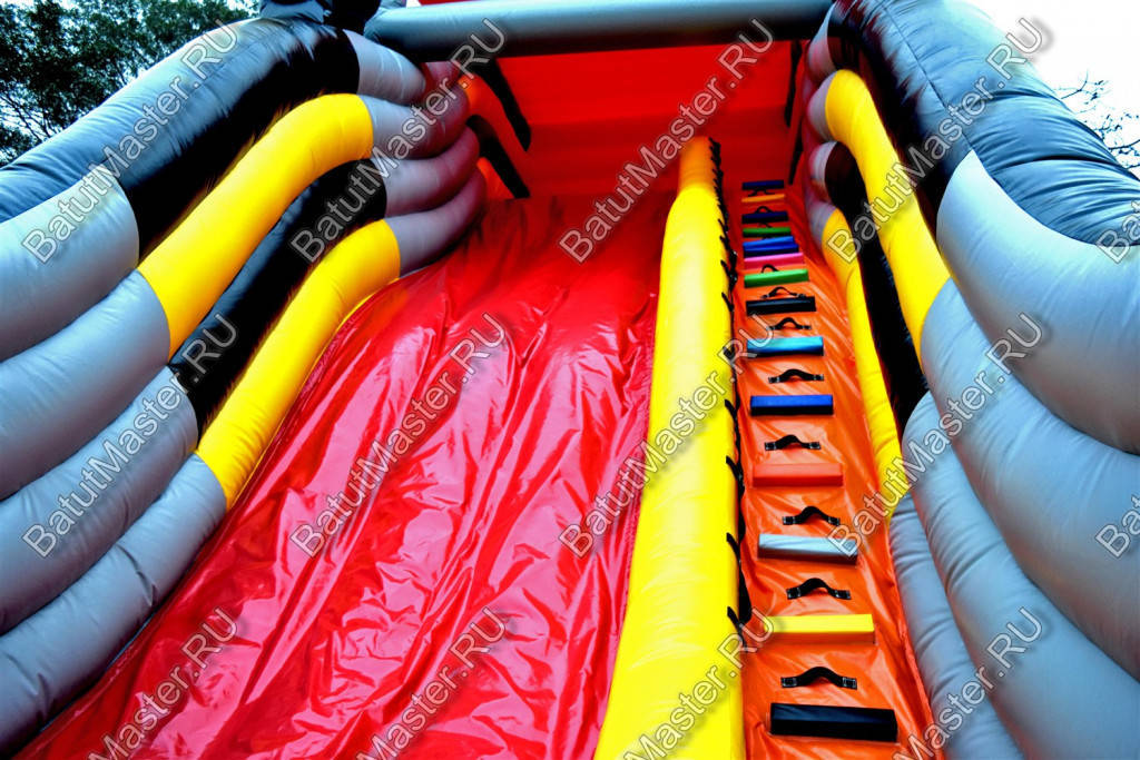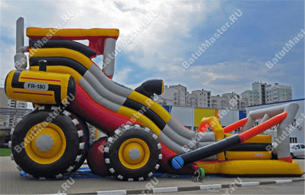Чтобы попасть внутрь батута для бизнеса, необходимо пройти через проем между фасадом в виде ковша и боковыми стенками горки. Взобраться на верх горки можно по лестнице, установленной в левой части полотна, оборудованной мягкими поручнями. Поднявшись в кабину бульдозера, дети оказываются на стартовой площадке, с которой можно спуститься вниз. Кабина бульдозера закрыта со всех сторон, в том числе и сверху, а передняя стена выполнена из прозрачной пленки. Такой же пленкой оборудован и ковш бульдозера, который ограничивает детей при спуске вниз и считается началом площадки. Под горкой установлено 2 надувных цилиндра, представленные с внешних сторон огромными парами надувных покрышек для спецтехники.