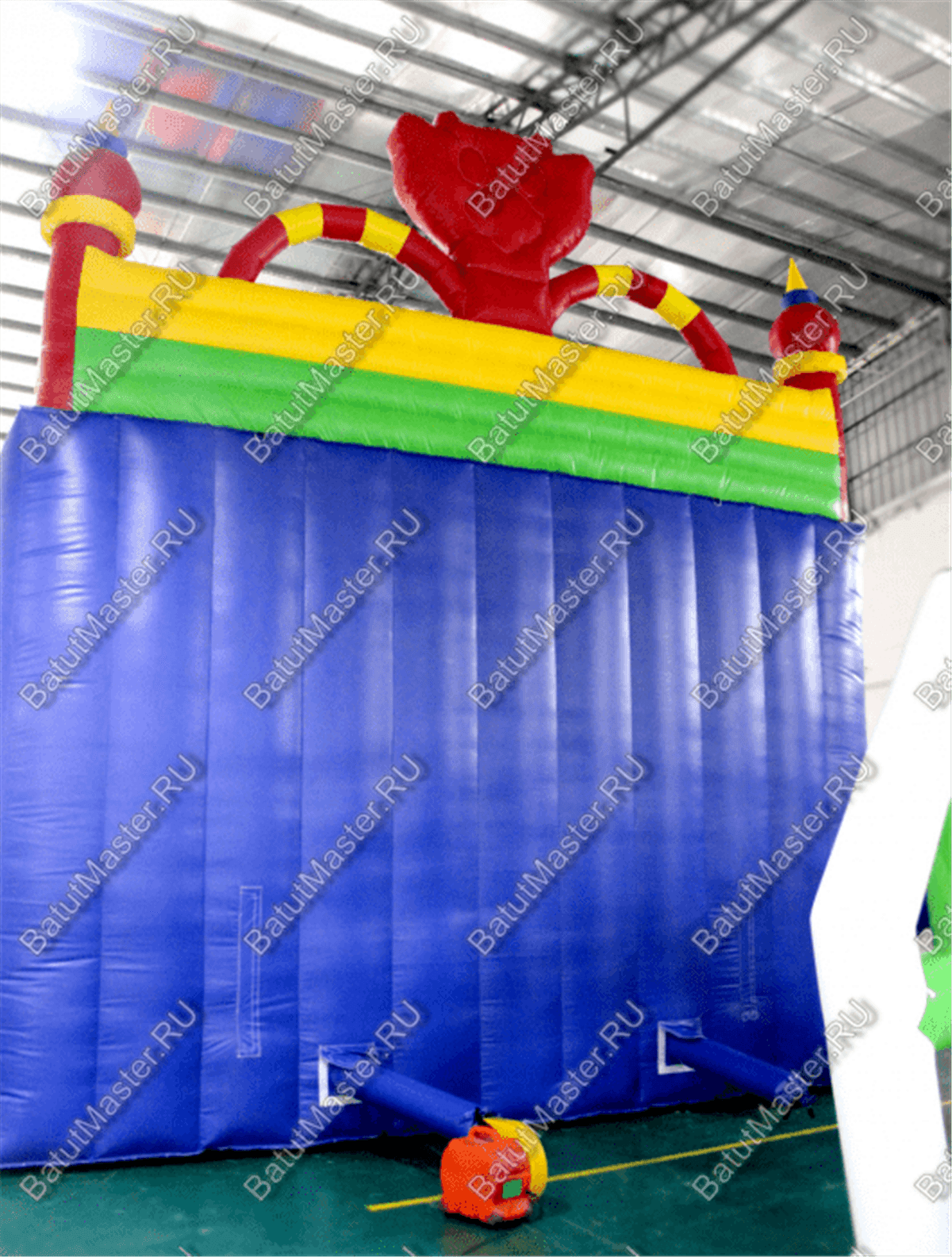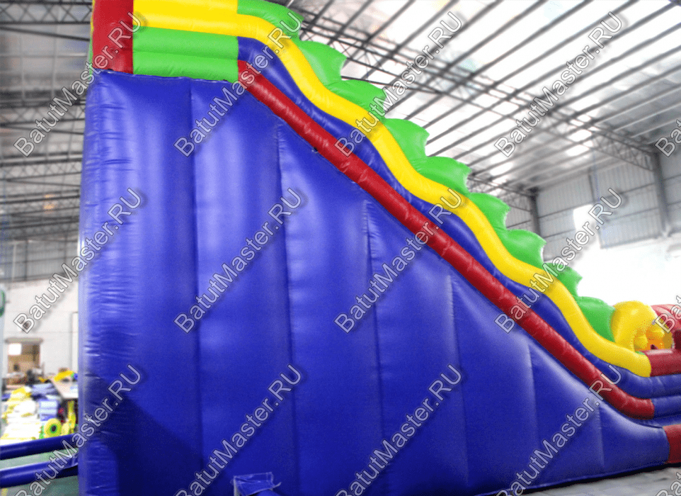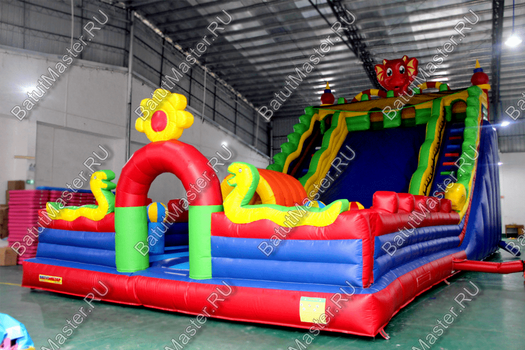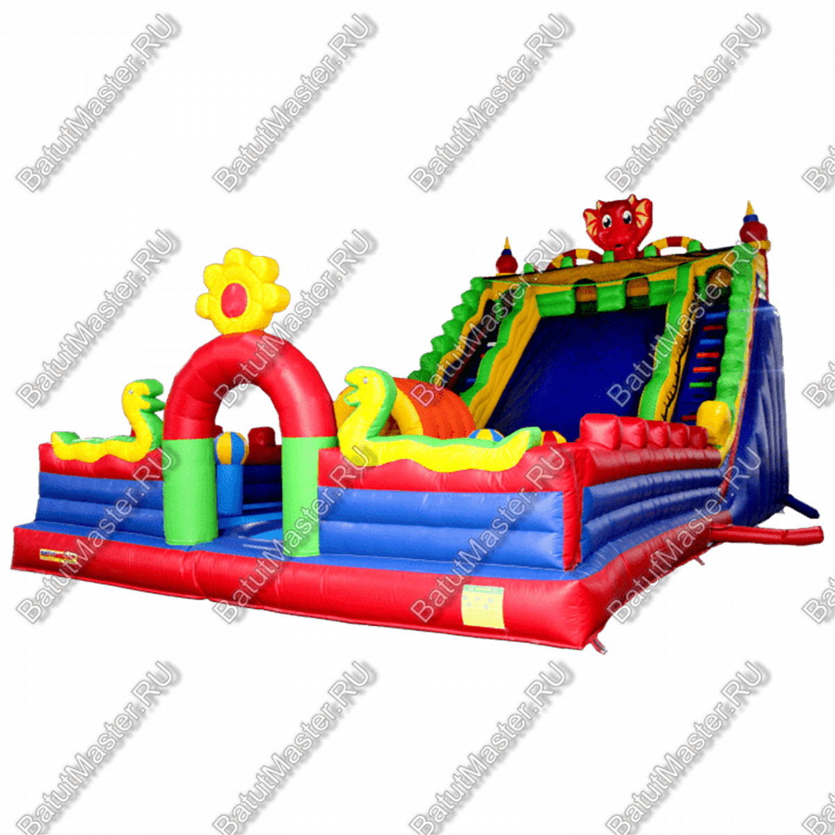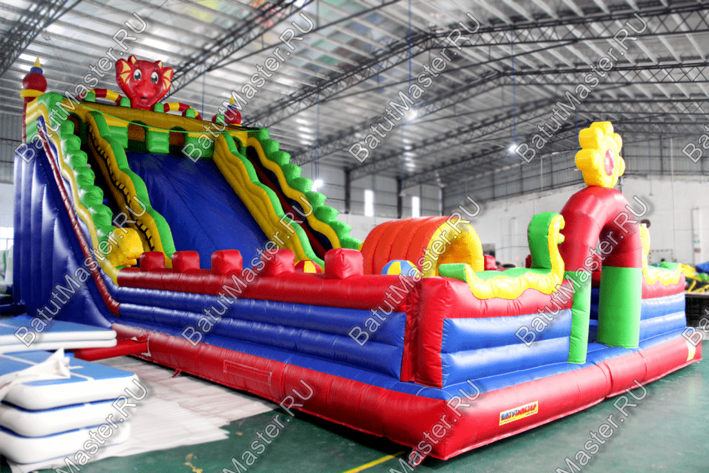 Этот батут с площадью нижнего основания в 72 м² на самом деле гораздо вместительней, ведь его задняя стенка представляет широкое полотно синего спуска, по бокам которого проходят яркие разноцветные лестницы. Стартовая площадка горки – увлекательный закрытый тоннель с четырьмя арками: 2 по центру для спуска с горки и по одной для входа с лестницы. Главный персонаж этого коммерческого аттракциона находится как раз над этим тоннелем – это надувная фигура милого драконьчика, сшитого из красного и желтого ПВХ.