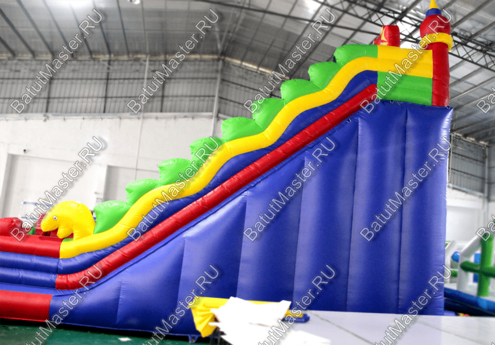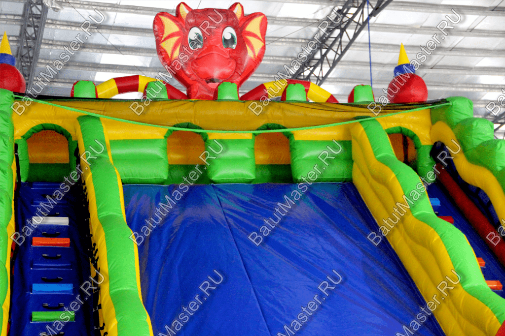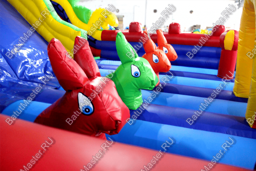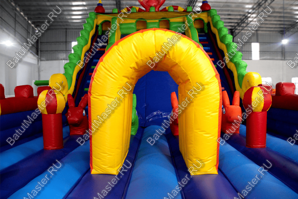 Универсальный красочный игровой комплекс с отдельными зонами для детей разных возрастов. Красивый и яркий батут с зоной для игр с разными персонажами: зайчики, коты, драконы и высокой горкой для спуска. Скатившись с горки можно пролезть в туннель, и снова попрыгать. Надувной батут изготавлен с применением современных технологий и материалов, поэтому устойчив к воздействиям окружающей среды, а цвета долго останутся яркими.