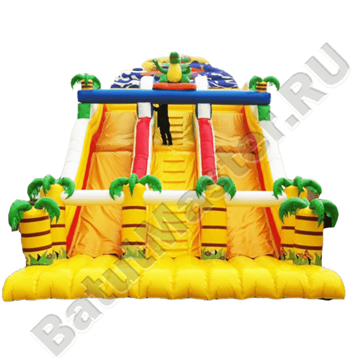 Чем выше и круче горка, тем на ней интересней скользить. И эта конструкция полностью отвечает такому правилу. Начиная с бананового рая в виде множества колонн-пальм, ребенок начнет проделывать дорогу вверх по удобной лестнице. С двух сторон от которой размещаются мягкие надувные бортики. Можно сказать, что сама вертикальная площадь поделена на 3 равные части. Центральная часть – это лестница, подъем, а боковые – спуск, сама горка. Поперек горы 2 раза проходят поперечные мягкие планки, они позволяют находиться батуту в более устойчивом состоянии, так как высокий подъем вносит свои коррективы. На самом верху воцарилась лягушка, прямо над лестницей, ведь она же и есть настоящий символ любых прыжков.