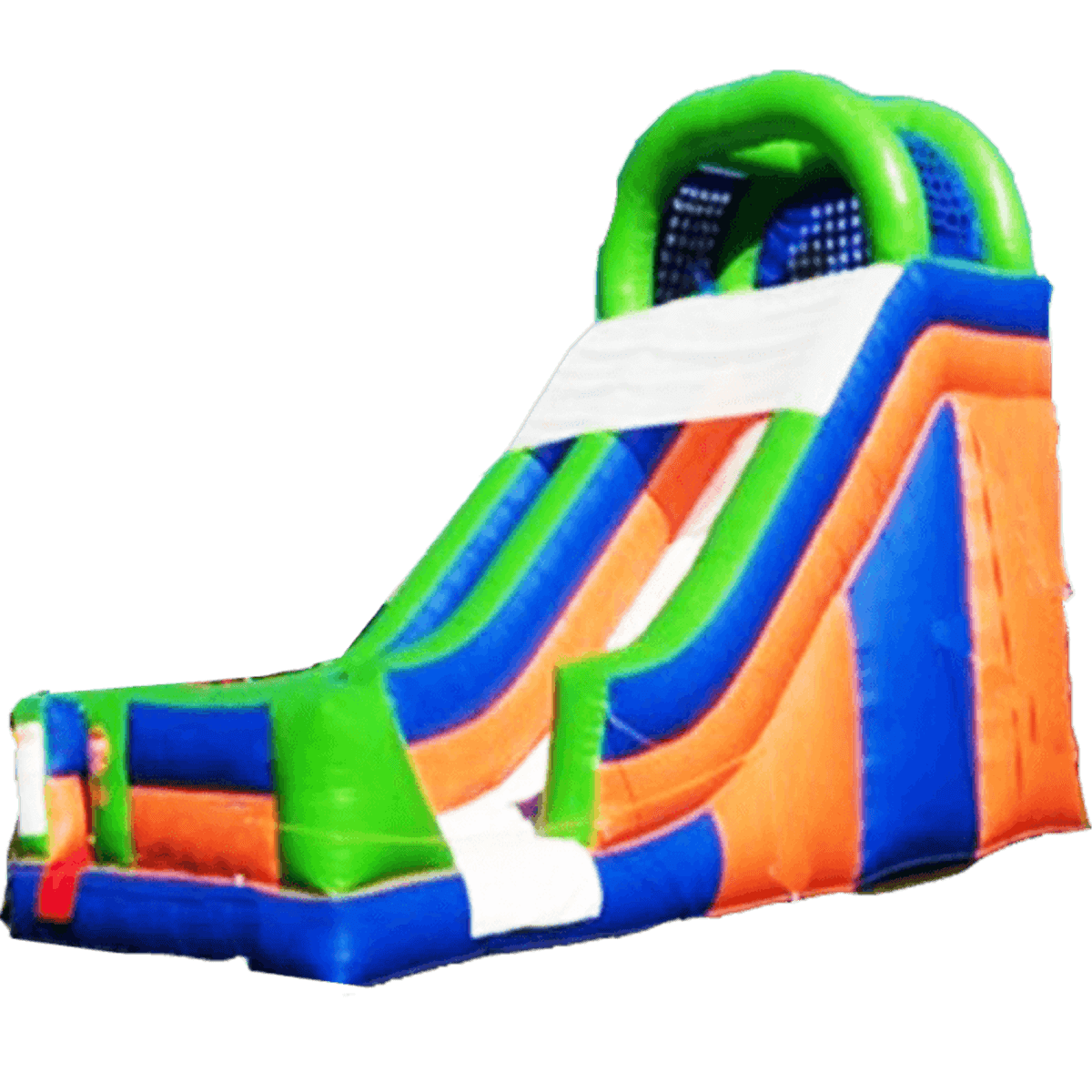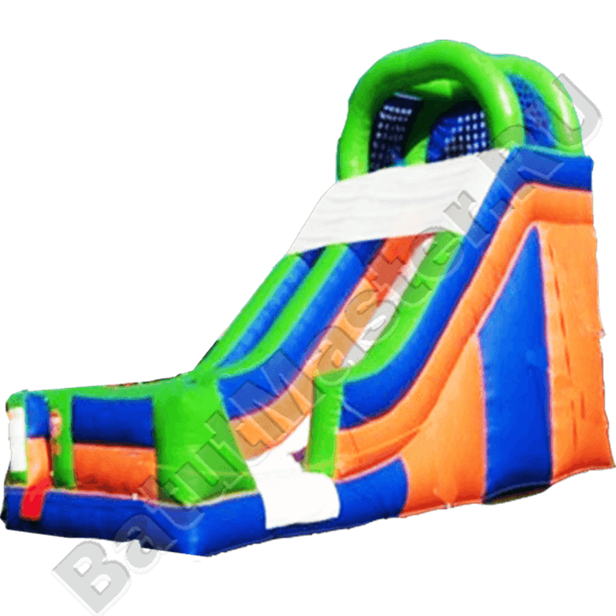 Насыщенная различными цветами высокая горка сделана из двух отсеков: более узкий отведен для подъема, а широкая часть – это и есть непосредственно сам скат. Поверхность основания у горки белая, но все остальное просто пестрит своим разнообразием цветов. Такую конструкцию действительно можно отождествлять с летней красочной лужайкой и вряд ли кто сможет пройти мимо. На самом верху перед спуском создана великолепная защита от солнца в виде зеленых мягких арок и синей сетки, натянутой между ними.