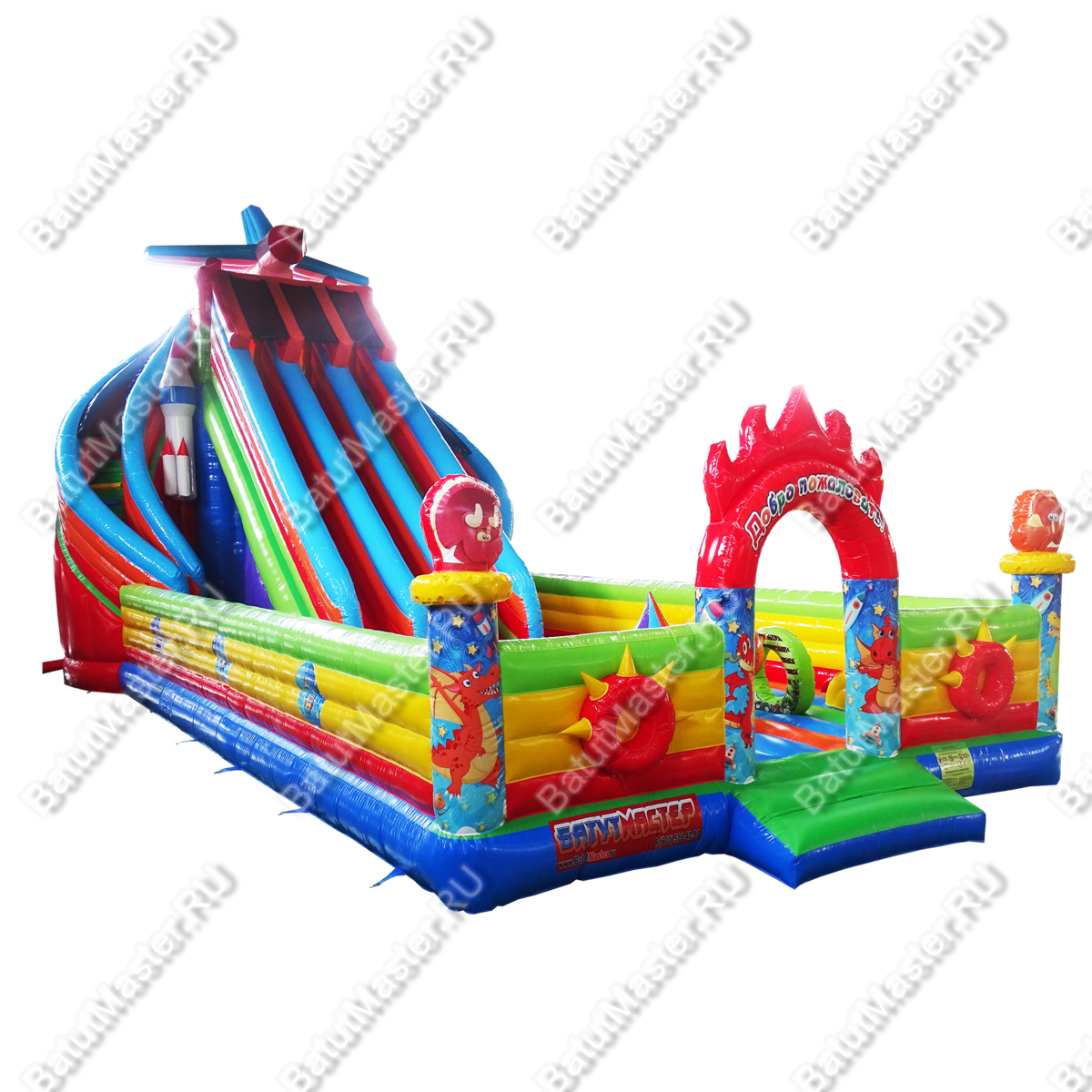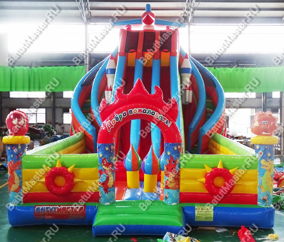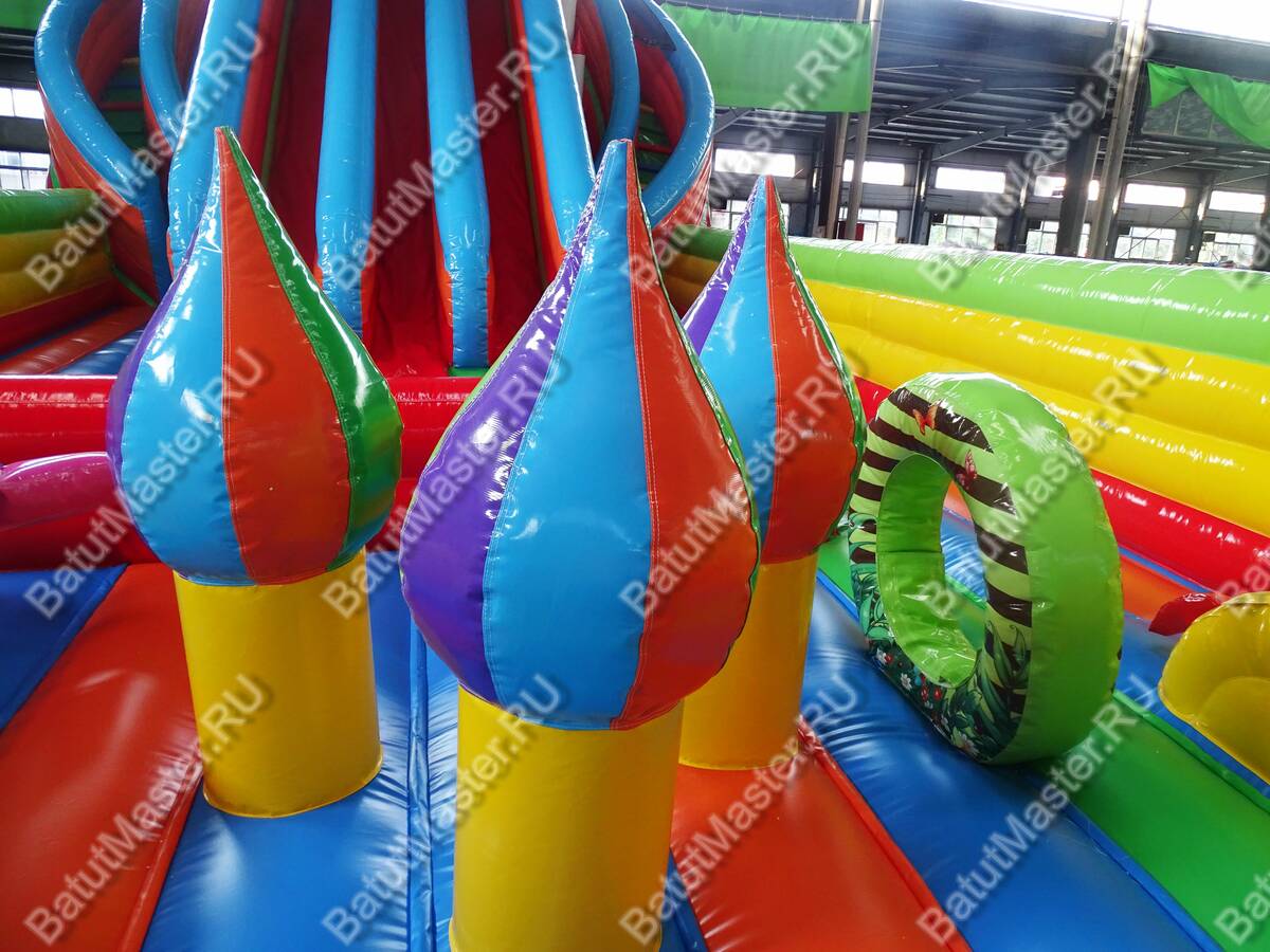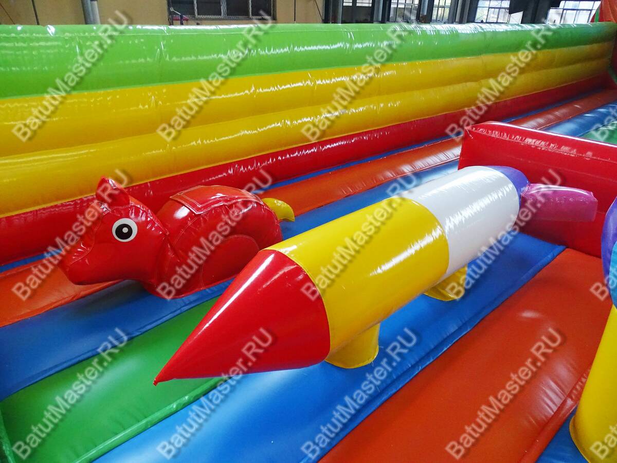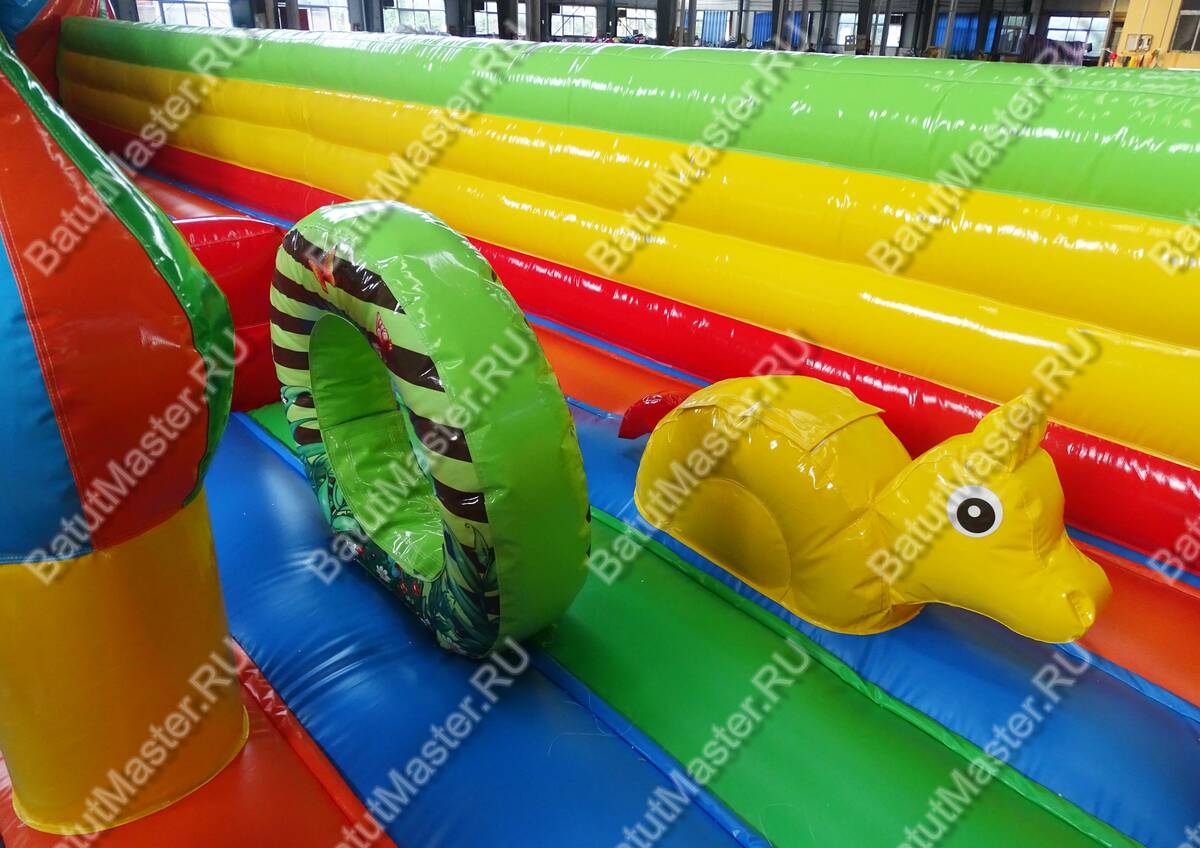 Помимо декоративных фигур, батут имеет и игровые, с которыми ребёнок может поиграть уже внутри. Главным достоинством батута является высокая крутая горка, разделённая на три части. На горку можно взобраться по двум изогнутым лестницам. Под горкой есть очень много места для активных игр, ну, и, конечно, высоких прыжков.