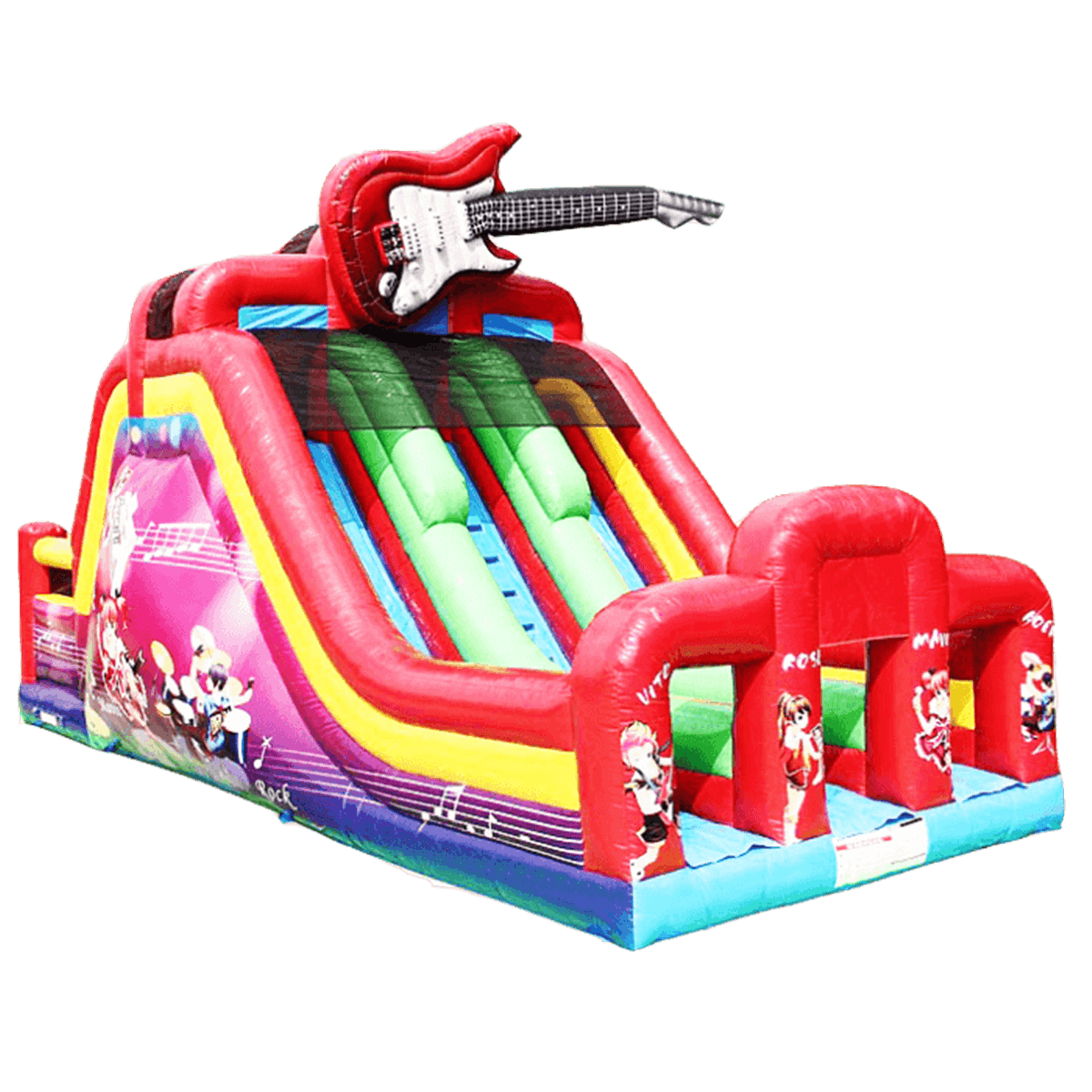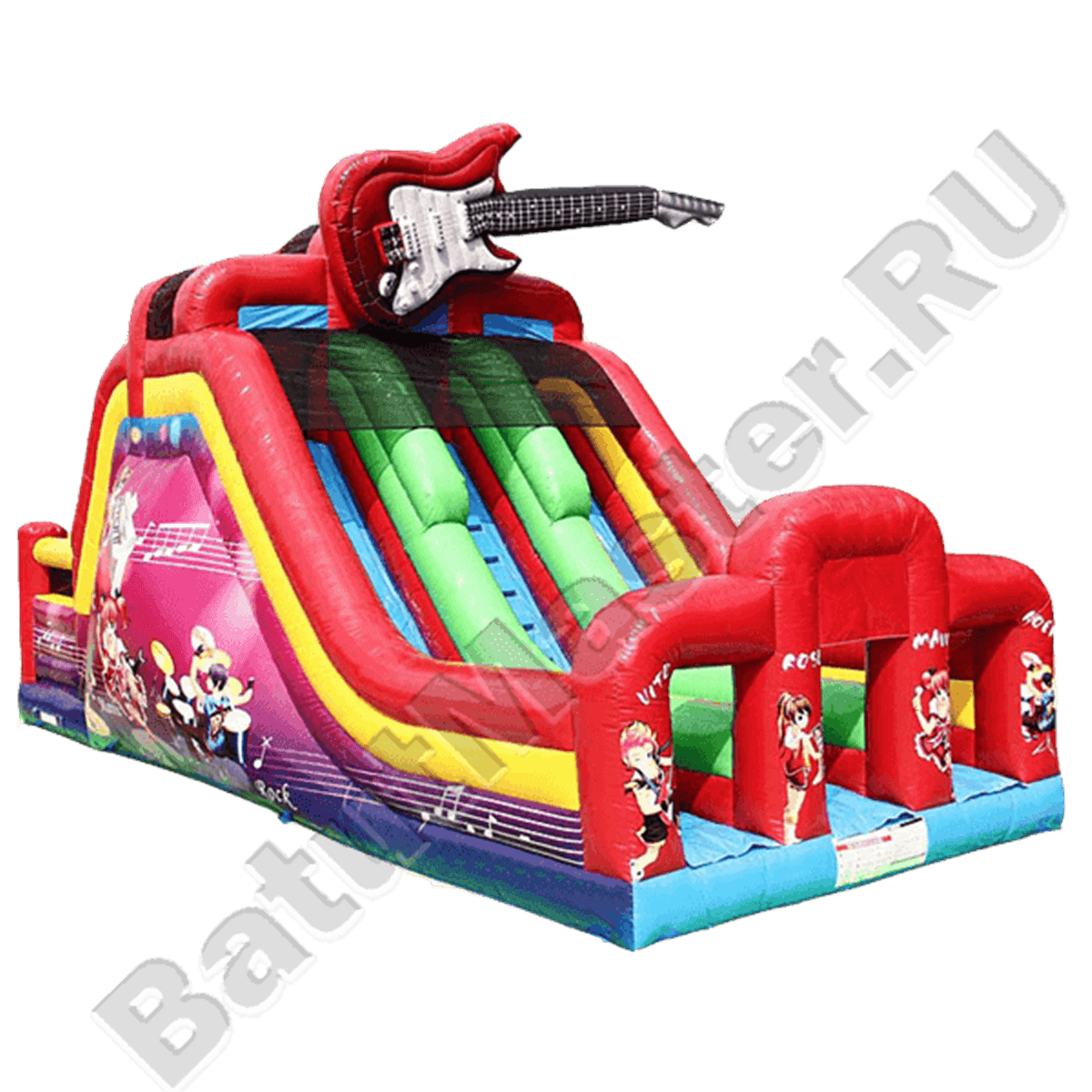 Детский надувной батут-горка «Love music» сконструирован в виде трёх горок, средняя горка предназначена для подъёма, а крайние для спуска. Главной особенностью и украшением надувного аттракциона является гитара, расположенная в верхней части. Спуск с горок в верхней части оборудован защитной сеткой, которая не даст детям выпасть. На боковые стенки батута нанесены яркие рисунки с музыкальной тематикой.