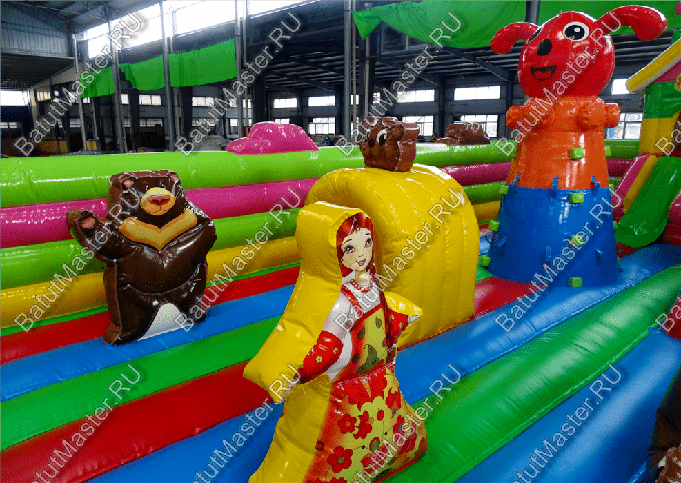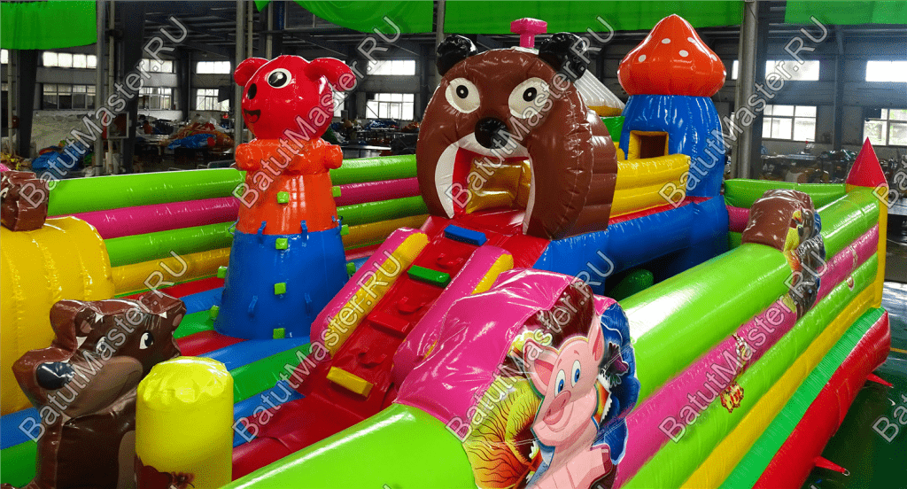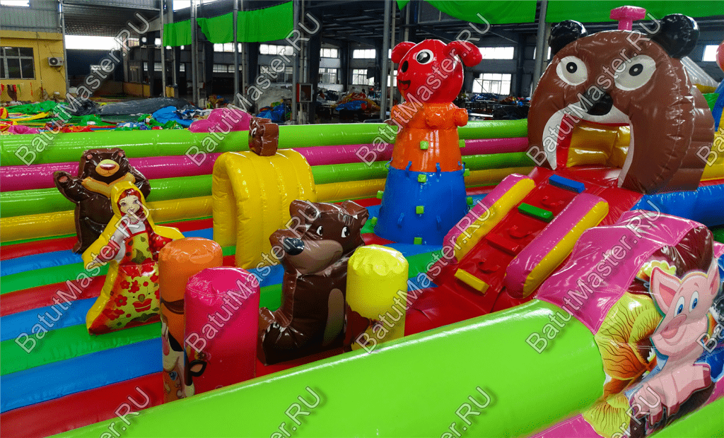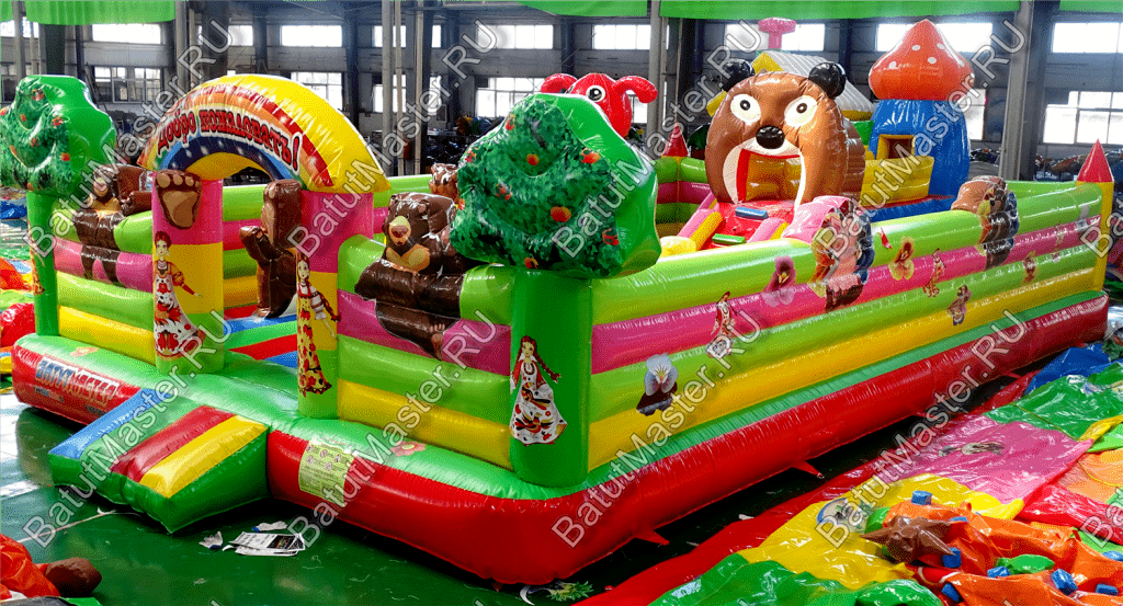 Добро пожаловать на сказочный, яркий и интересный надувной батут! Резвясь здесь, дети попадут в невероятные приключения и получат незабываемые эмоции. Большой игровой комплекс оснащен интересными модулями, на которых могут резвиться даже самые маленькие непоседы. Здесь есть скалодром, по которому так нравится забираться детям, небольшой тоннель, вертикальные модули, надувные мишки, подъем с горкой и домиком, где можно играть в прятки или просто спускаться вниз. Здесь достаточно места для того, чтобы дети смогли придумать подвижные игры. Стоит отметить большую прыжковую зону. Коммерческий батут снаружи украшен героями из добрый сказок, которые так любят маленькие дети. Вход выполнен в виде арки, а по бокам стоят высокие надувные деревья. Яркий цвет и современное оснащение подарит только радость. Юные непоседы по достоинству оценят комплекс, ведь здесь все детали разработаны для того, чтобы дети двигались и весело проводили время. Сбоку батут защищен надувными бортами, которые не содержат жестких элементов, что говорит о безопасности батута. Рассчитан для бизнеса. Изготовлен из ламинированного ПВХ высокого качества. Простой и неприхотливый в уходе. Материал и швы не впитывают грязь и пыль.