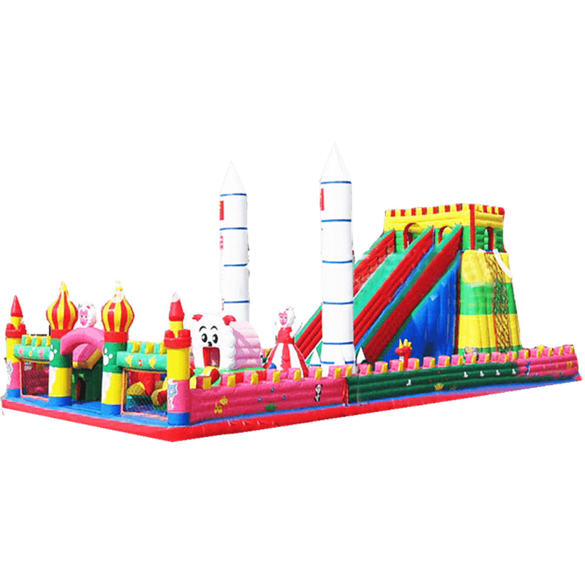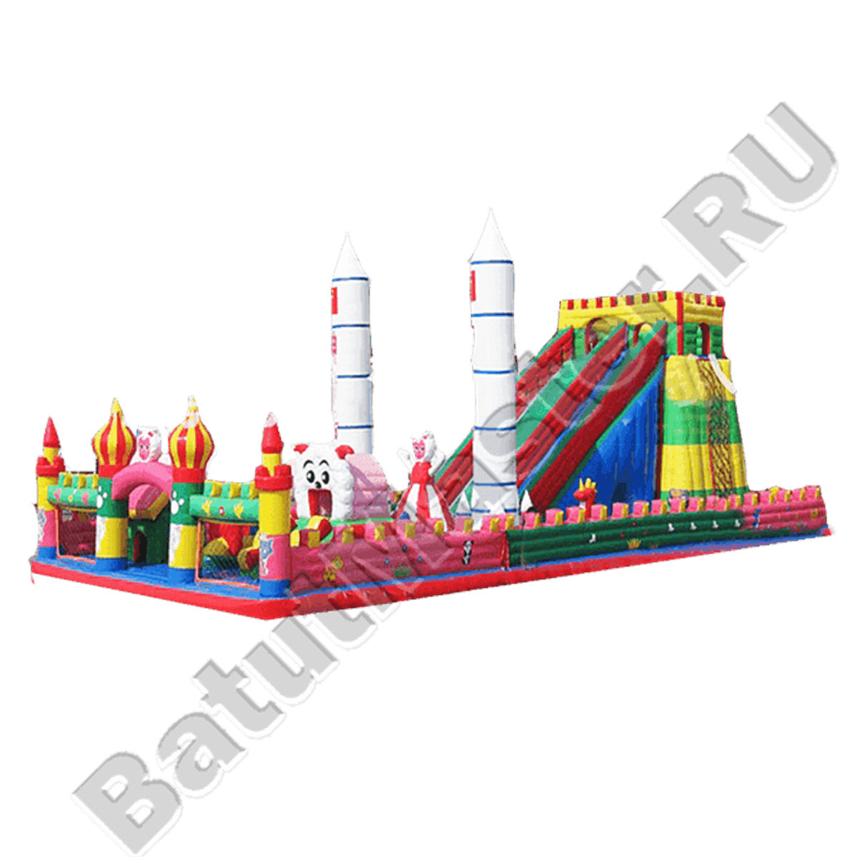 Драконы, смешарик с открытым ртом в виде небольшой горки, Белоснежка, надувной дракон – и это далеко не весь список имеющихся сказочных героев, с которыми захотят поиграть ребята. Безопасность обеспечена не только сеткой, но и высоким ограждением вокруг всей площадки. Верх горки украшен средневековой крепостью, а с нее спадают воздушные лестницы для самых храбрых воинов.