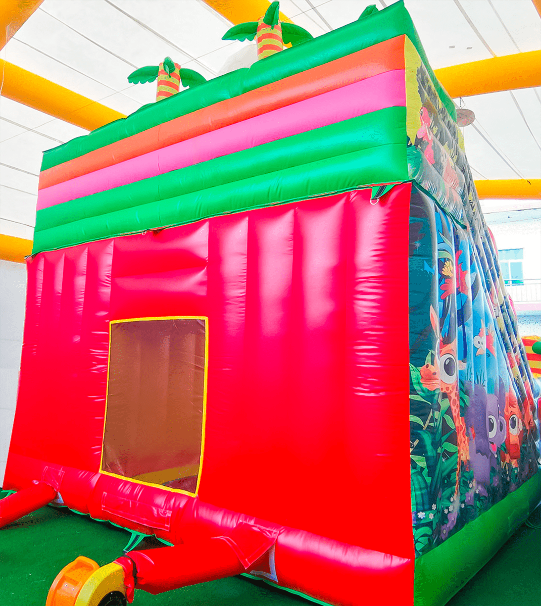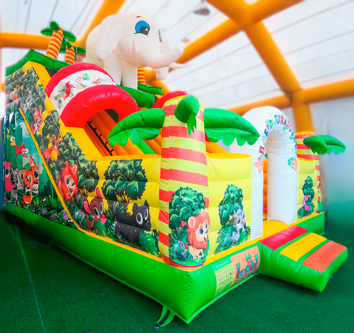 Надувной батут «Слоник в джунглях» — это полноценный мини-парк развлечений, созданный специально для того, чтобы дарить детям радость и активное веселье! Его красочный и детализированный дизайн, наполненный зеленью, пальмами и мультяшными животными, моментально приковывает взгляды и вызывает улыбку у малышей. Главным героем аттракциона стал добрый и огромный белый слон, который «охраняет» вход в мир джунглей.