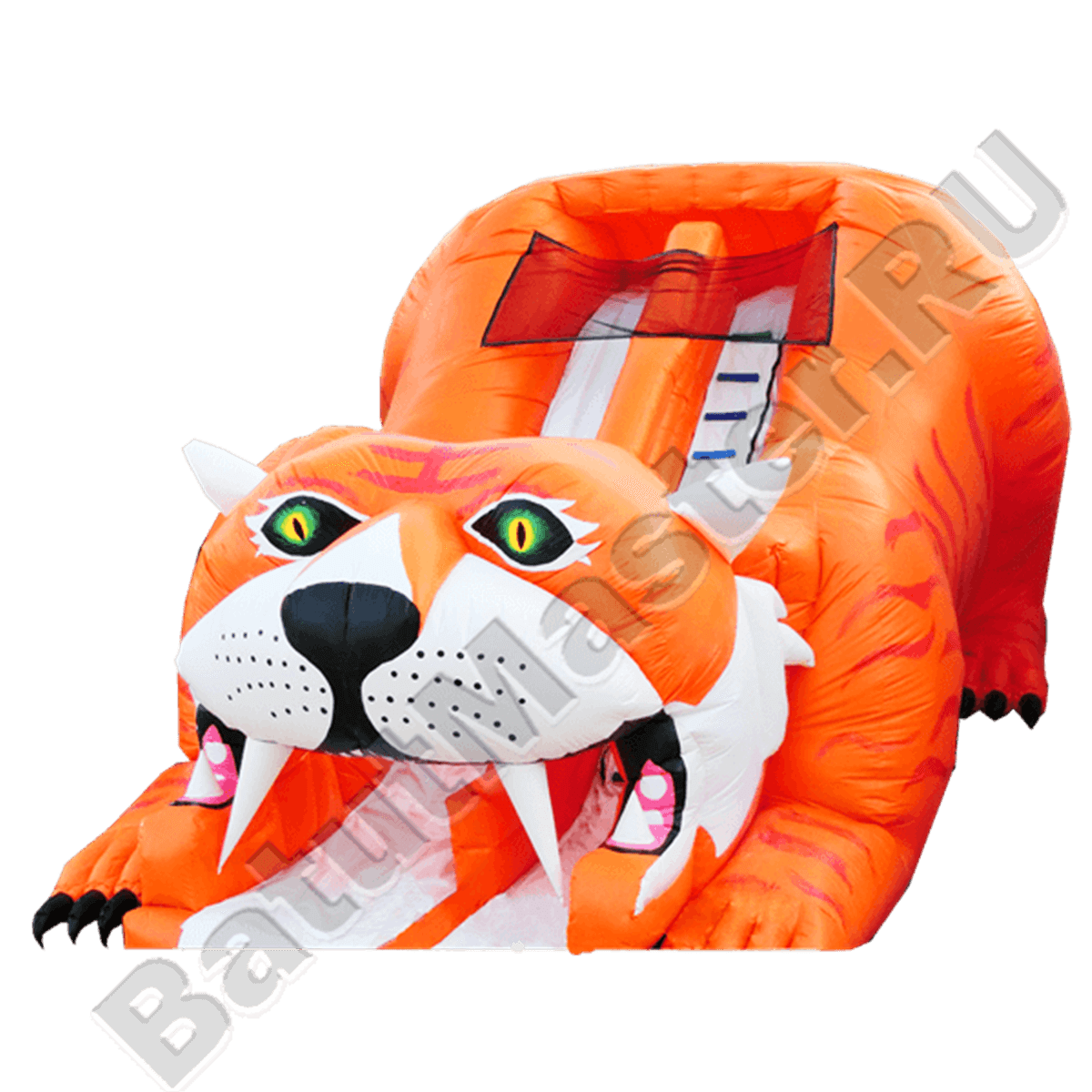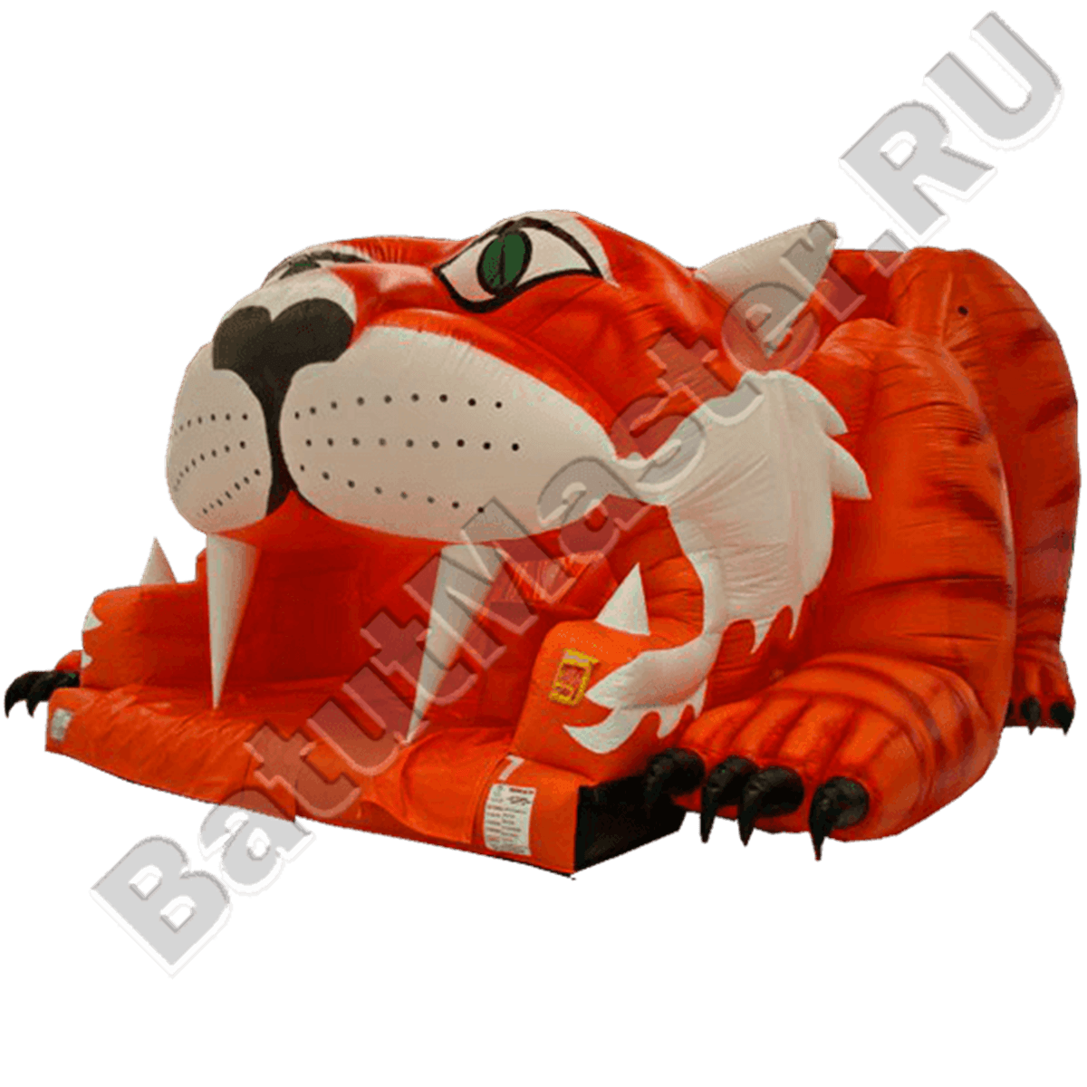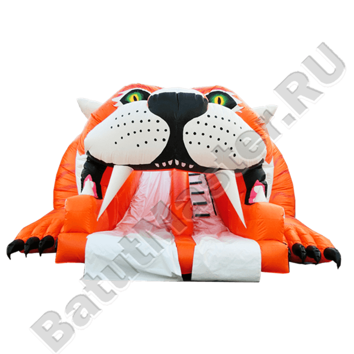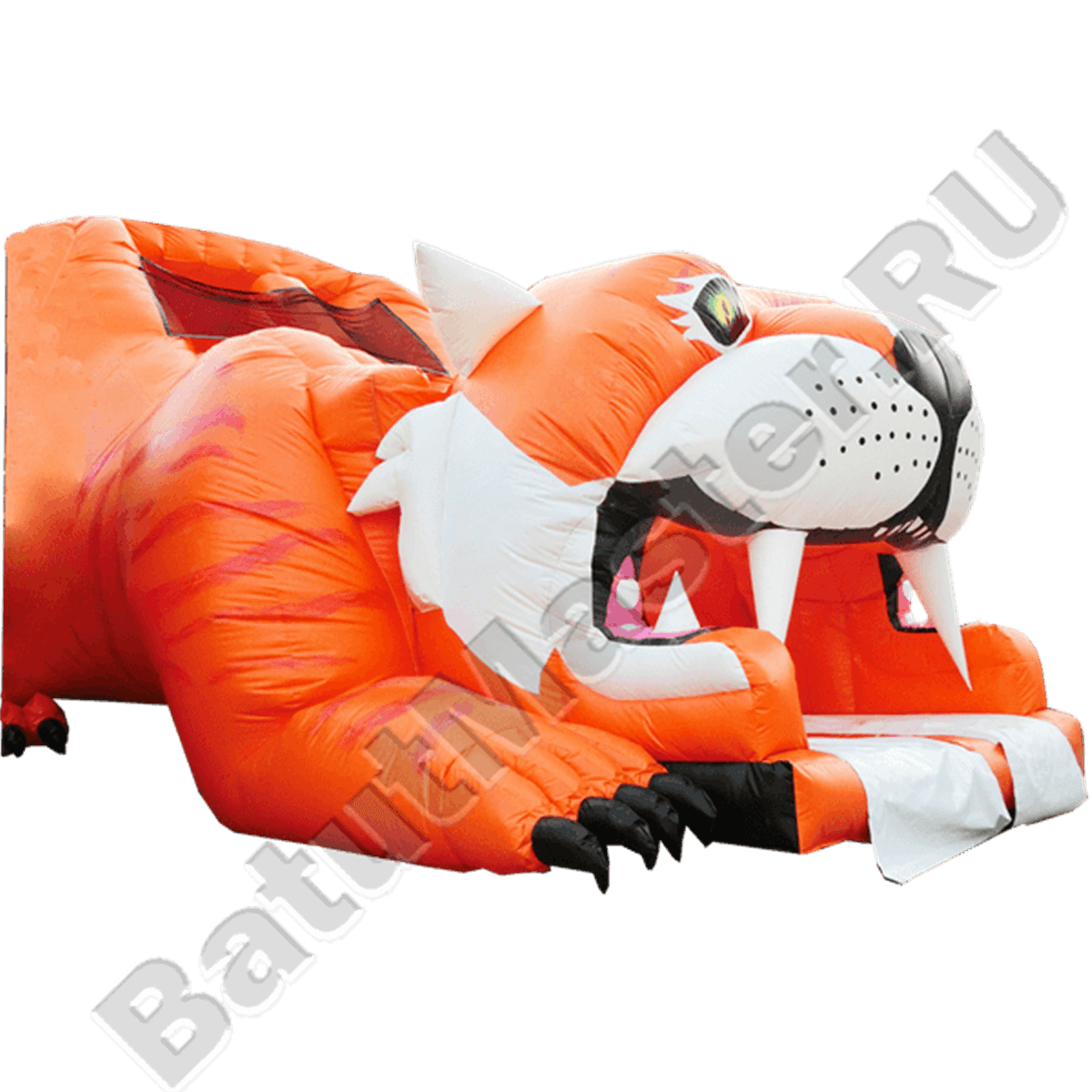 Необычный надувной аттракцион «Тигр» выполнен в виде огромного хищника с раскрытым ртом и мягким клыками. Батут оформлен в ярко оранжевых тонах с белым скользящим покрытием на игровой зоне.