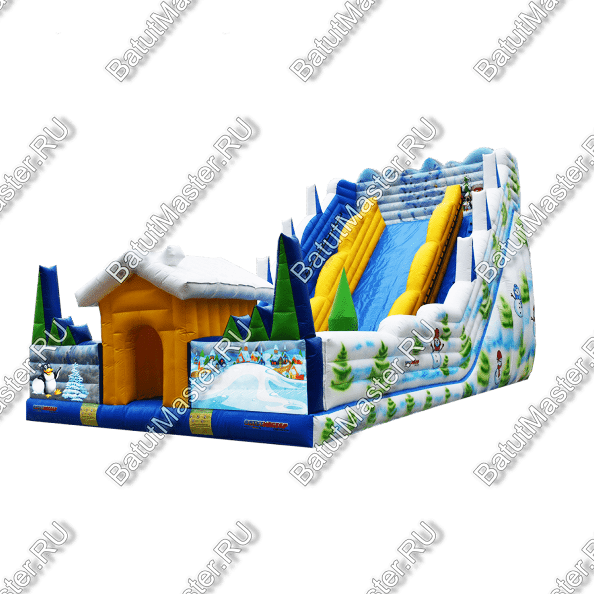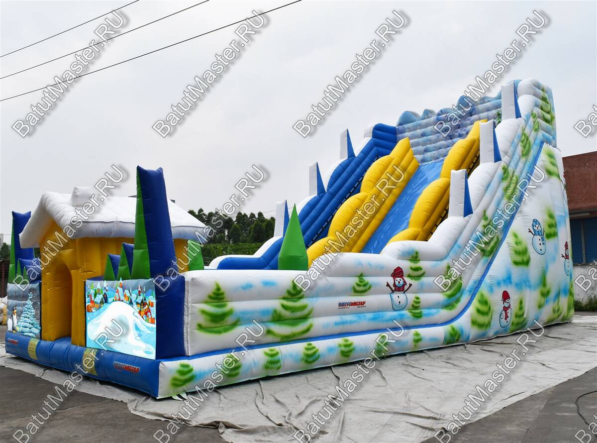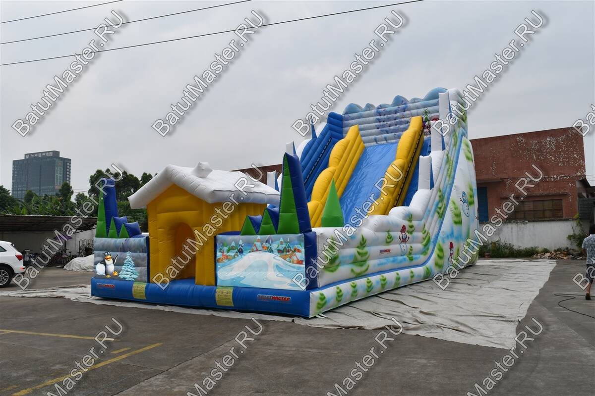 За прыгательной платформой дети могут попасть на высокую, будто заледеневшую, горку с изображением зимних климатических сюжетов. Стартовая площадка горки расположена на высоте 7 м, эта часть коммерческого аттракциона полностью открытая и просматриваемая. По внешним краям склона проходят высокие стены в бело-голубой расцветке ПВХ, украшенные изображениями елей. Фасад продолжается таким же ограждением, но уже с изображениями пингвинов и заснеженной деревни.