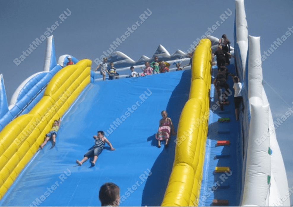 Подъем на горку осуществляется по двум лестницам, проходящим справа и слева от центрального полотна спуска. Лестницы оборудованы мягкими поручнями, а между всеми тремя склизами проходят желтые надувные барьеры, которые ограждают группы поднимающихся детей от спускающихся.