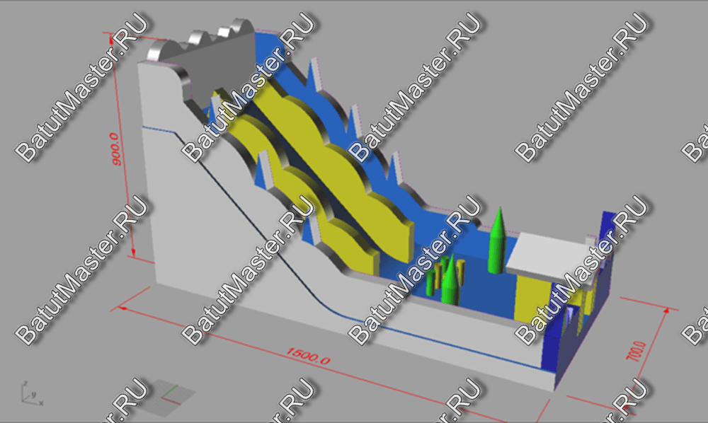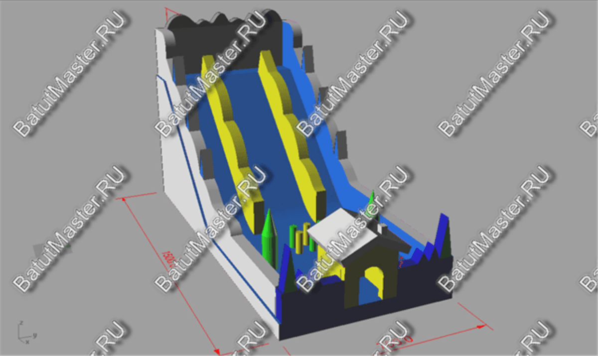 Надувной батут «Веселая горка» размещается на площадке со сторонами 15 и 9 м, самая высокая точка аттракциона достигает 9 м в высоту. Вход на батут имеет вид небольшого рубленого домика из желтого ПВХ с заснеженной крышей из белого материала. Сразу за домиком открывается игровая площадка, на которой можно бегать, прыгать и устраивать соревнования на скорость. Фасадная стена батута для бизнеса оборудована фигурами надувных зеленых елей, такие же фигуры можно встретить и на прилегающей к домику территории.