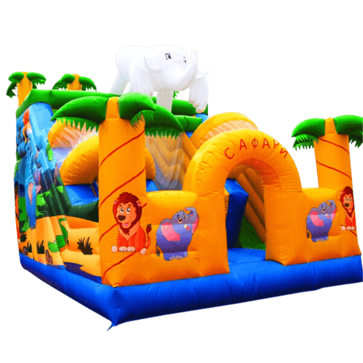 Популярная надувная горка с дизайном экзотической природы и африканских животных – заманчивая картинка для множества детей. Забавные слоники, яркие оранжевые пальмы с зелеными кронами будут радовать не только своей мягкой и прыгающей структурой, но и непривычностью. Две не очень высокие надувные горки, предназначенные для малышей и надувная площадка для прыжков – довольно прибыльная затея, ведь часто именно крохам не хватает специализированных развлечений, поэтому владелец батута внакладе не останется.
