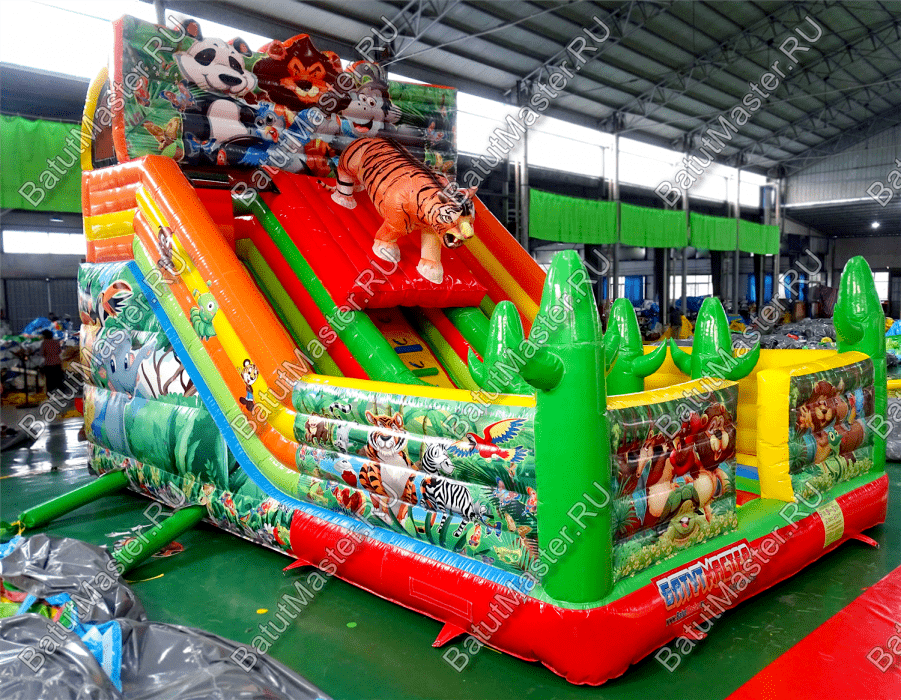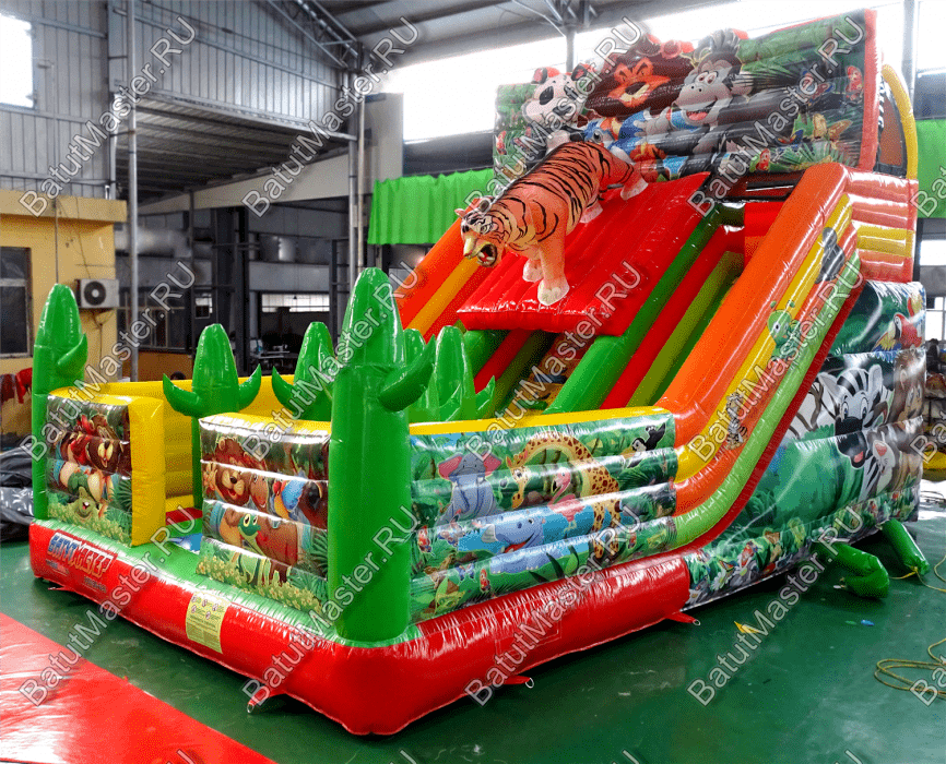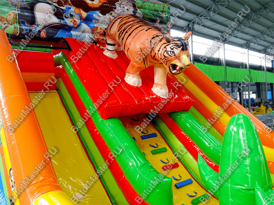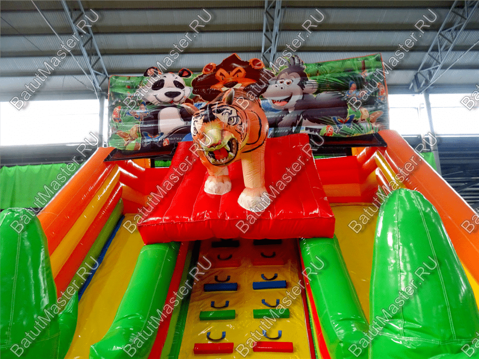 Коммерческий надувной батут «Зов тигра» поразит малышей и их родителей своим ярким внешним видом. Буйство красок захватит внимание малышей, а от декораций практически невозможно отвести взгляд. Тут и там виднеются различные надувные фигуры, среди которых выделяется очень реалистичная фигура тигра, который наблюдает за всем происходящим. Стены батута украшены качественными принтами с изображениями разных животных.