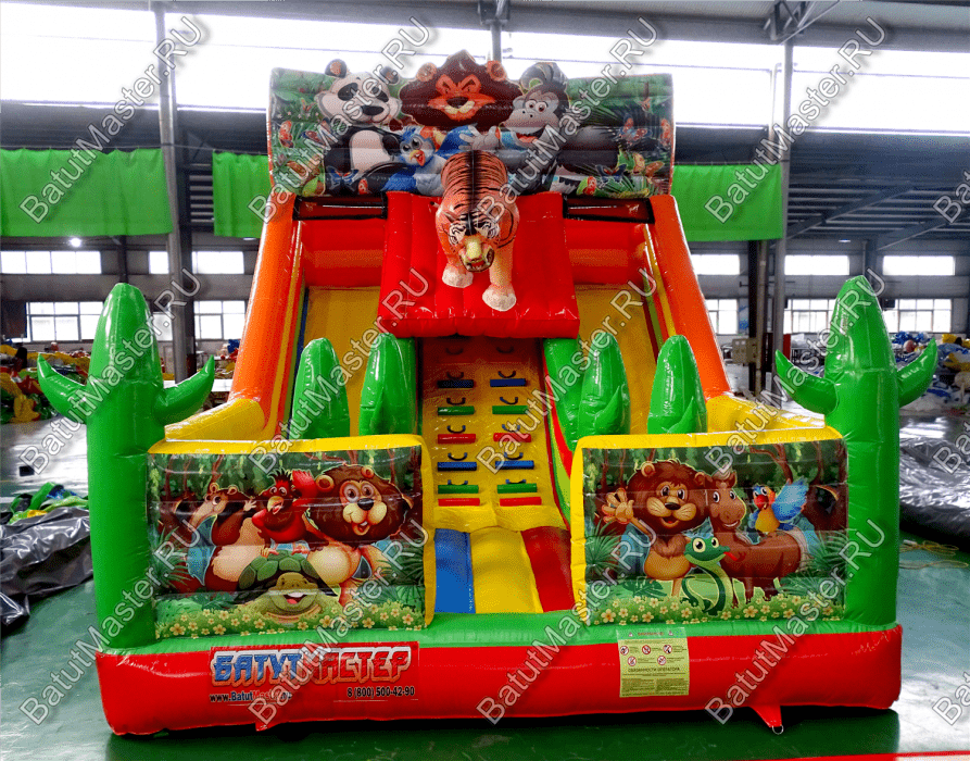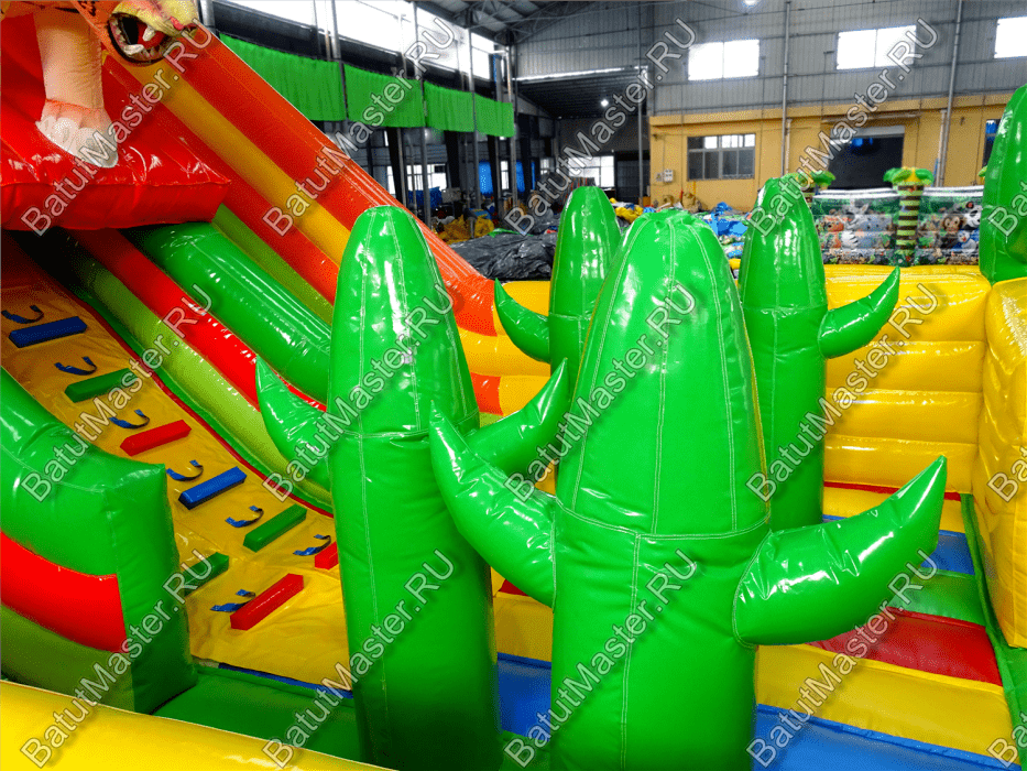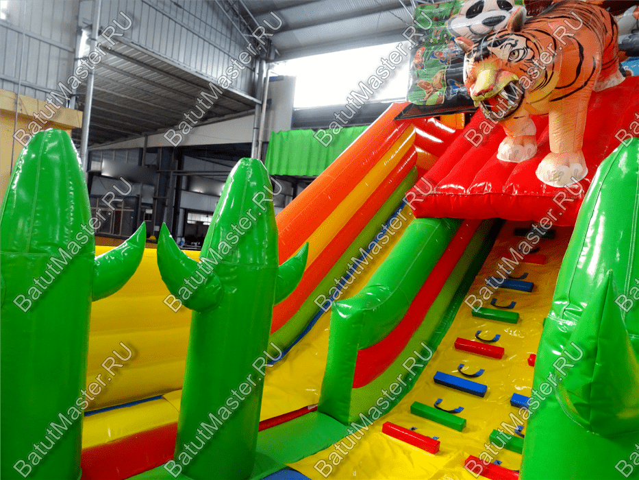 Батут «Зов тигра» порадует детишек игровыми фигурами в виде кактусов, вокруг которых можно бегать или даже попробовать взобраться на один из них. Но, кактусы не главное развлечение батута, ведь тут есть высокая горка, разделённая на две части. Лесенка посередине позволяет быстро взобраться наверх, не мешая другим детям, что очень важно для беспрерывного веселья.