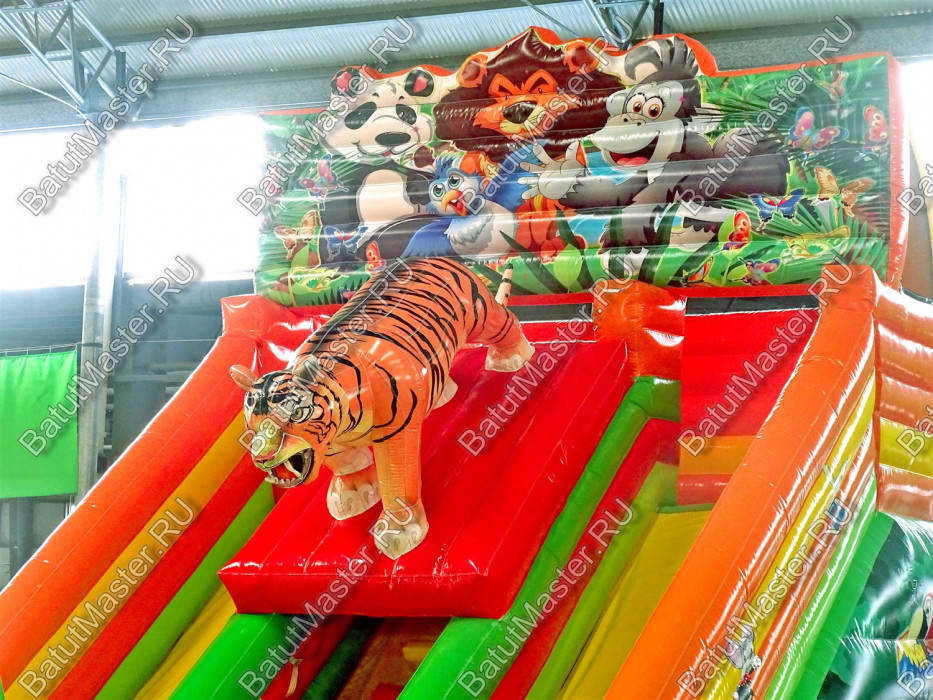 Если данный батут для бизнеса разделить на 2 зоны, то первая – это прыгательная площадка, охватывающая большую часть надувной площадки. Вторая зона – это горка, состоящая из трех склизов, два из которых – спуски (справа и слева). А по центру зоны проходит необычная лестница, которая отделена от спусков высоким надувным бордюром, а сверху накрыта ярко красным надувным навесом. Вся увлекательность горки состоит в том, что на этом сложность конструкции не заканчивается: над красным навесом установлена фигура реального тигра из ПВХ, который будто встречает всех детей, поднимающихся наверх.