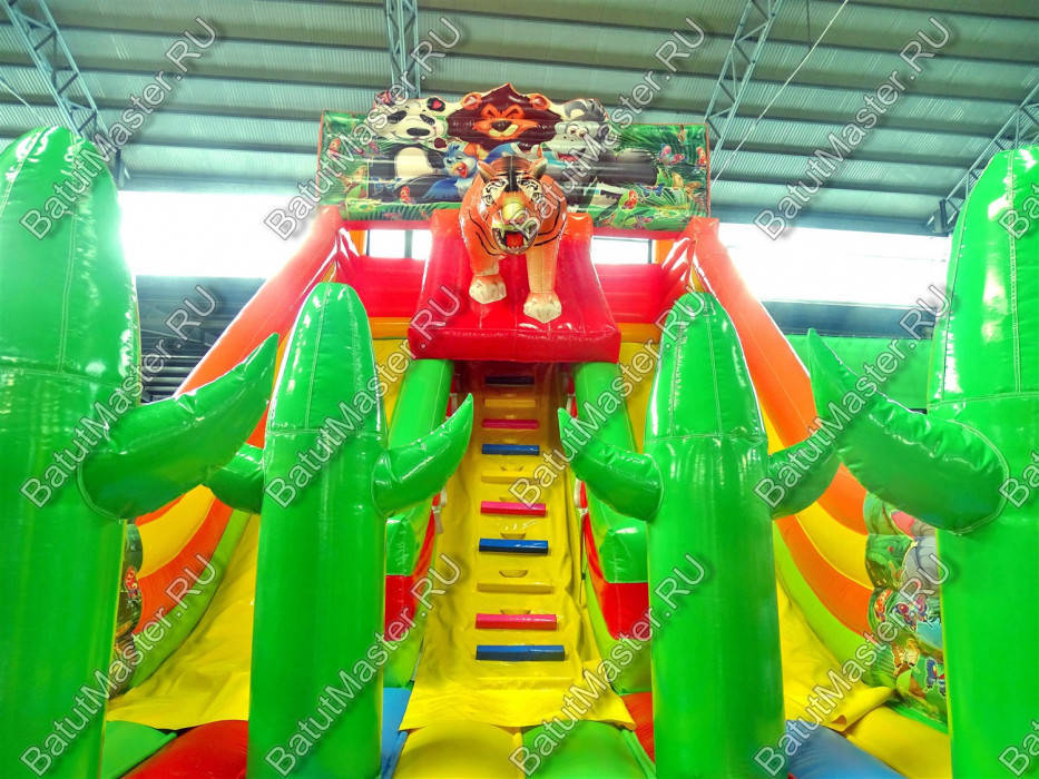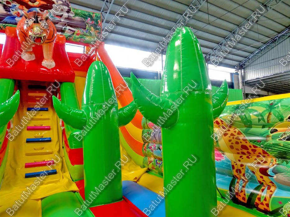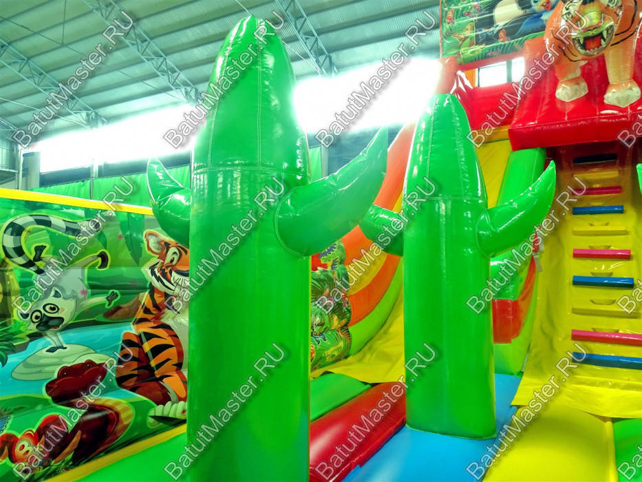Представленный надувной батут – невероятно красочная картинка, где надувное ограждение по периметру, задняя часть батута и верх стартовой площадки естественно передают реалии животного мира джунглей в картинках. Чтобы усилить правдивость сюжета и доказать детям, что зайдя в батут, они действительно окажутся в Африке, углы фасада украшены фигурами сочно зеленых надувных кактусов. Хотя точно такие же кактусы размещаются и на прыгательной площадке сразу после входа.