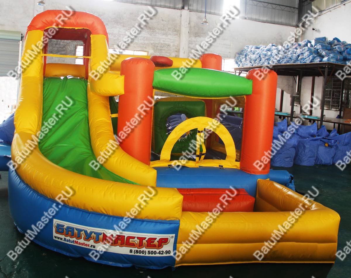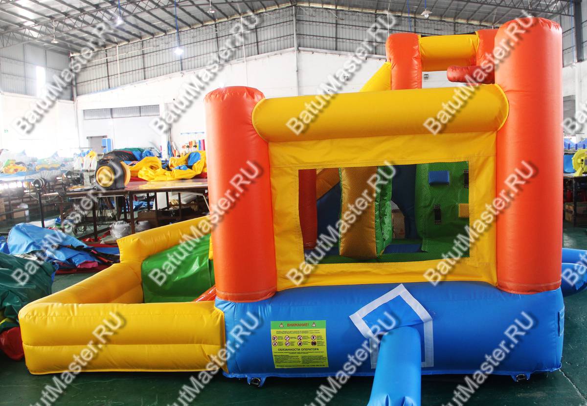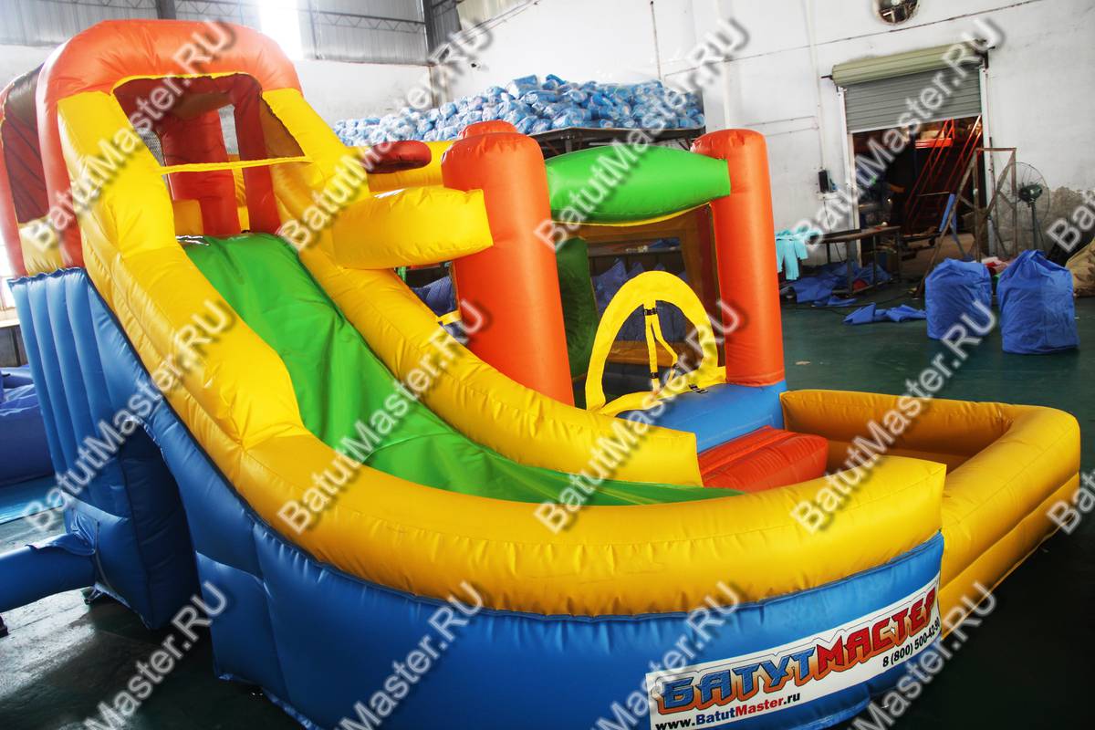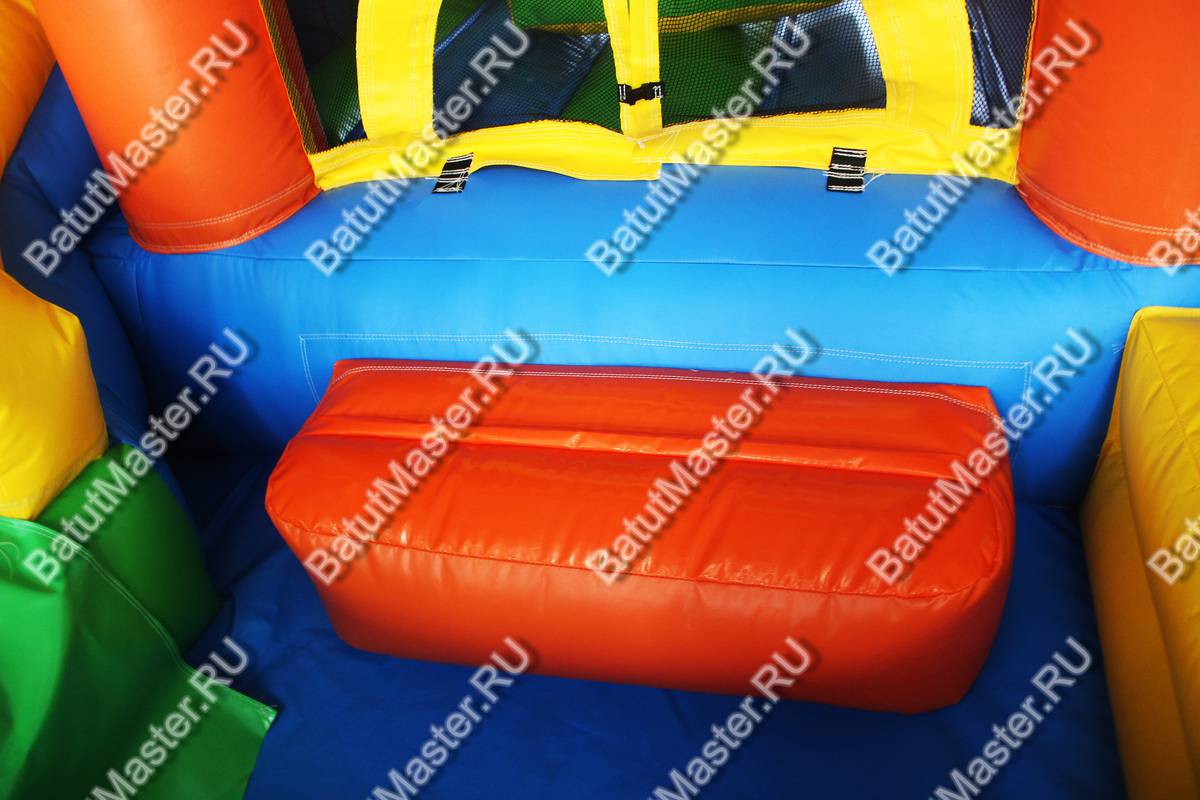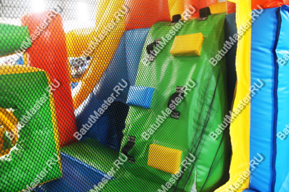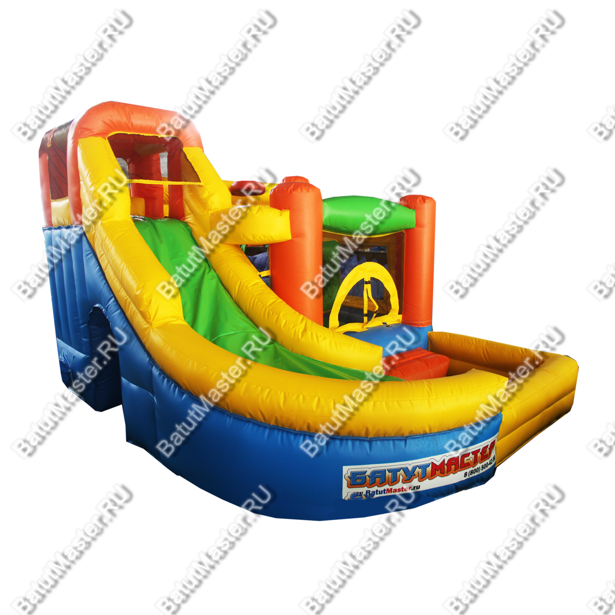 На горке также предусмотрены высокие борта, а самая верхняя точка на подъеме также защищена крышей. Надувной коммерческий батут в собранном виде без труда перемещается в другое место, легко надувается за считанные минуты, не требует особых условий хранения, легко транспортируется. Выполнен из особо прочного, ламинированного ПВХ. Такой материал не боится солнечных лучей и минусовой температуры.