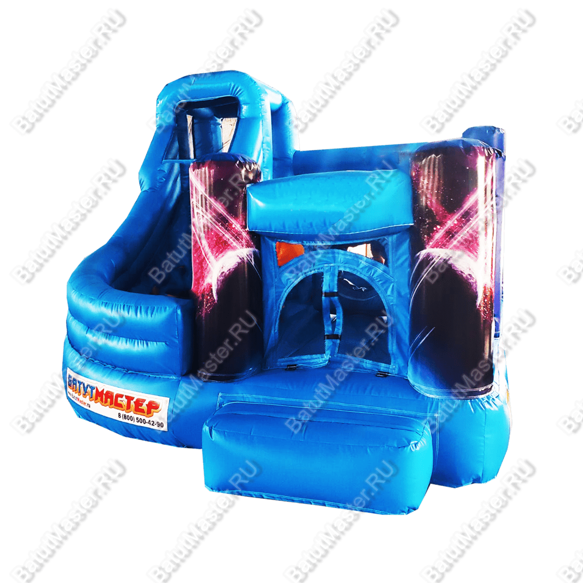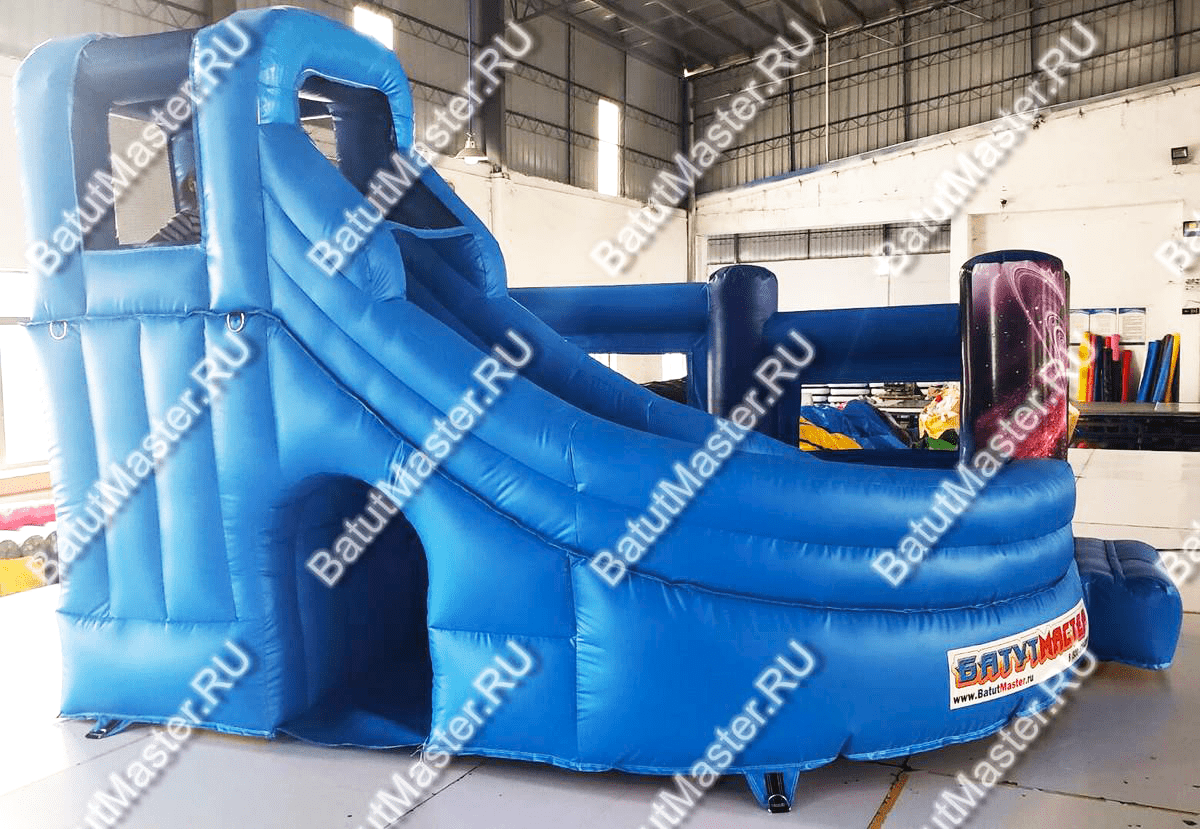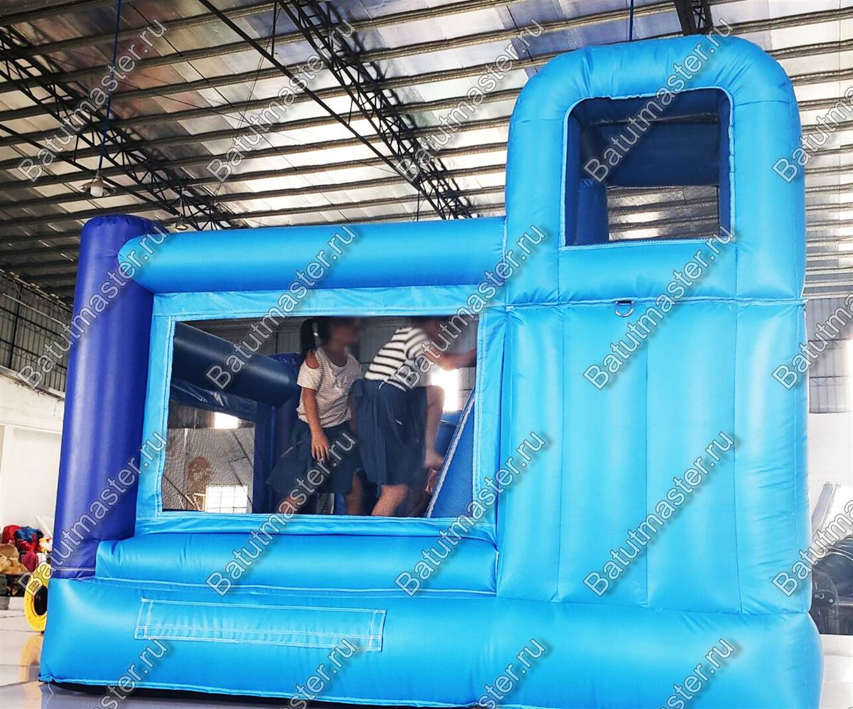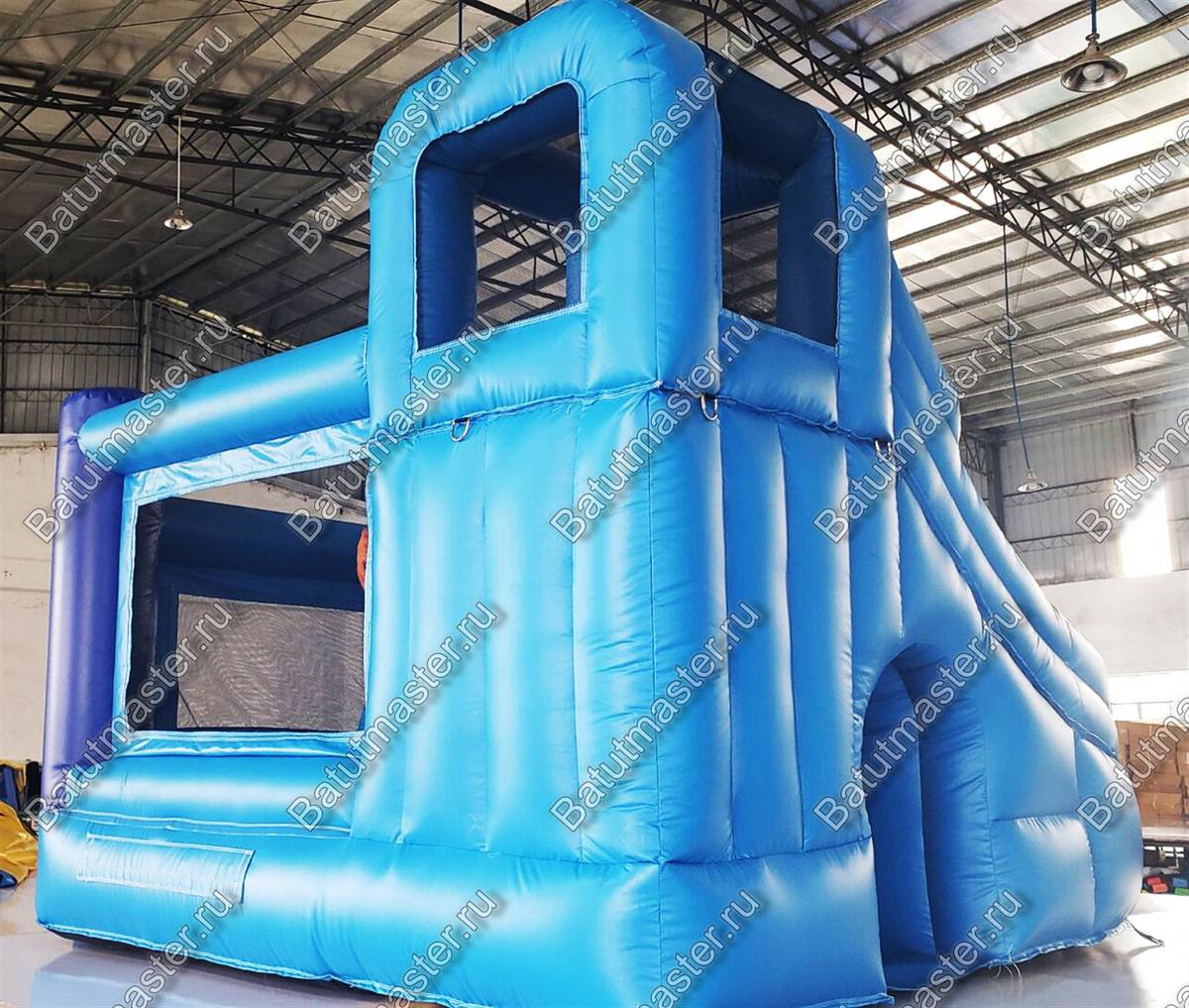 Детский надувной батут для бизнеса выполнен в ярком голубом и зеленом цветах. Небольшое прыжковое поле позволит выполнять там кувырки, а также оттуда можно забраться на необычный извивающийся спуск. Непременно понравится детям карабкаться по стене со щитами.