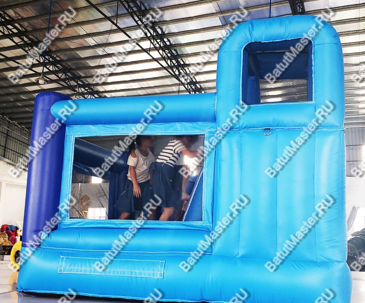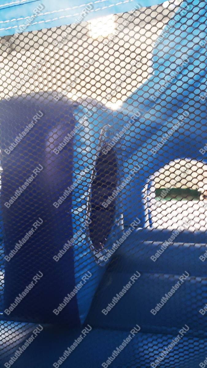 Вход выполнен в виде мягкой дверцы, которая надежно фиксируется молнией. На батуте нет ни одного жесткого элемента, все мягкое и надувное. По всему периметру батута есть большие окна из прочной сетки. Так, родители смогут контролировать детей.