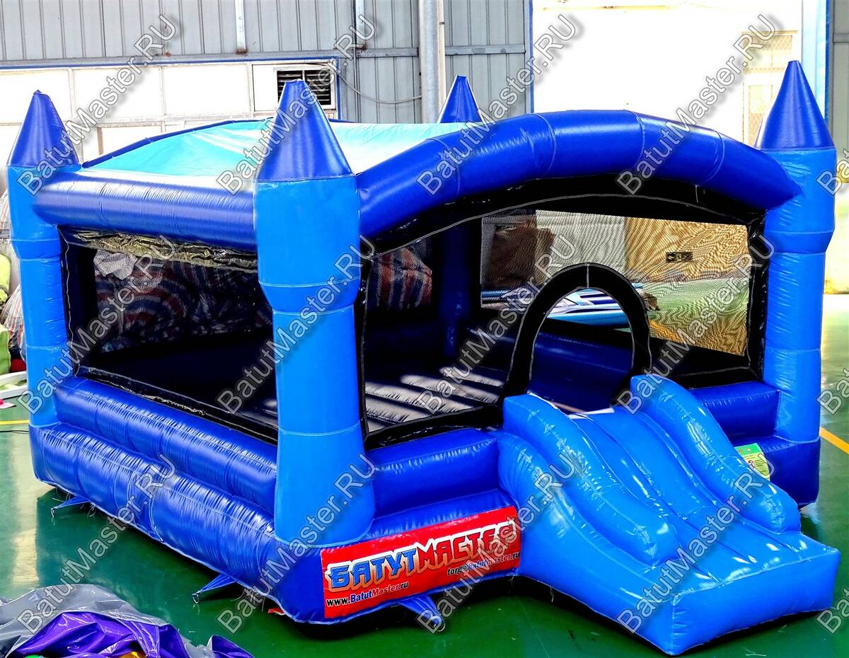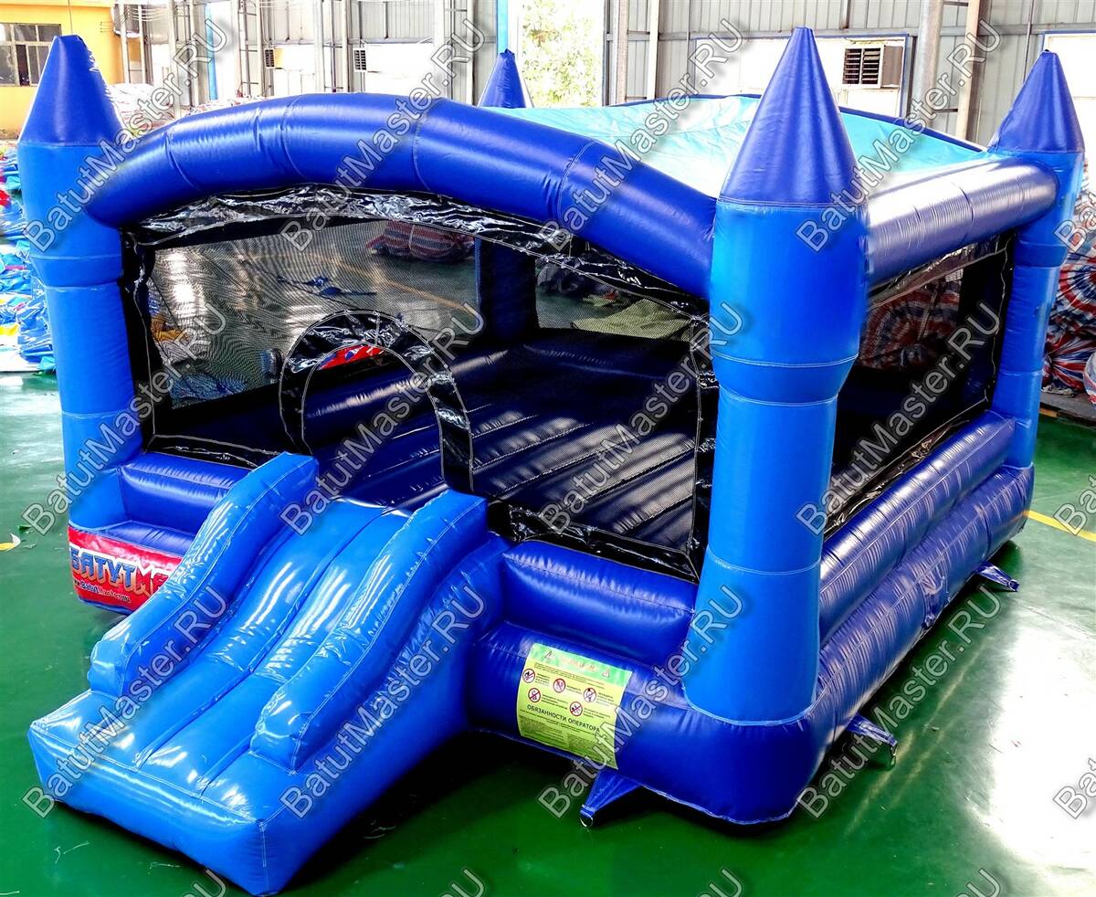 Батут разделен на 2 части: основная площадка предназначена для забавных прыжков целой озорной компании детишек, а вторая составляющая – веселый спуск. Сама горка синего цвета с желтыми невысокими, но достаточно мощными бортами. Платформа для прыжков имеет стенки в виде сетки, одна из сторон оснащена аркой, она и есть входом на спуск. То, что в батуте присутствует сетка, делает его полностью безопасным, спуск горки немного продлен вперед, поэтому ребенку ничего не угрожает. Низ главной площадки красный, а каждый угол выполнен в форме колонны-башни из синего и голубого цвета. Остроконечные башни красно-желтые.