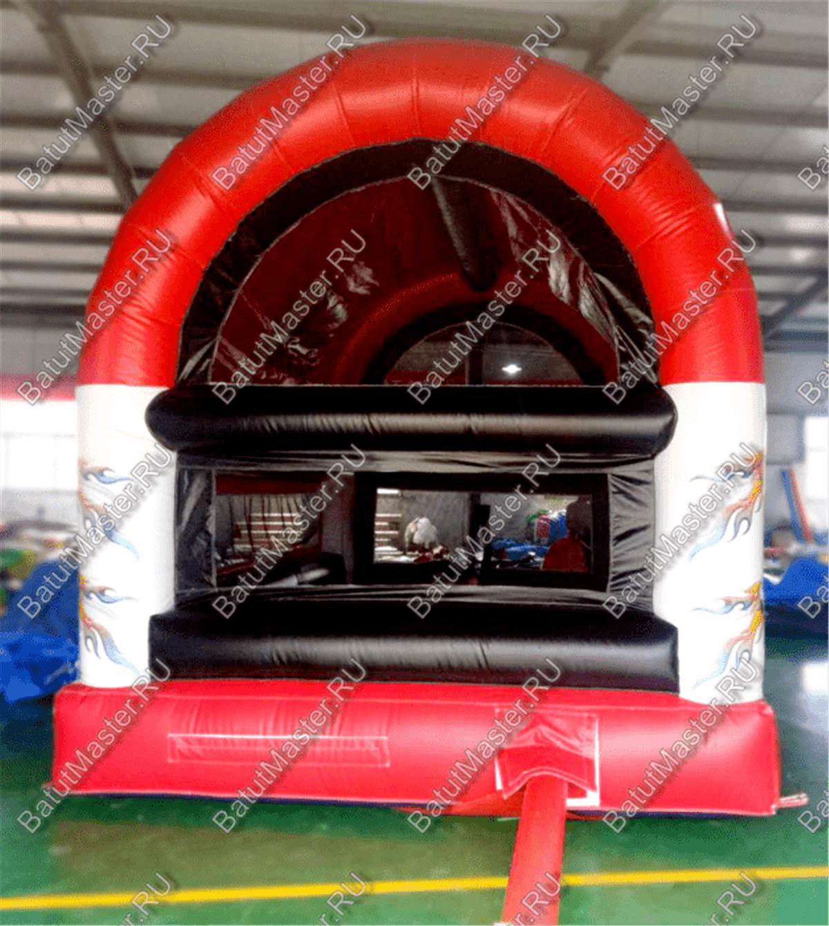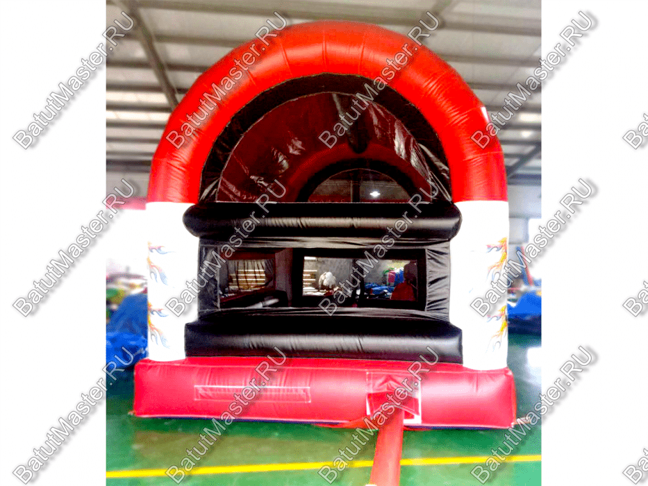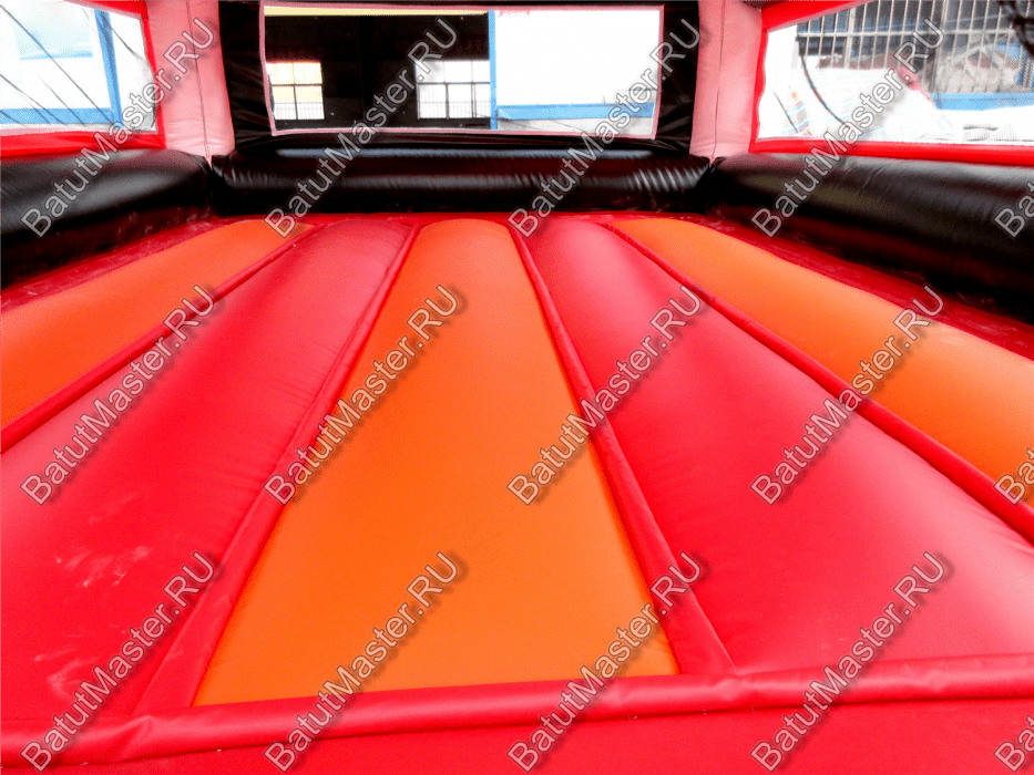 Светлая сетка, заменяющая стены, пропускает солнечный свет, ограничивает бурную энергию малышей пределами площадки и позволяет ненавязчиво следить за ними взрослым. Вход на батут выделен надувной красной ступенькой с небольшими желтыми полосами и крупной молнией, которая надежно восстановит целостность импровизированной стены, когда все желающие будут находиться внутри площадки. Высокая открытая арка снабжает площадку кислородом.