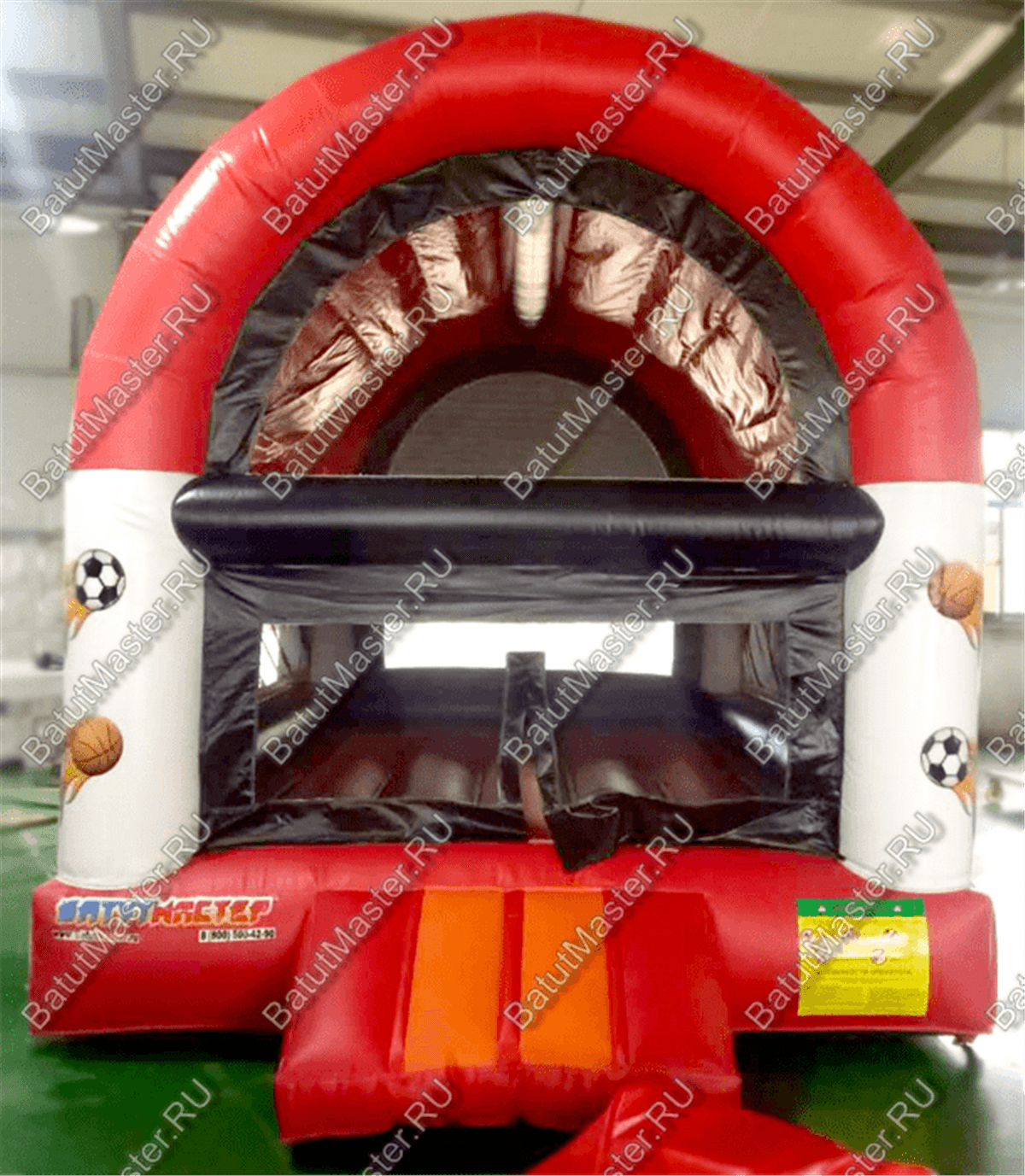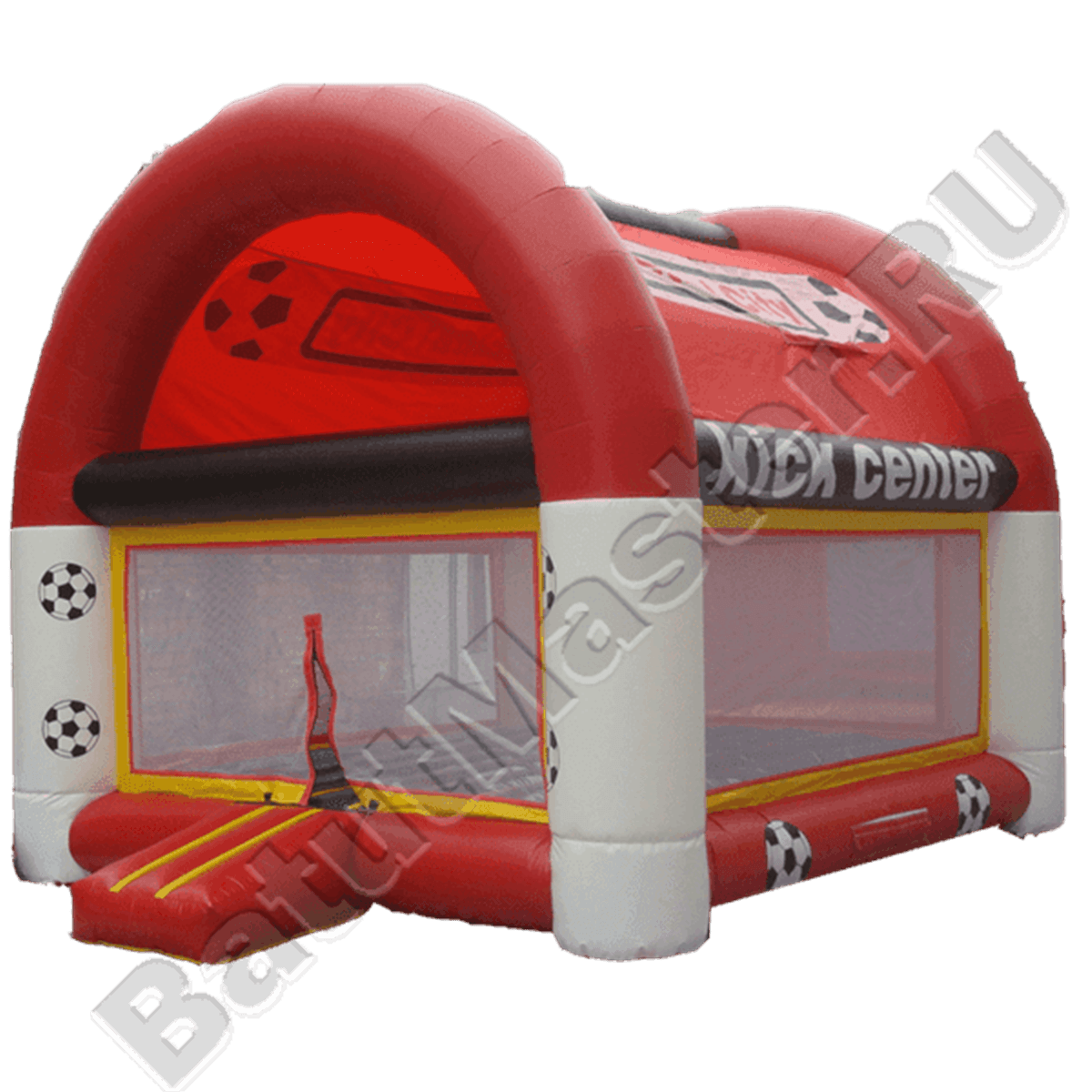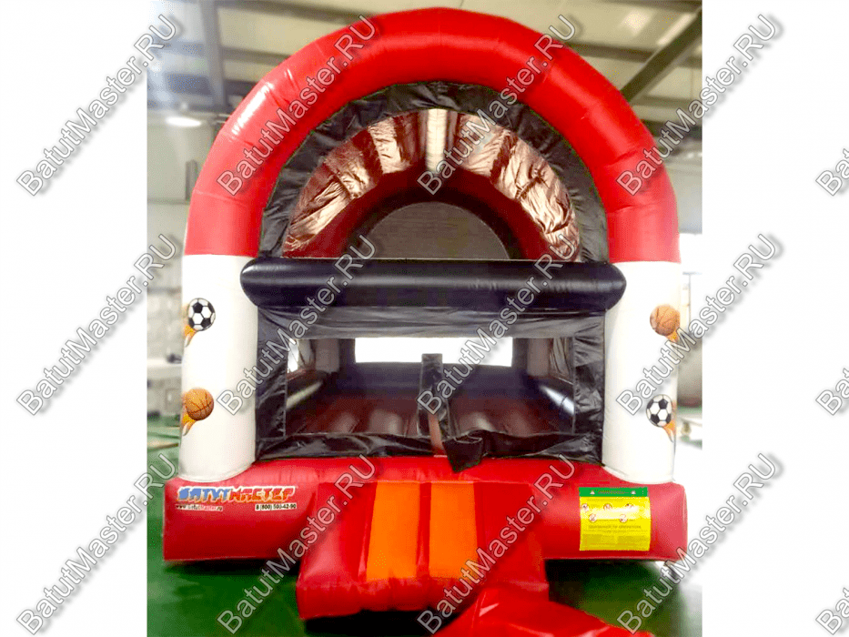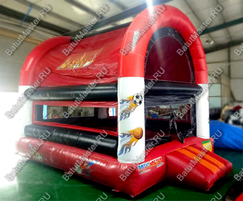 Особенности конструкции – объемные надувные белые столбы по углам и красные дуги по периметру позволяют поддерживать устойчивость конструкции. А надписи и нарисованные мячи делают площадку ярче и привлекательнее, приглашая поиграть с мячом внутри. Батут надежен и легок в сборке на небольшом ровном участке. Он не требует специальных средств по уходу, долговечен в использовании и снабжен защитой от дождя.