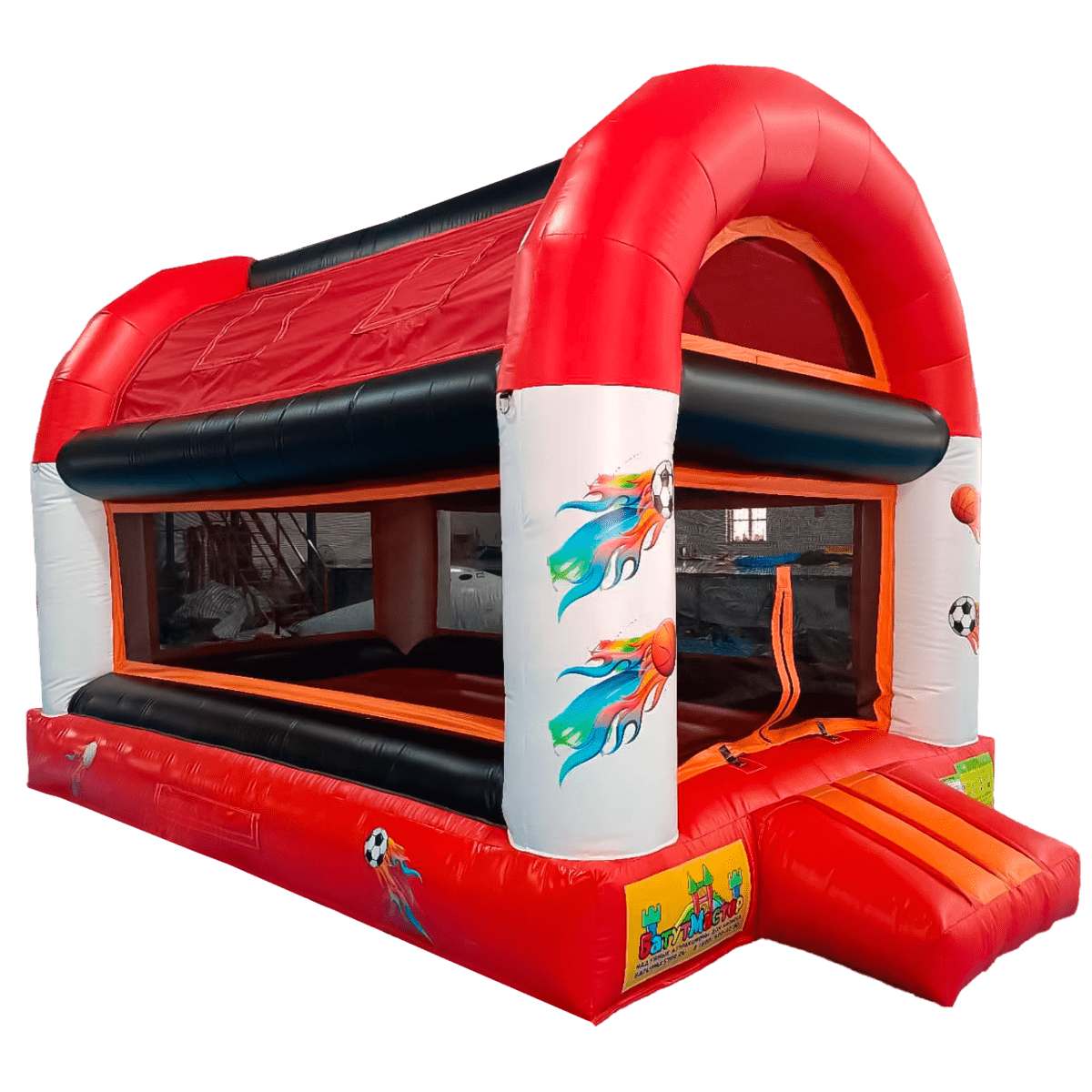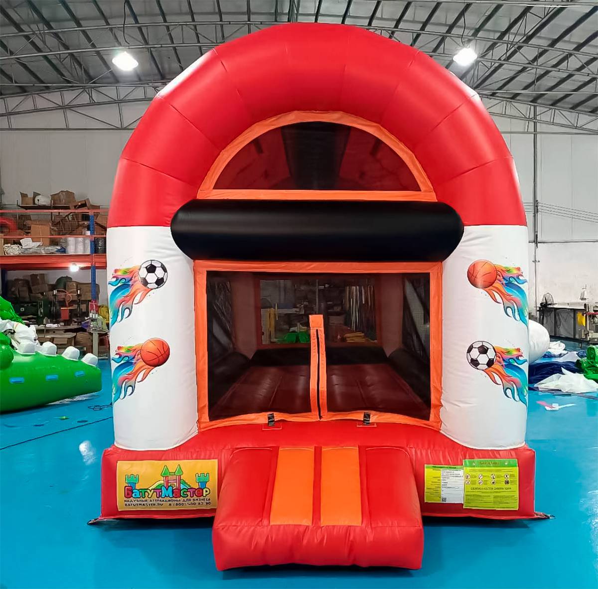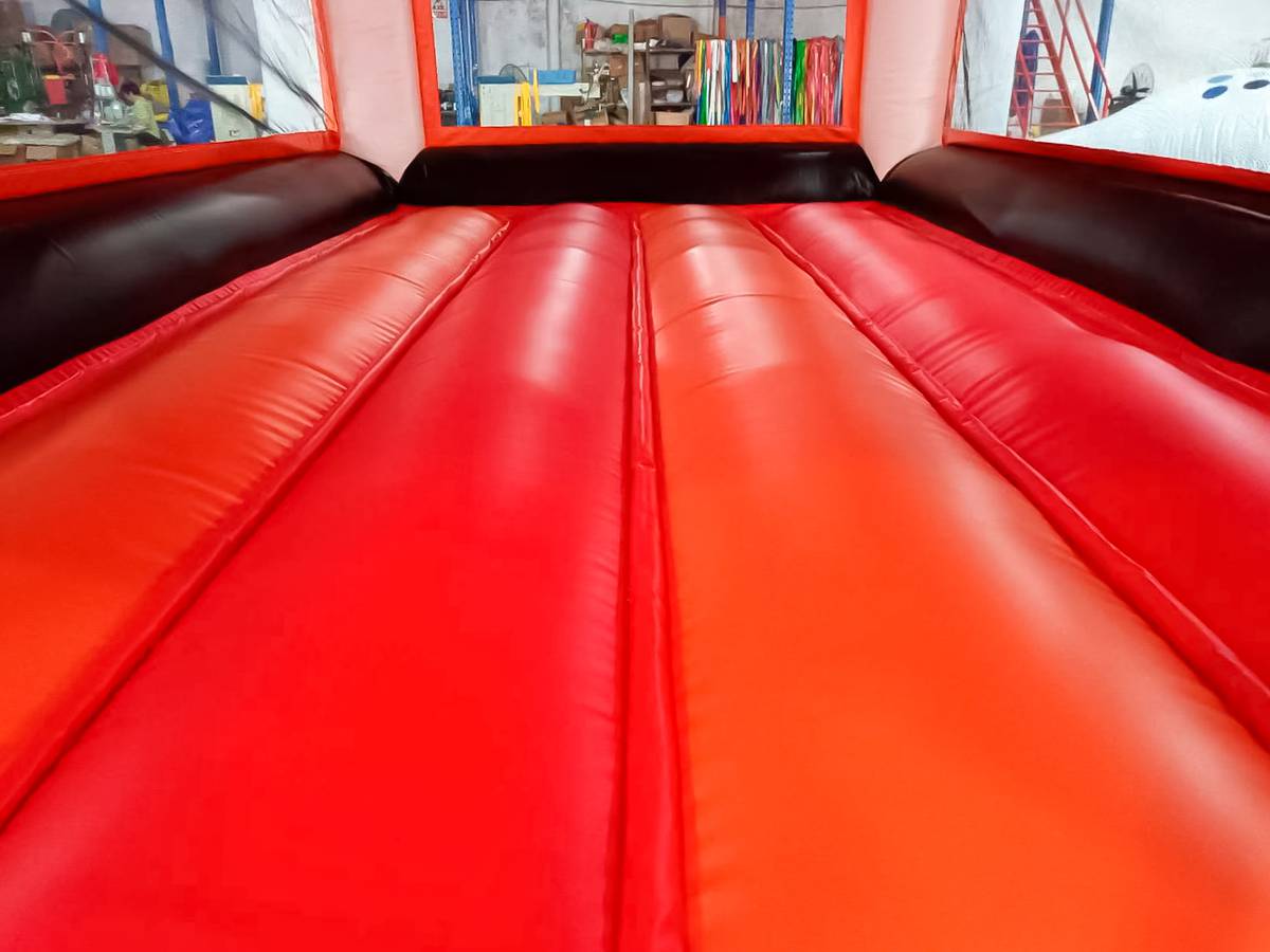 Светлая сетка, заменяющая стены, пропускает солнечный свет, ограничивает бурную энергию малышей пределами площадки и позволяет ненавязчиво следить за ними взрослым. Вход на батут выделен надувной красной ступенькой с небольшими желтыми полосами и крупной молнией, которая надежно восстановит целостность импровизированной стены, когда все желающие будут находиться внутри площадки. Высокая открытая арка снабжает площадку кислородом.
