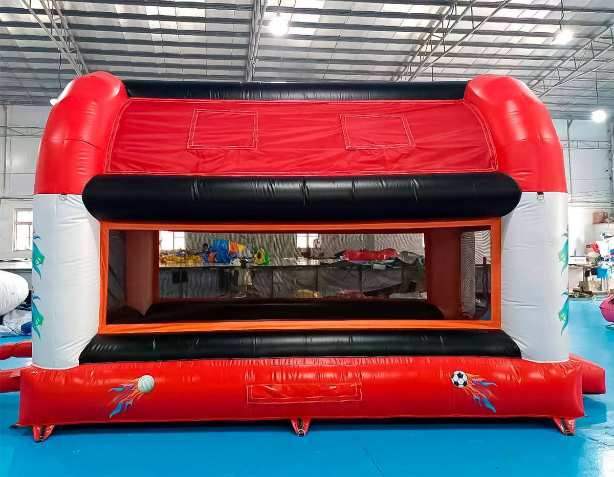 Особенности конструкции – объемные надувные белые столбы по углам и красные дуги по периметру позволяют поддерживать устойчивость конструкции. А надписи и нарисованные мячи делают площадку ярче и привлекательнее, приглашая поиграть с мячом внутри. Батут надежен и легок в сборке на небольшом ровном участке. Он не требует специальных средств по уходу, долговечен в использовании и снабжен защитой от дождя.