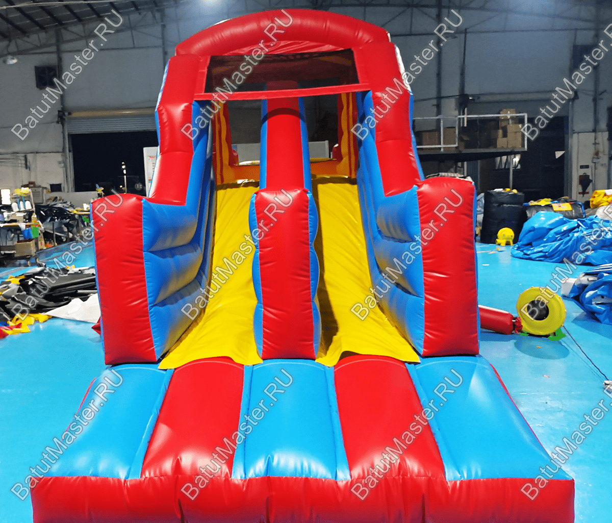 Надувной батут коммерческий для бизнеса отличное настроение говорит сам за себя. Это аттракцион непростой, в нем собраны все наиболее интересные спортивные элементы. Так, здесь имеется стена-скалодром, это отличный вариант для тренировок по альпинизму. Две большие горки с которых просто обожают лететь с ветерком юные непоседы.