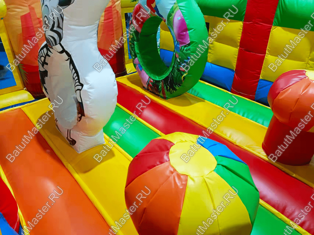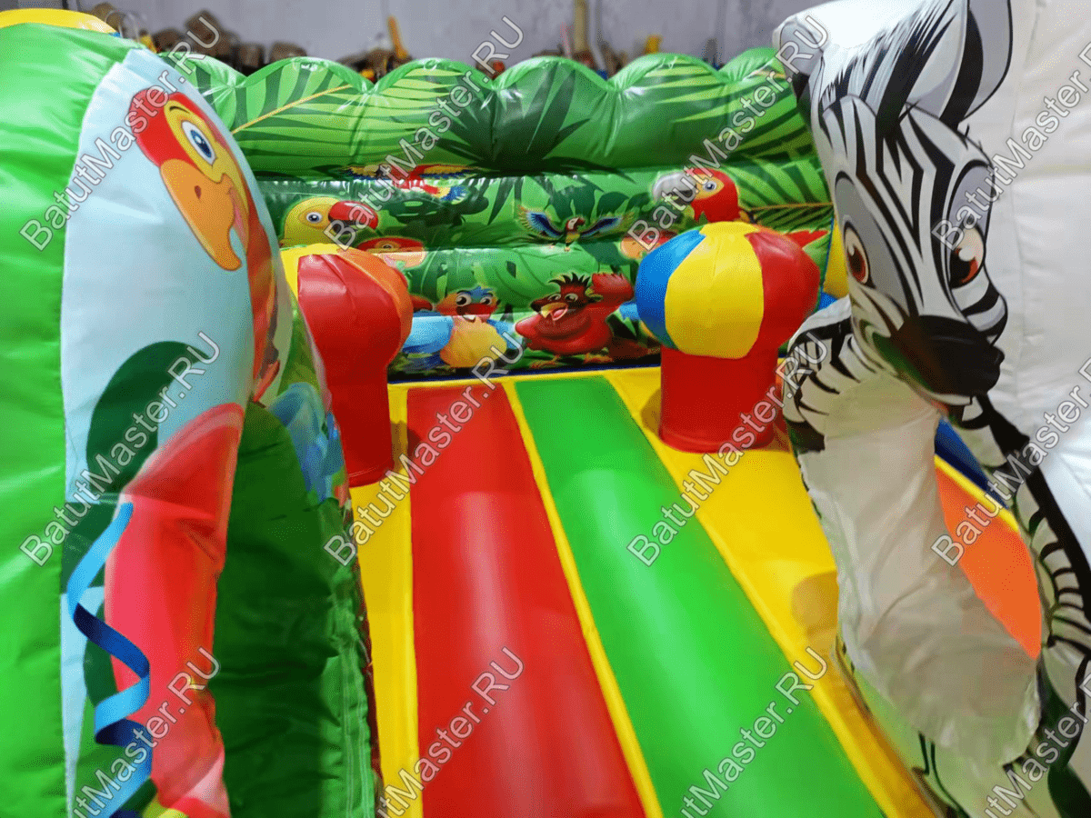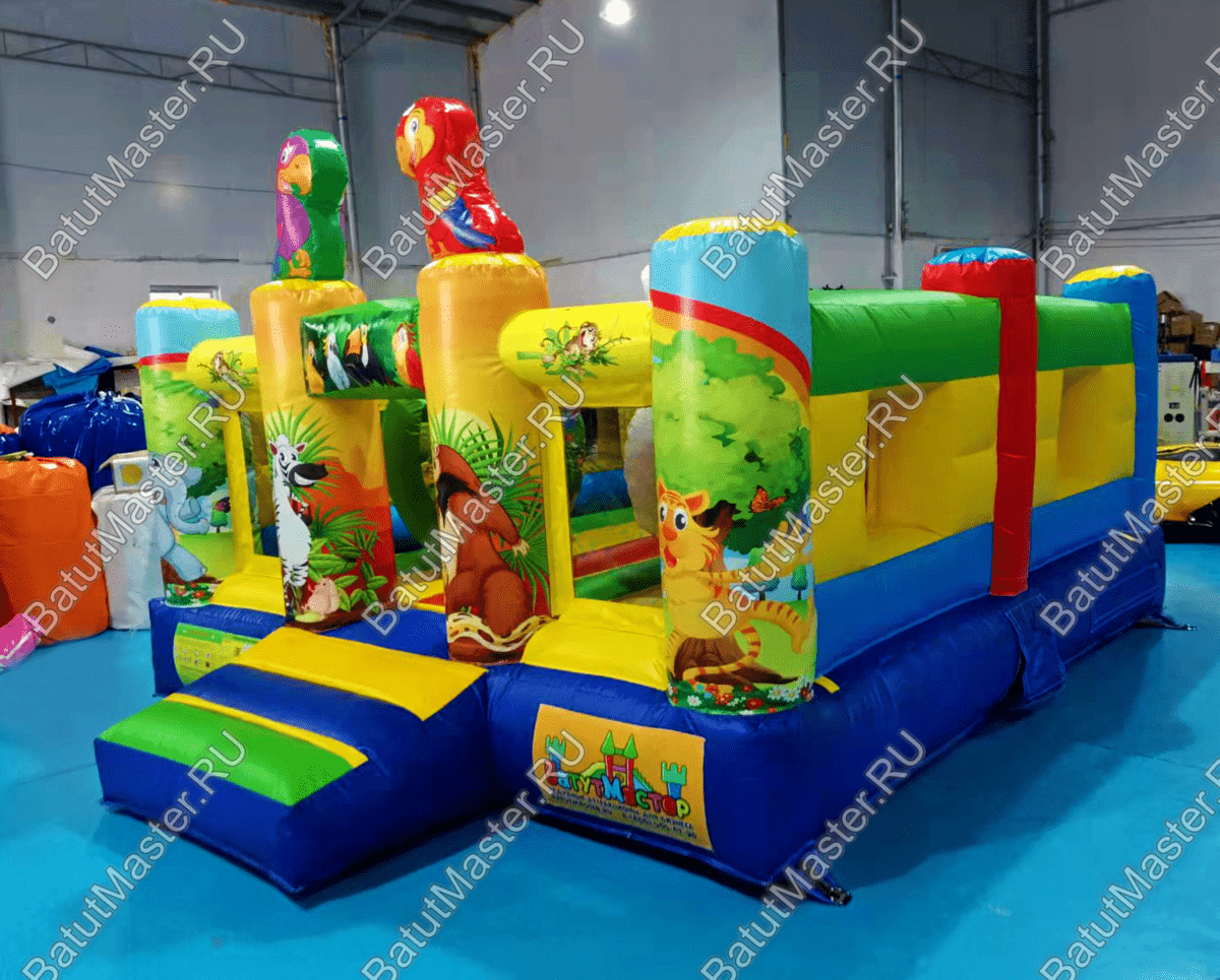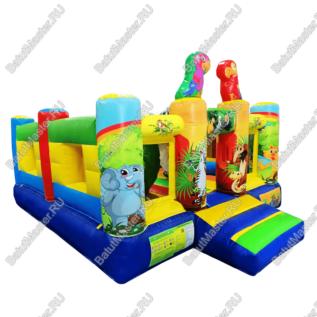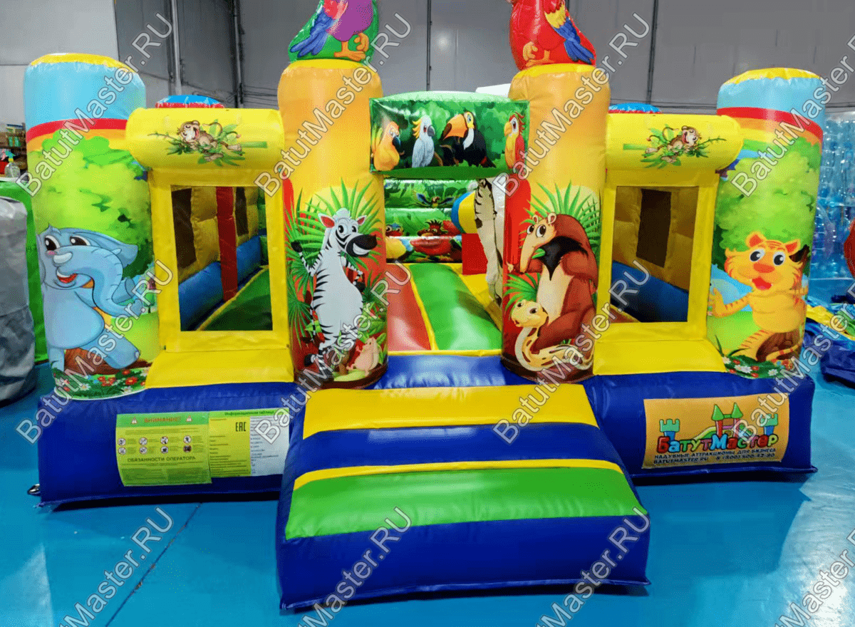 Яркий, красочный и невероятно привлекательный надувной батут "Попугайчики" — это универсальное решение для предпринимателей, стремящихся развивать бизнес в сфере детских развлечений. Он оформлен в тематике джунглей с мультяшными изображениями попугаев, слонов, зебр и других зверей. Батут не просто красив — он создан, чтобы приносить прибыль и дарить детям массу удовольствия!