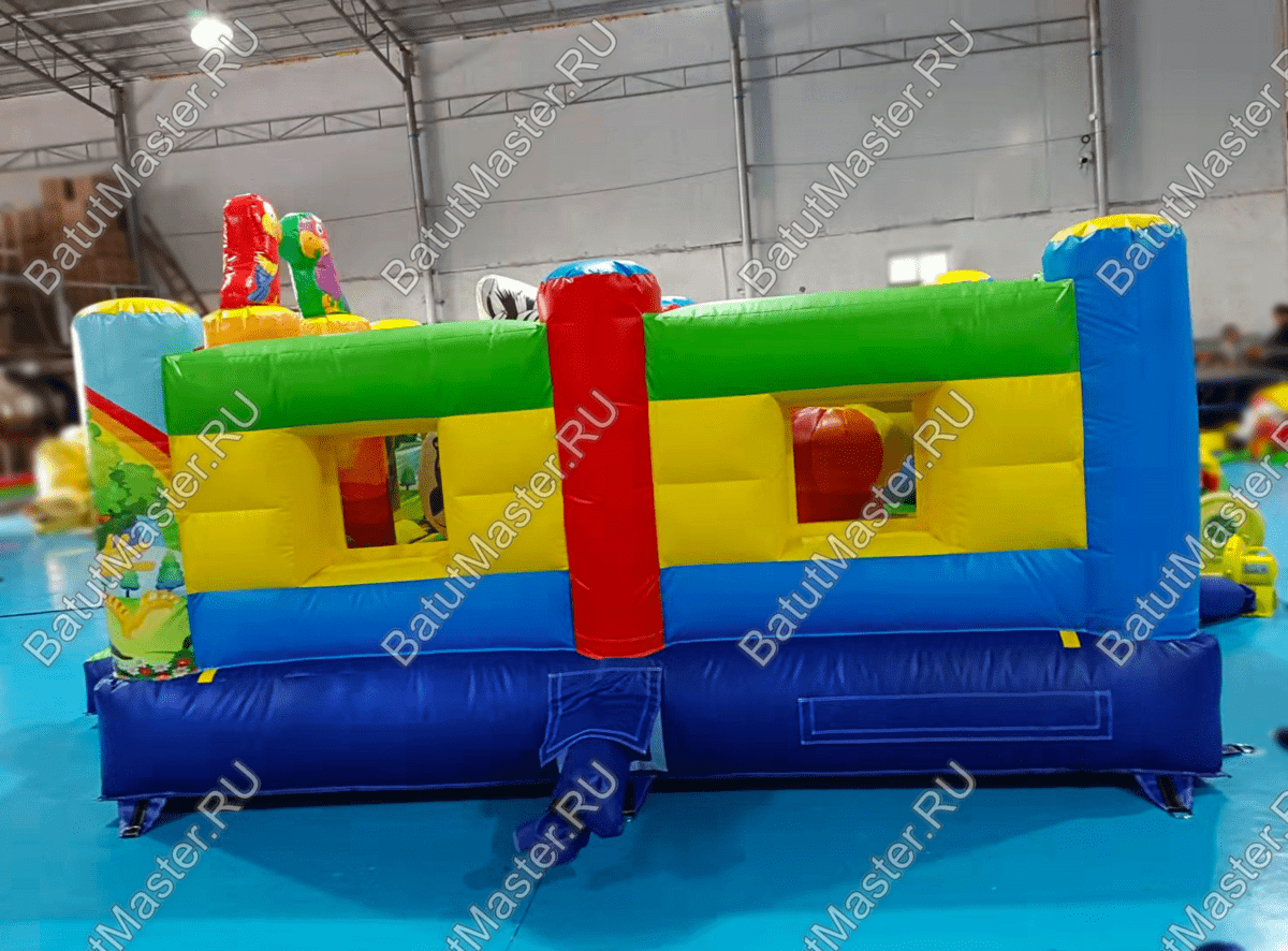 Размеры конструкции — 4x3.5x2.2 метра — позволяют удобно размещать батут как в помещении (торговые центры, спортзалы, выставки), так и на открытом воздухе (парки, школьные территории, лагеря и т.д.). Вместимость — до 4 детей одновременно.