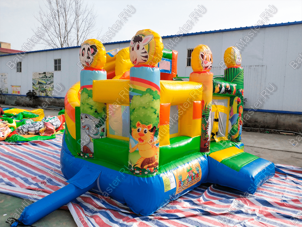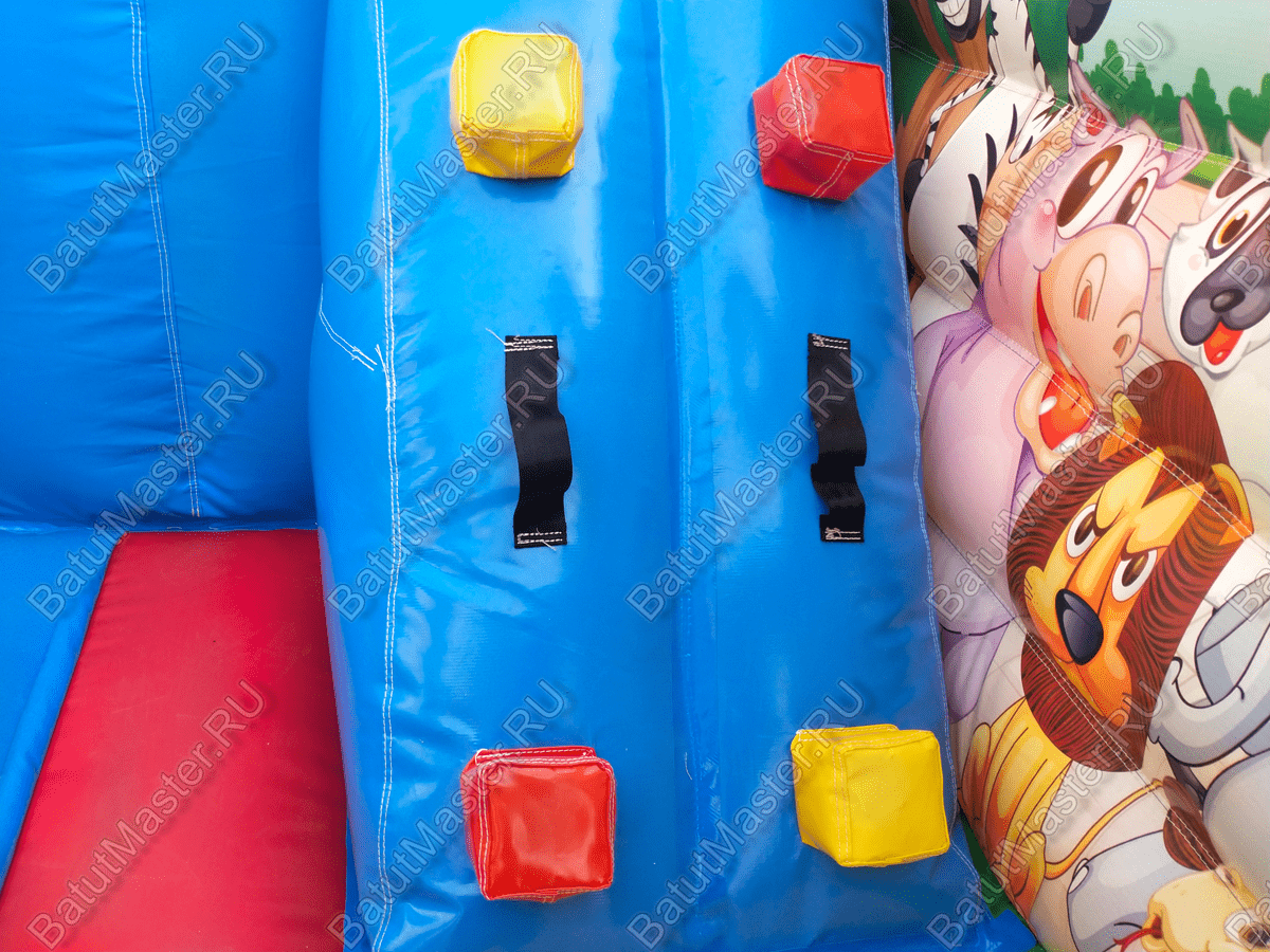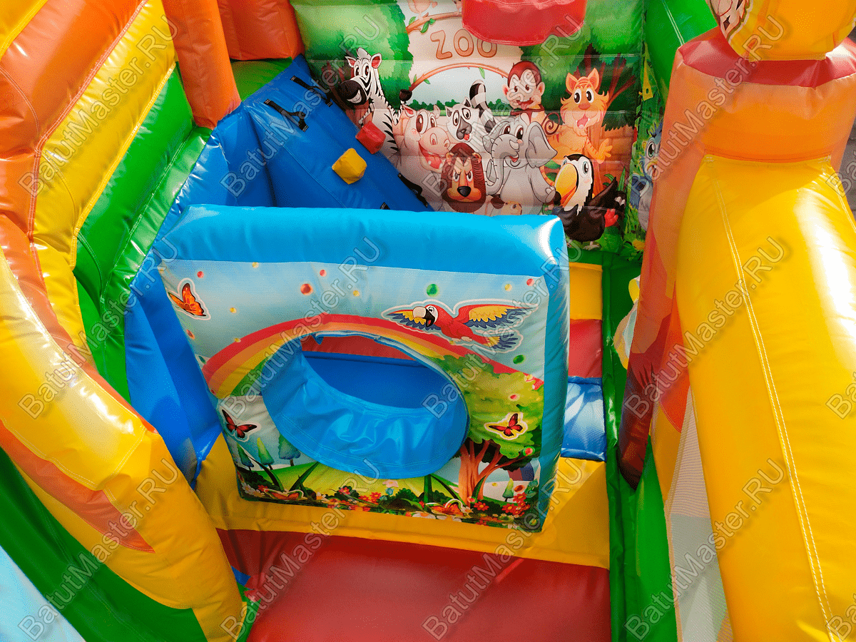 Детский батут «Попугайчики» выглядит как чудесный надувной замок, притягивает взгляды малышей и их родителей. Все использованные изображения животных и птиц – добрые, мультяшные и симпатичные, что благотворно влияет на развитие пространственного мышления и кругозора ребят младшей возрастной группы. Доступные развлечения представлены следующими элементами: