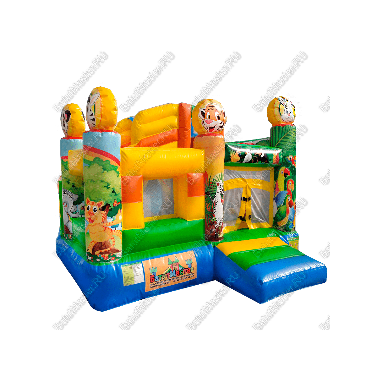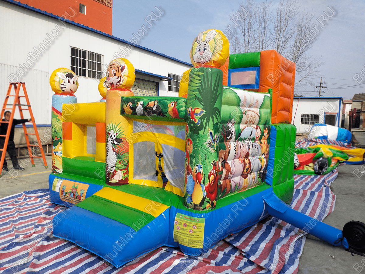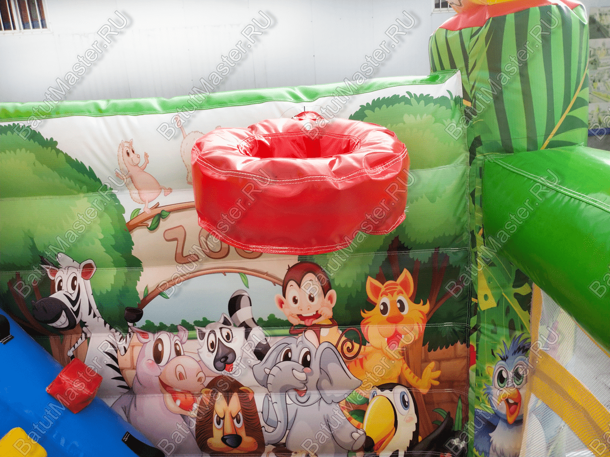 Детский батут «Попугайчики» выглядит как чудесный надувной замок, притягивает взгляды малышей и их родителей. Все использованные изображения животных и птиц – добрые, мультяшные и симпатичные, что благотворно влияет на развитие пространственного мышления и кругозора ребят младшей возрастной группы. Доступные развлечения представлены следующими элементами:
