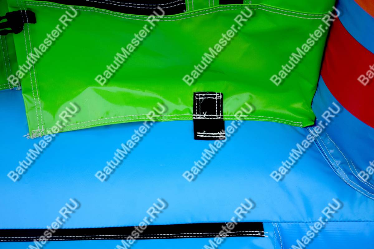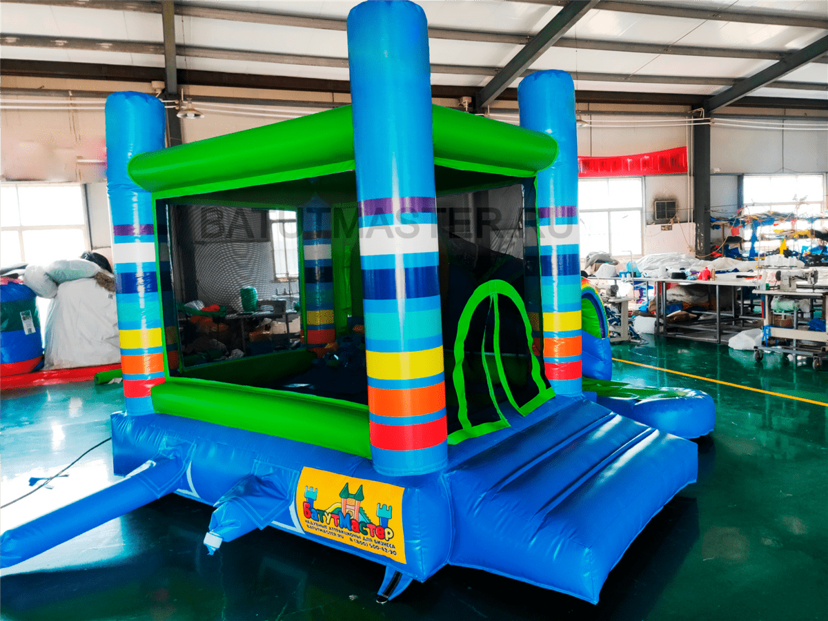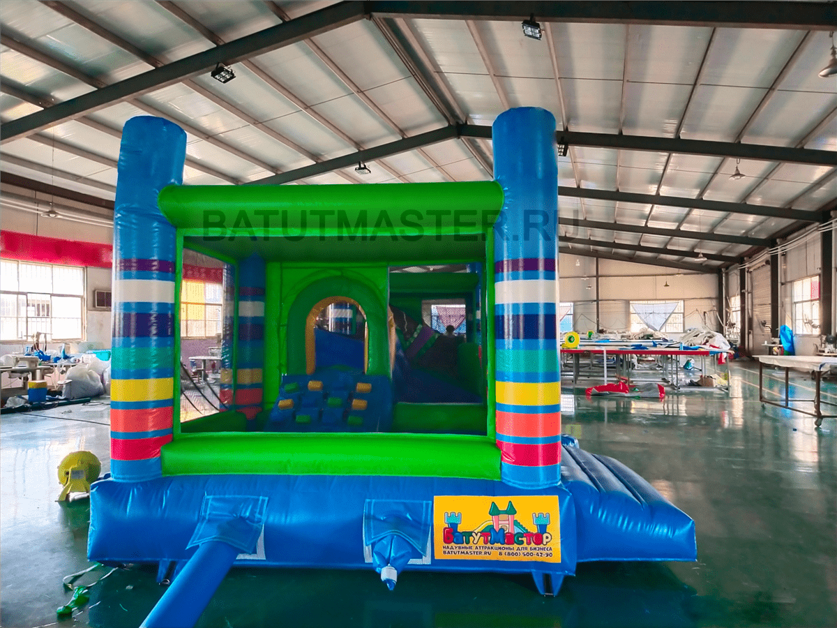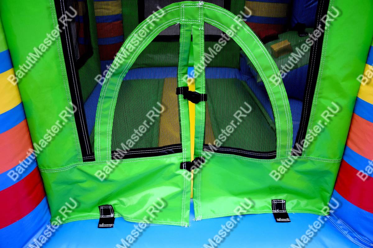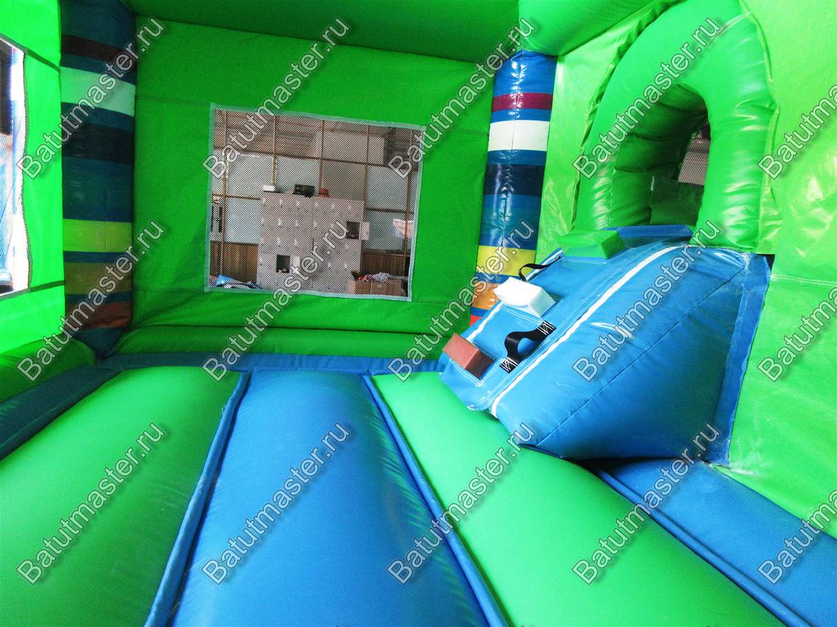 Вся нижняя надувная подушка синяя с верхним зеленым покрытием. Одна из сетчатых стен имеет интересную арку-лаз, через которую дети и проникают внутрь площадки. Вверху прямоугольной зоны все стены соединены зелеными надувными планками. Фронтальная стена имеет спуск с горки через радужную арку в сетке. Съезд выполнен с небольшим поворотом, арки разных цветов сверху горки придают особенного настроения. Батут уверенно можно назвать безопасным, а прозрачная сетка вместо стен позволяет наблюдать за игрой детей, небольшие бортики с двух сторон от горки не дают ребенку выпасть из аттракциона. Обе зоны дают возможность играть детям с разными интересами и в любом возрасте: смельчаки порезвятся с горки, робкие девочки будут играть на площадке.