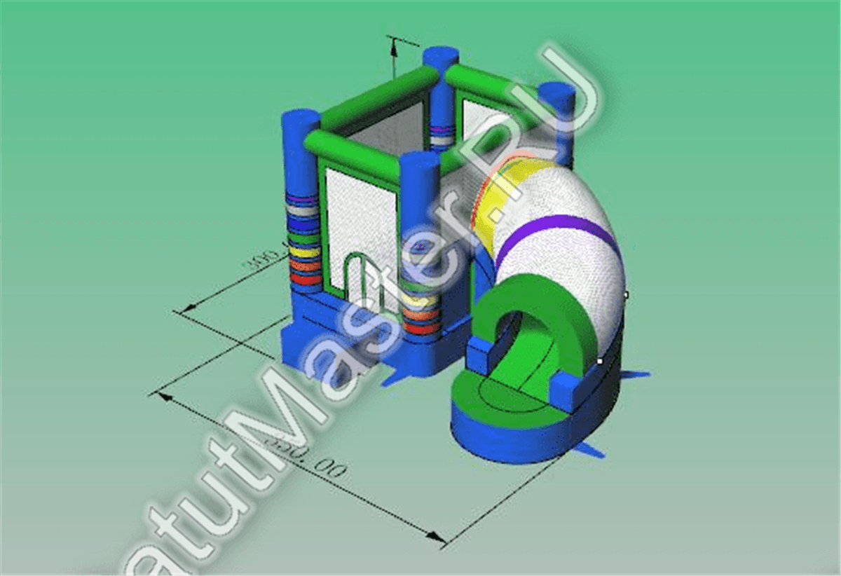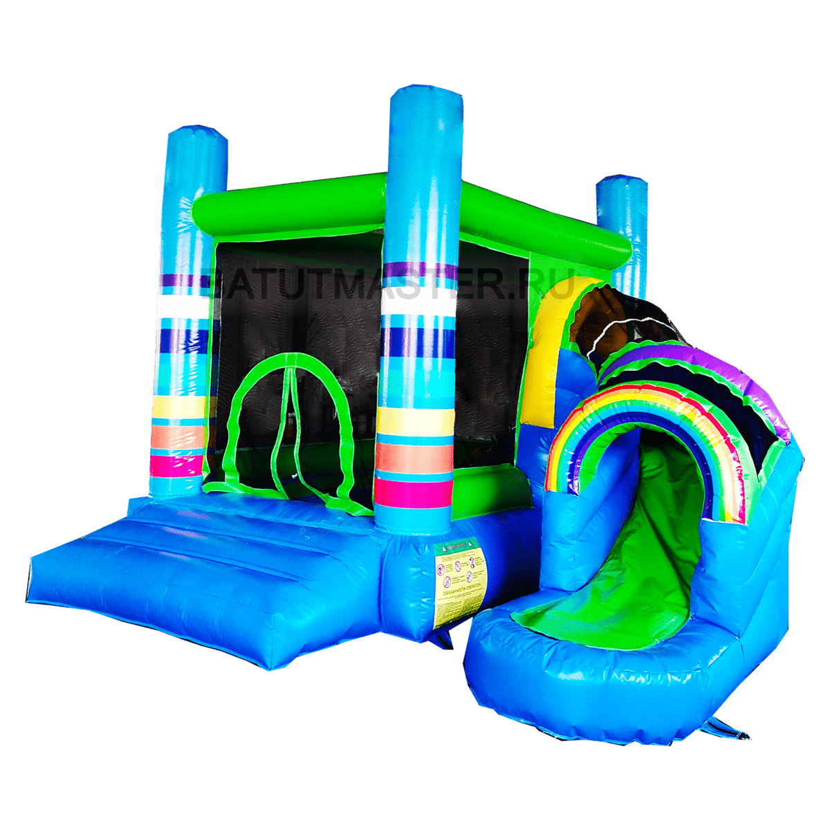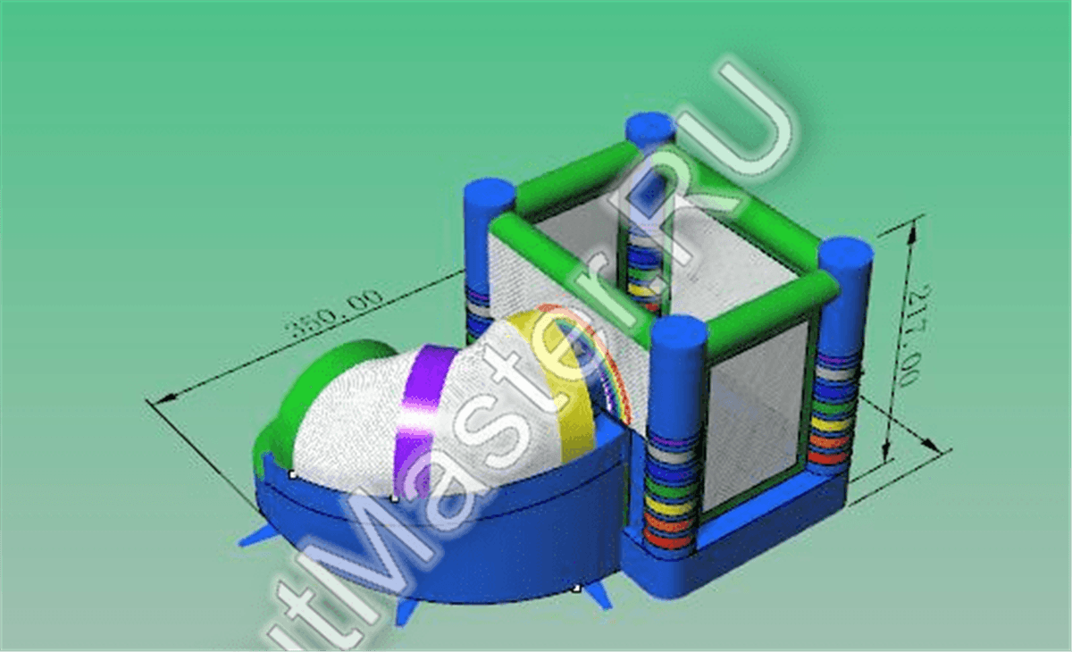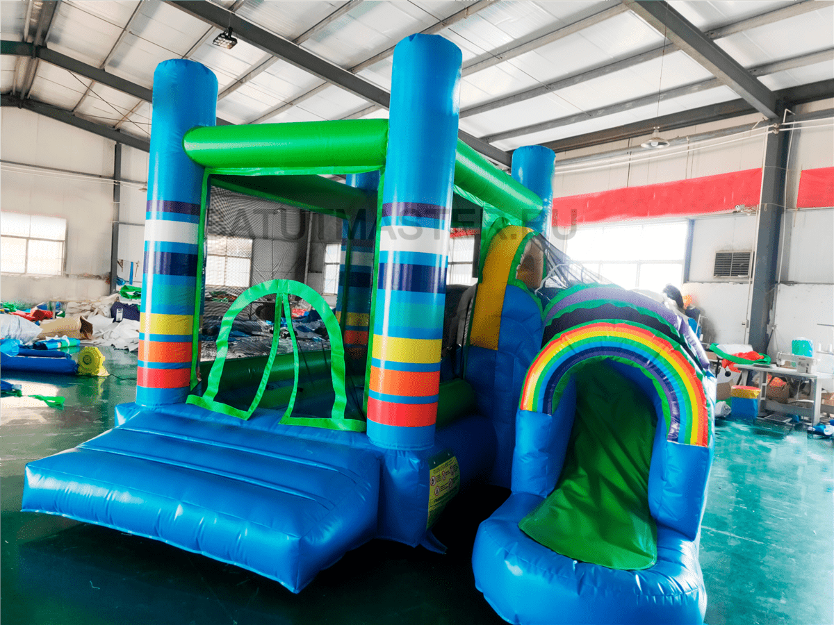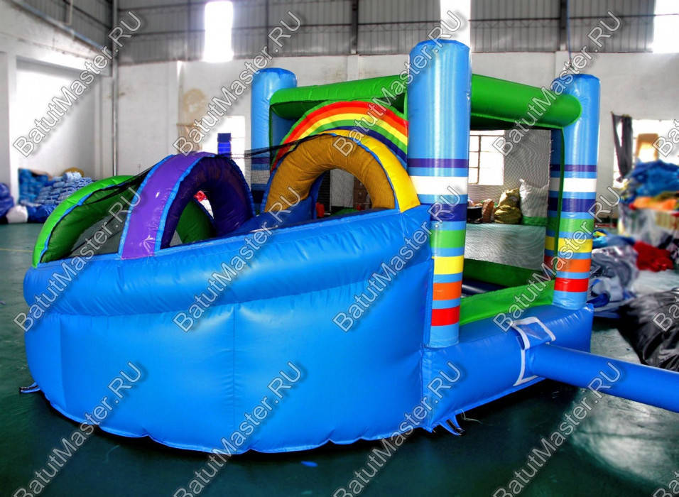 Вся нижняя надувная подушка синяя с верхним зеленым покрытием. Одна из сетчатых стен имеет интересную арку-лаз, через которую дети и проникают внутрь площадки. Вверху прямоугольной зоны все стены соединены зелеными надувными планками. Фронтальная стена имеет спуск с горки через радужную арку в сетке. Съезд выполнен с небольшим поворотом, арки разных цветов сверху горки придают особенного настроения. Батут уверенно можно назвать безопасным, а прозрачная сетка вместо стен позволяет наблюдать за игрой детей, небольшие бортики с двух сторон от горки не дают ребенку выпасть из аттракциона. Обе зоны дают возможность играть детям с разными интересами и в любом возрасте: смельчаки порезвятся с горки, робкие девочки будут играть на площадке.