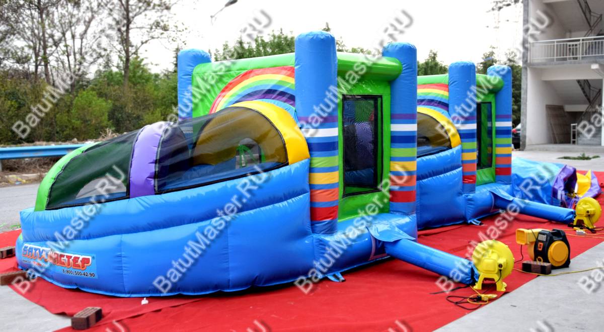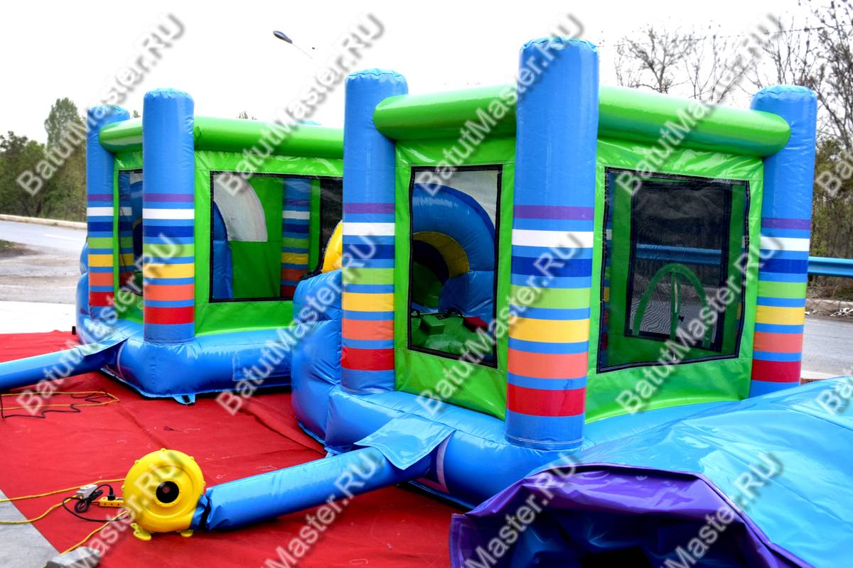 Интересный дизайн и высокий уровень безопасности соединились в этом многофункциональном батуте. Общая сине-зеленая окраска разбавлена разноцветными радужными арками и полосами на основаниях-колоннах. Конструкция разделена на две основные части: квадратную площадку, где сетка выступает в роли стен и забавную горку. Поэтому вместительности можно только позавидовать. Если это решение для бизнеса, то весьма удачное.