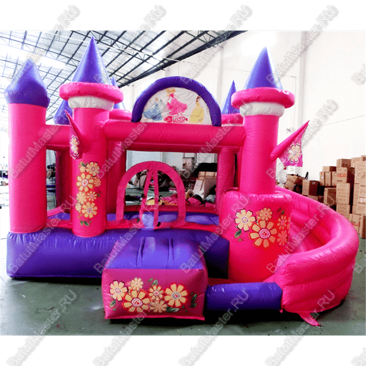 Коммерческий надувной батут «Розовый замок» - аттракцион для настоящих маленьких принцесс и юных принцев. Внешний вид этого аттракциона очень привлекателен, и силуэт островерхих башен замка узнают все любители диснеевских мультиков. Над воротами даже красуется изображение с популярными принцессами из «Диснея».
