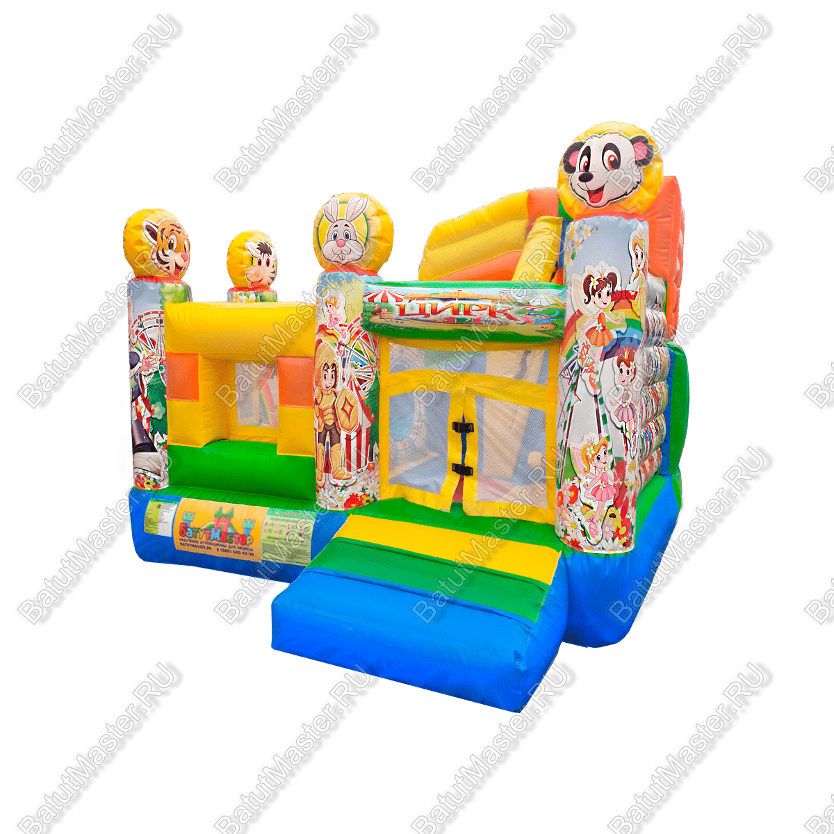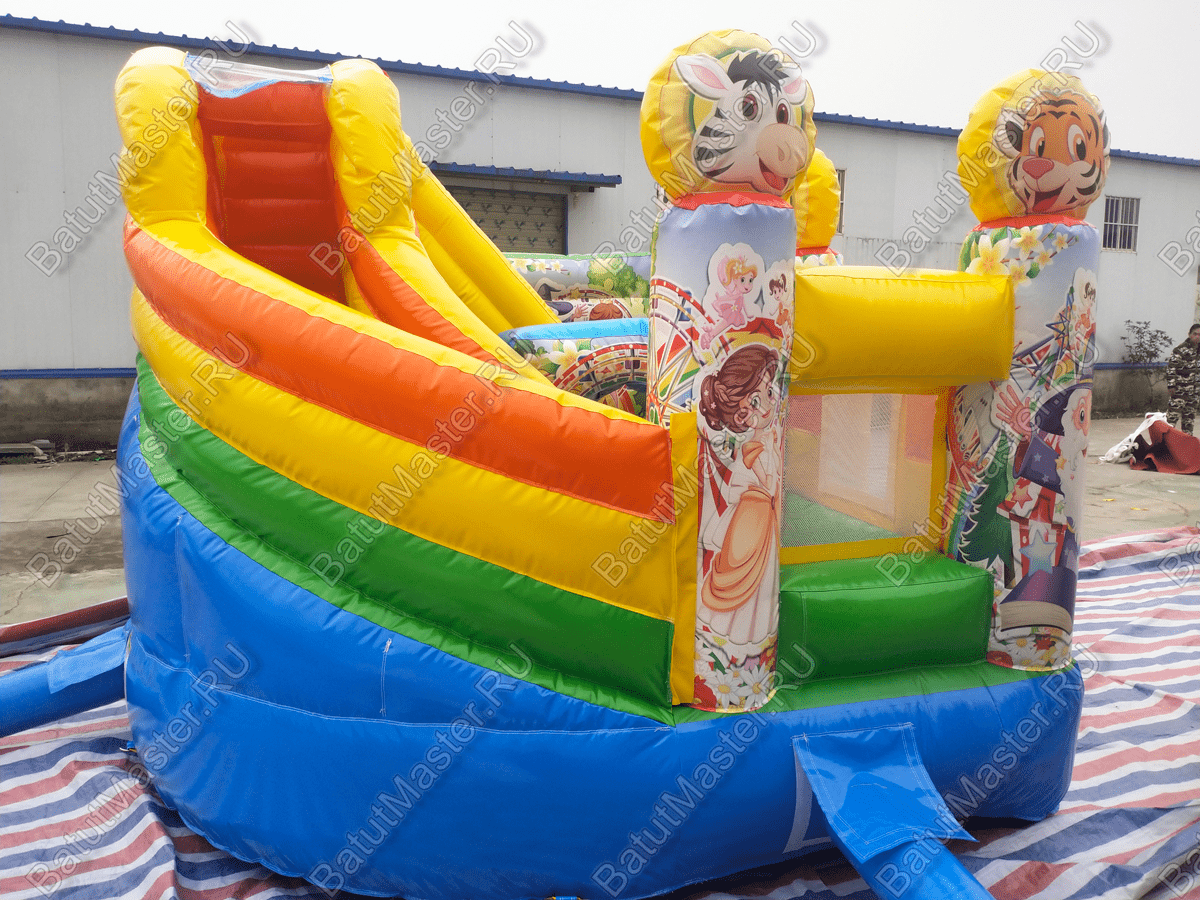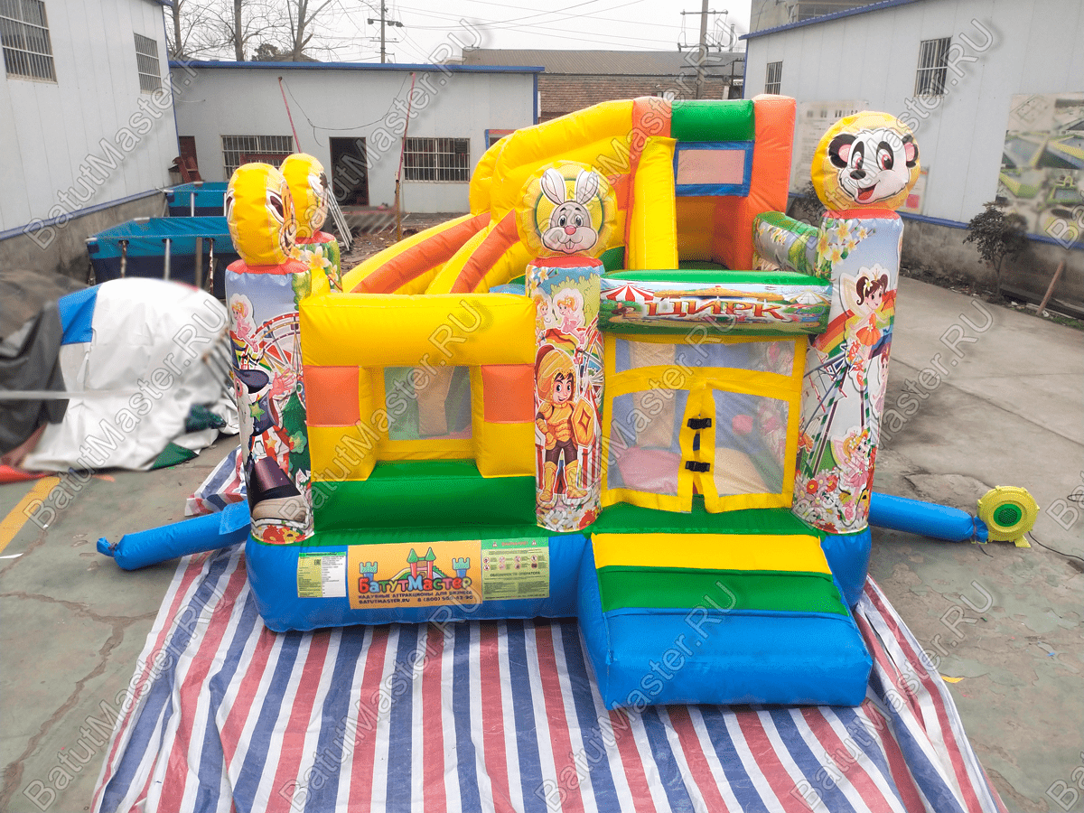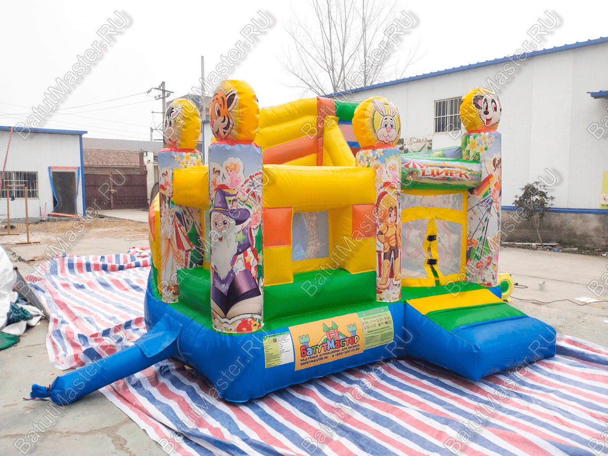 Компактный батут «Русский цирк» для бизнеса, переносит посетителей в атмосферу праздничного веселья. Яркие светлые цвета, надувные персонажи мультиков и забавные звери встречают детей на входе. Внутри их ожидают детские скаты, надувные формы для игр и декоративные элементы, и самое главное простор для высоких прыжков.