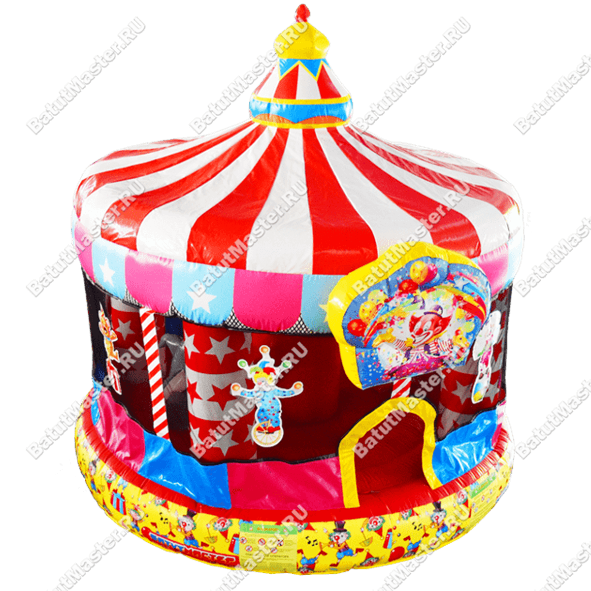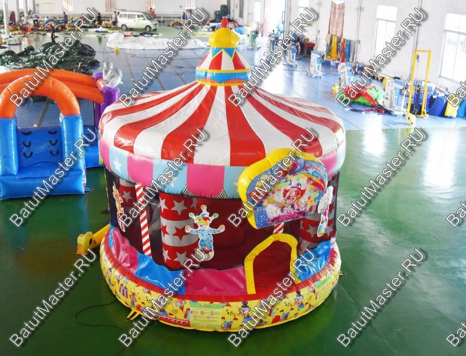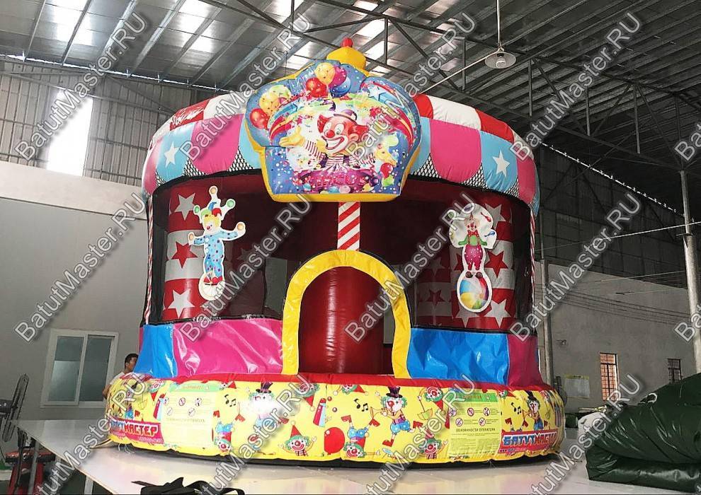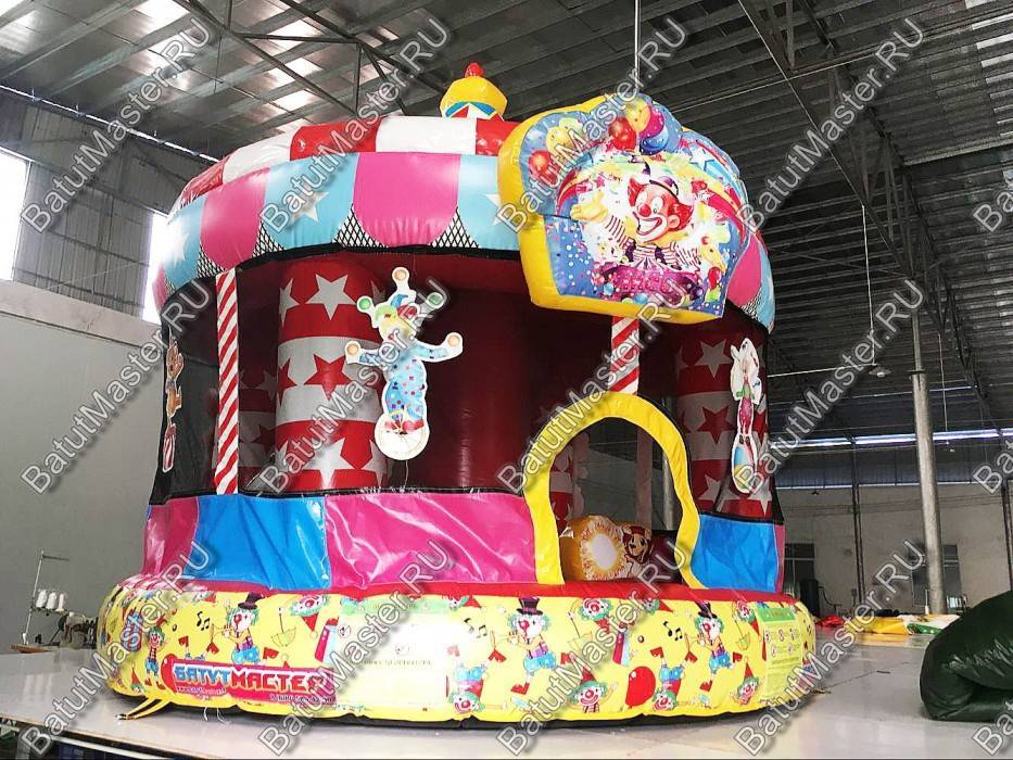 Если сравнить детские развлечения по уровню уникальности, то батуты и цирк занимают одни из самых первых мест в рейтинге популярности. Сложно представить, какой восторг вызовет аттракцион из ПВХ в виде надувного батута и цирка шапито одновременно. Представленный батут для бизнеса выполнен как раз в таком дизайне. При этом его расцветка полностью совпадает со стилем конструкции – красно-белые сектора и яркая башня на самом верху с добавлением синего и желтого. В аттракционе многие элементы украшены тематическими изображениями, то есть нижняя желтая лента вся в клоунах, сетка украшена изображениями различных цирковых персонажей и над входом в виде арки – популярное представление клоуна с конфетти, шарами и звездами.