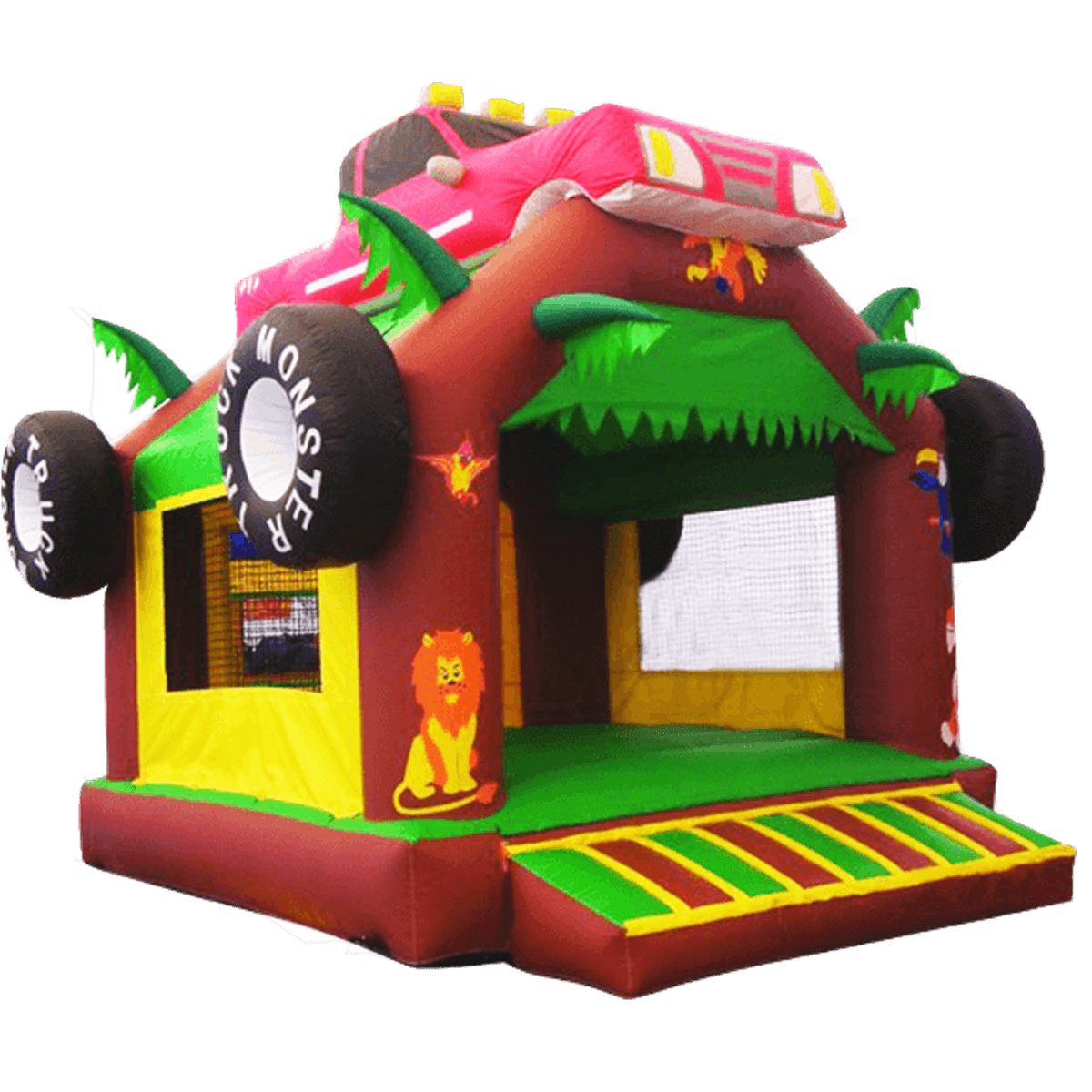 Красочная площадка с большим открытым входом, позволяющим беспрепятственно покидать аттракцион и вновь забираться внутрь сразу нескольким малышам. Этому способствует и широкая разноцветная ступенька. Крышей является малиновый автомобиль, удобно устроившийся наверху, среди необычных зеленых ветвей и листьев, свесив колеса на боковые стены. Входная арка коричневого цвета имитирует ствол дерева и расписана фигурками жителей тропического леса. Боковые желтые стены батута натянуты между дугами по углам площадки, имеют окошки, затянутые сеткой в тон. На площадке есть возможность выбрать разную тематику игр: в прятки, латки, прыжки, обживать ее, как настоящий маленький дом.