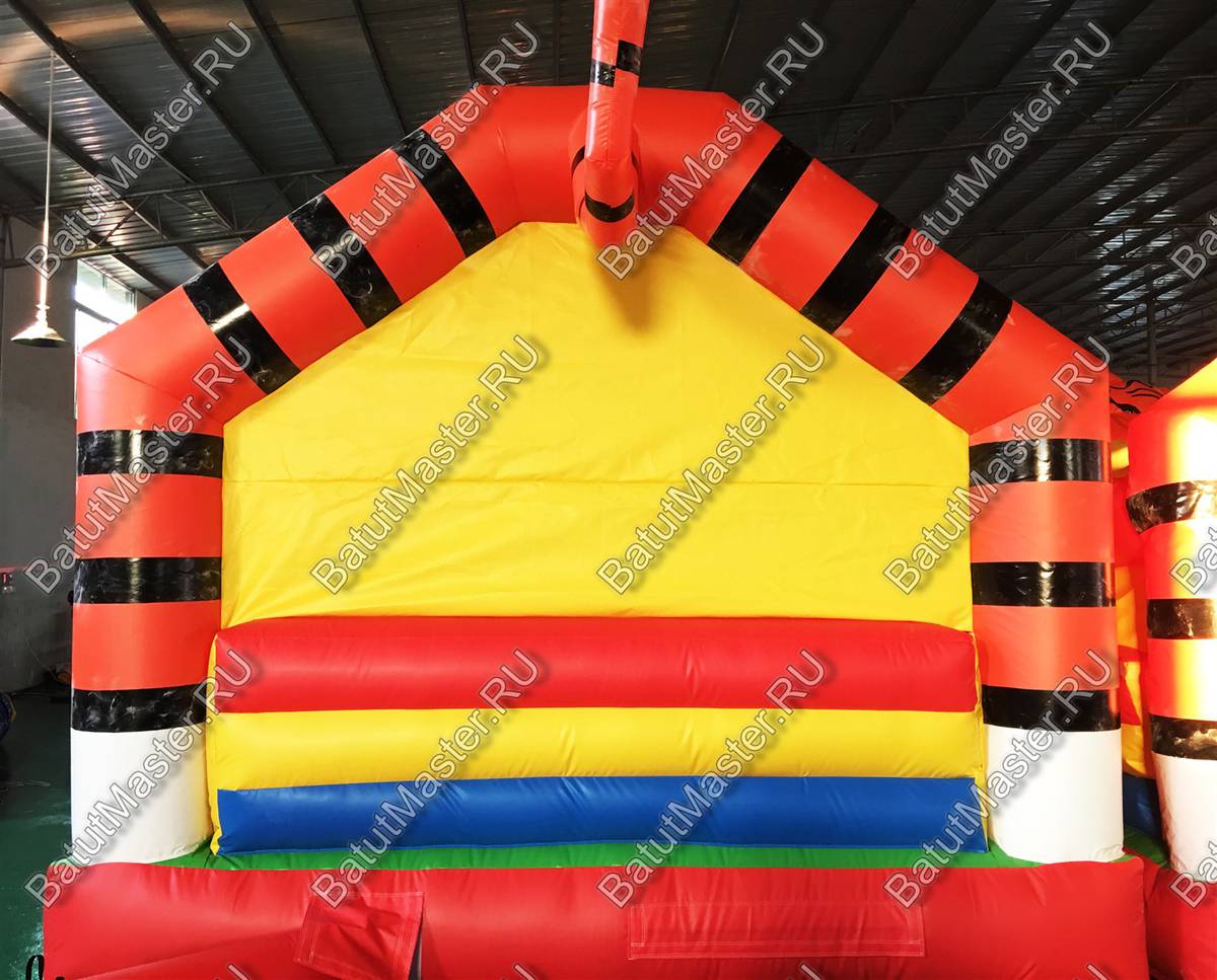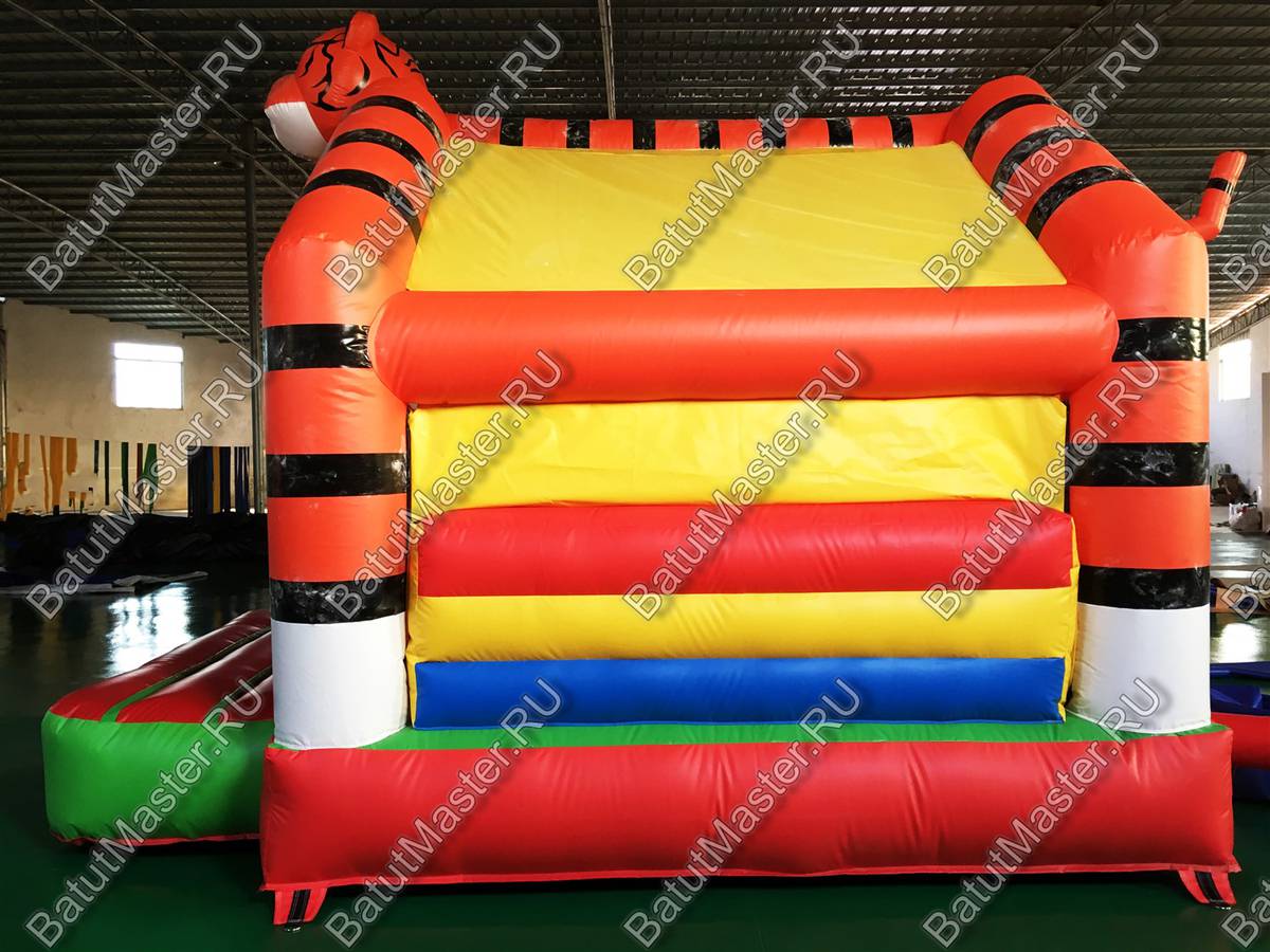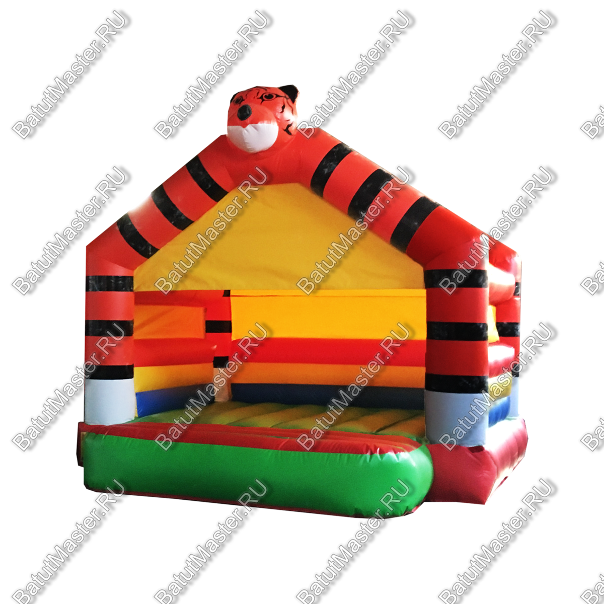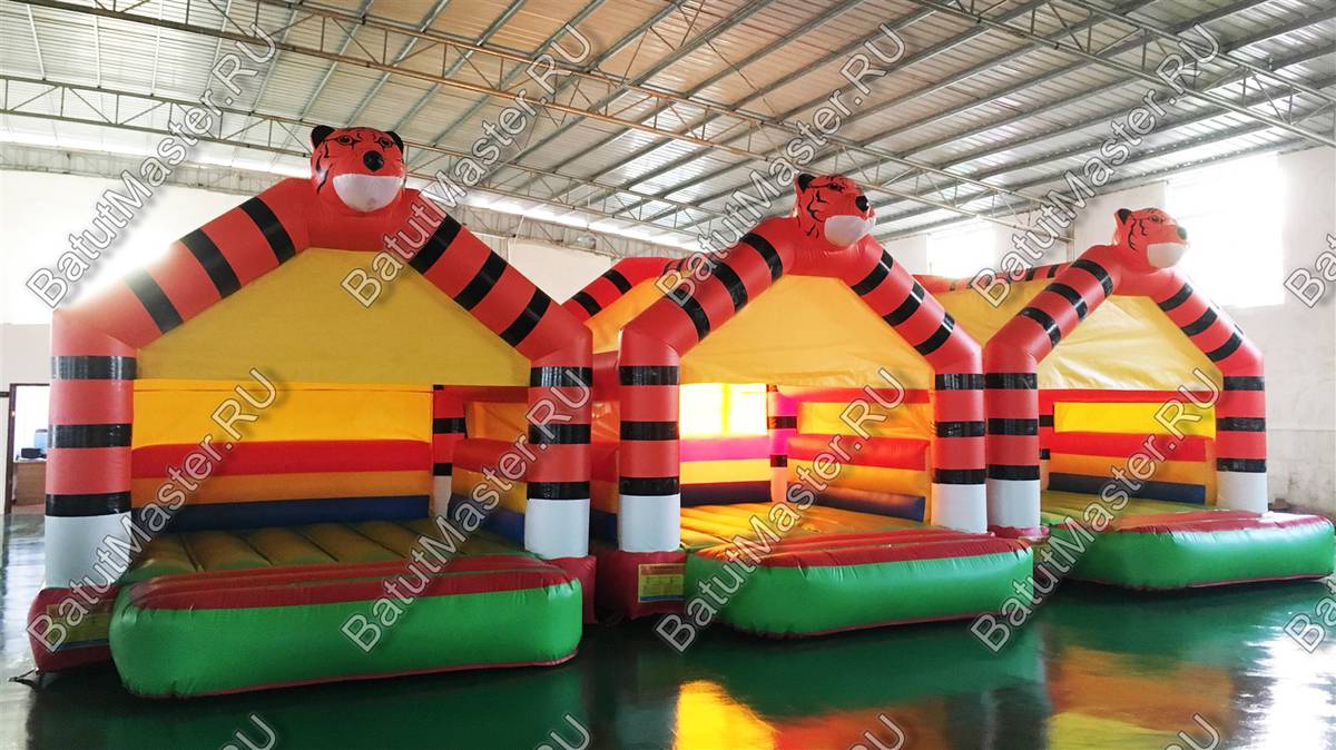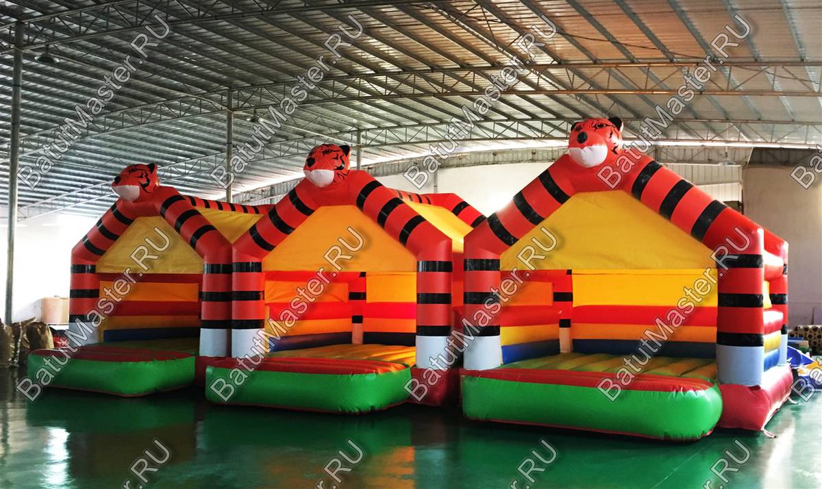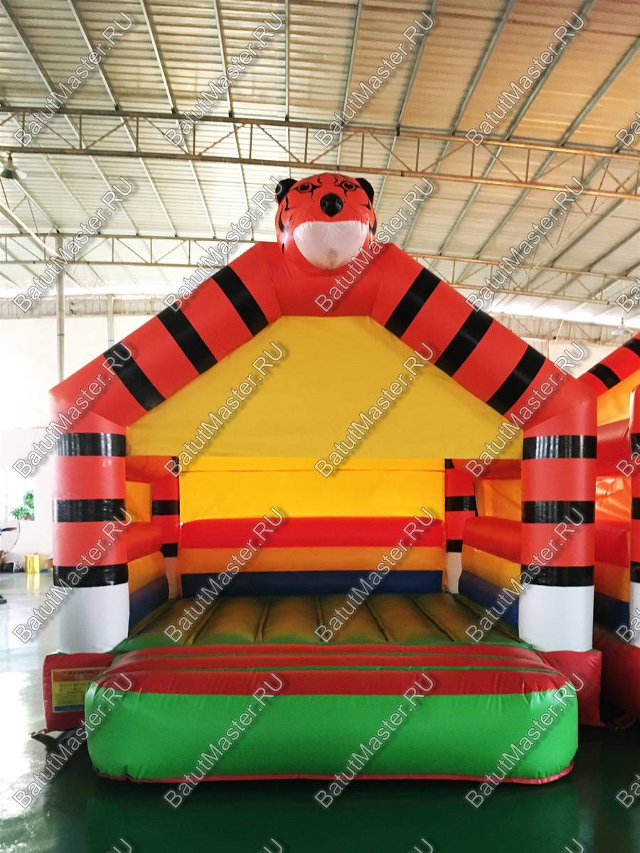 Надувной батут сделан в ярком сочном оранжевом цвете с черными полосами, имитирующими окраску тигра. Наверху размещена забавная голова главного героя. Многие предприниматели для ведения своего бизнеса ставят такие изделия в тех местах, где много детей.
