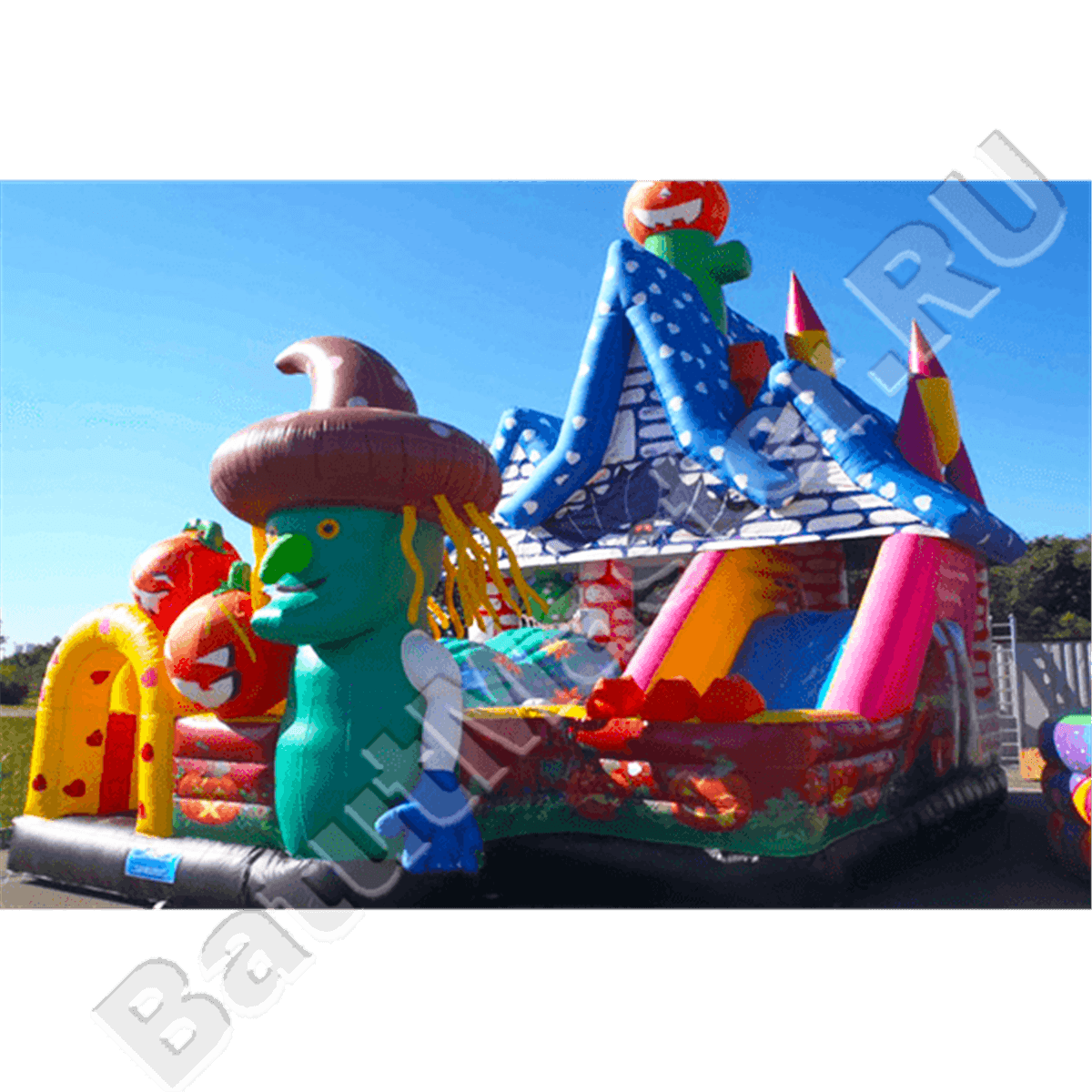 Вход внутрь развлекательного комплекса оформлен в виде арки, украшенной надувными тыквами. С другого угла изделия малышей приветствует большая надувная фигурка сказочной ведьмы в волшебном колпаке. Передние борта имеют не очень большую высоту, однако их достаточно, чтобы предотвратить выпадение малышей во время активных игр.