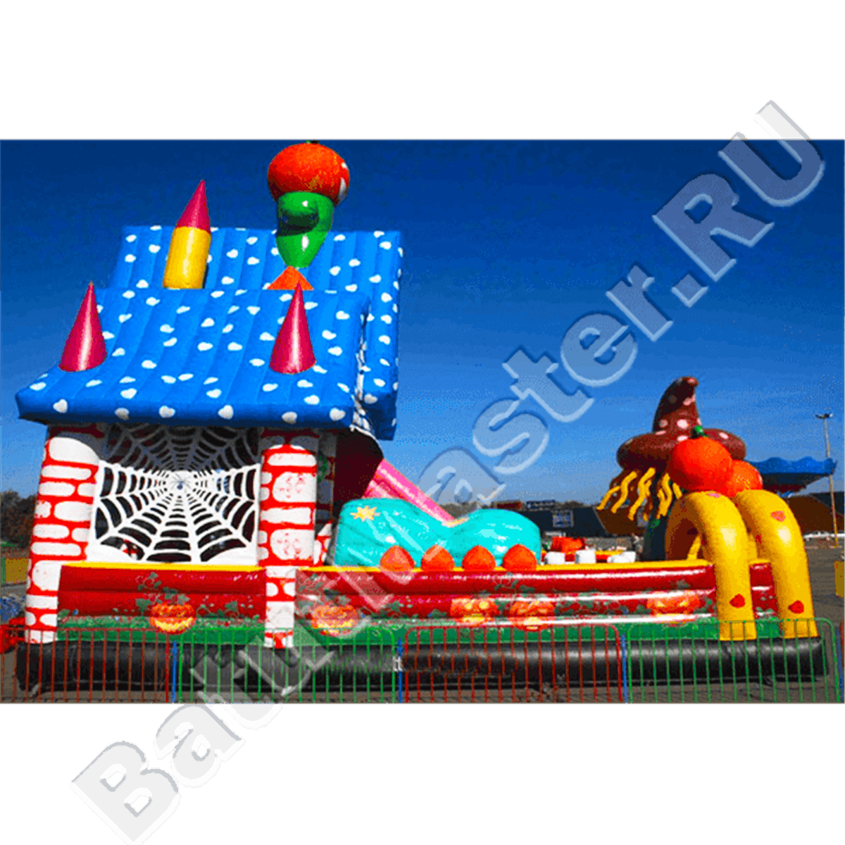 Поскольку этот батут разработан для улицы, большая его часть закрыта навесами. По центру имеется своеобразный домик с открытой передней стенкой, боковые стороны домика оформлены в стиле паутины, что позволяет проветривать помещение. Крыша украшена яркими разноцветными конусами и надувной тыквой.